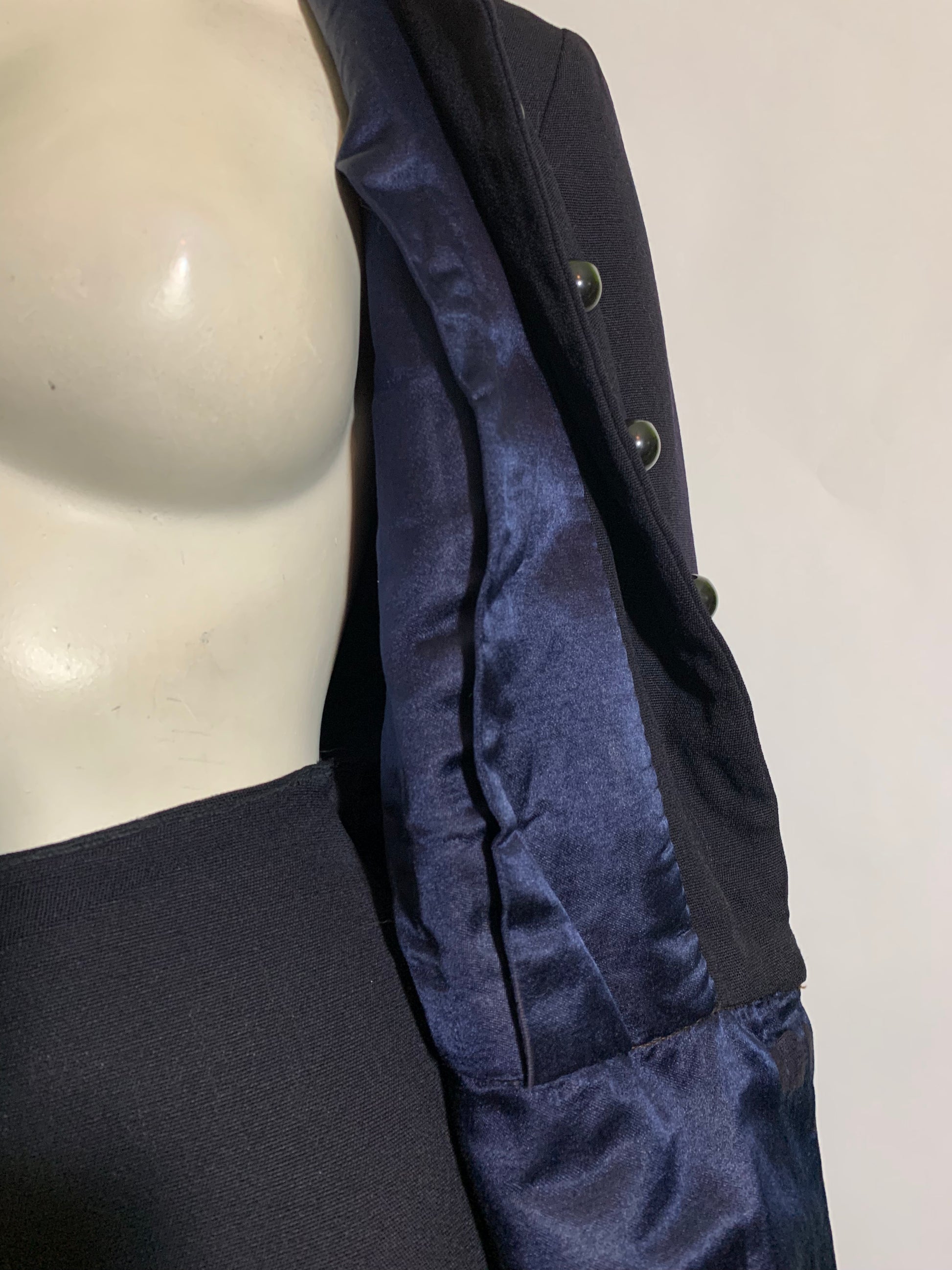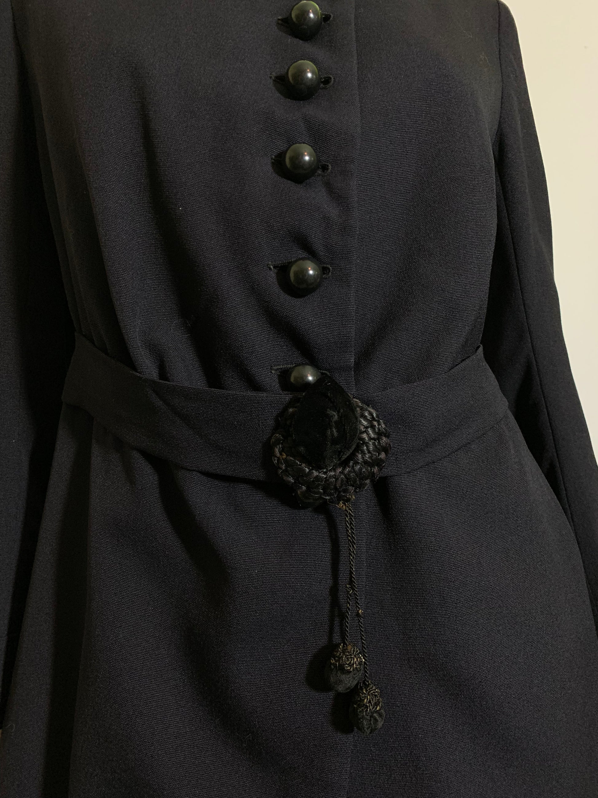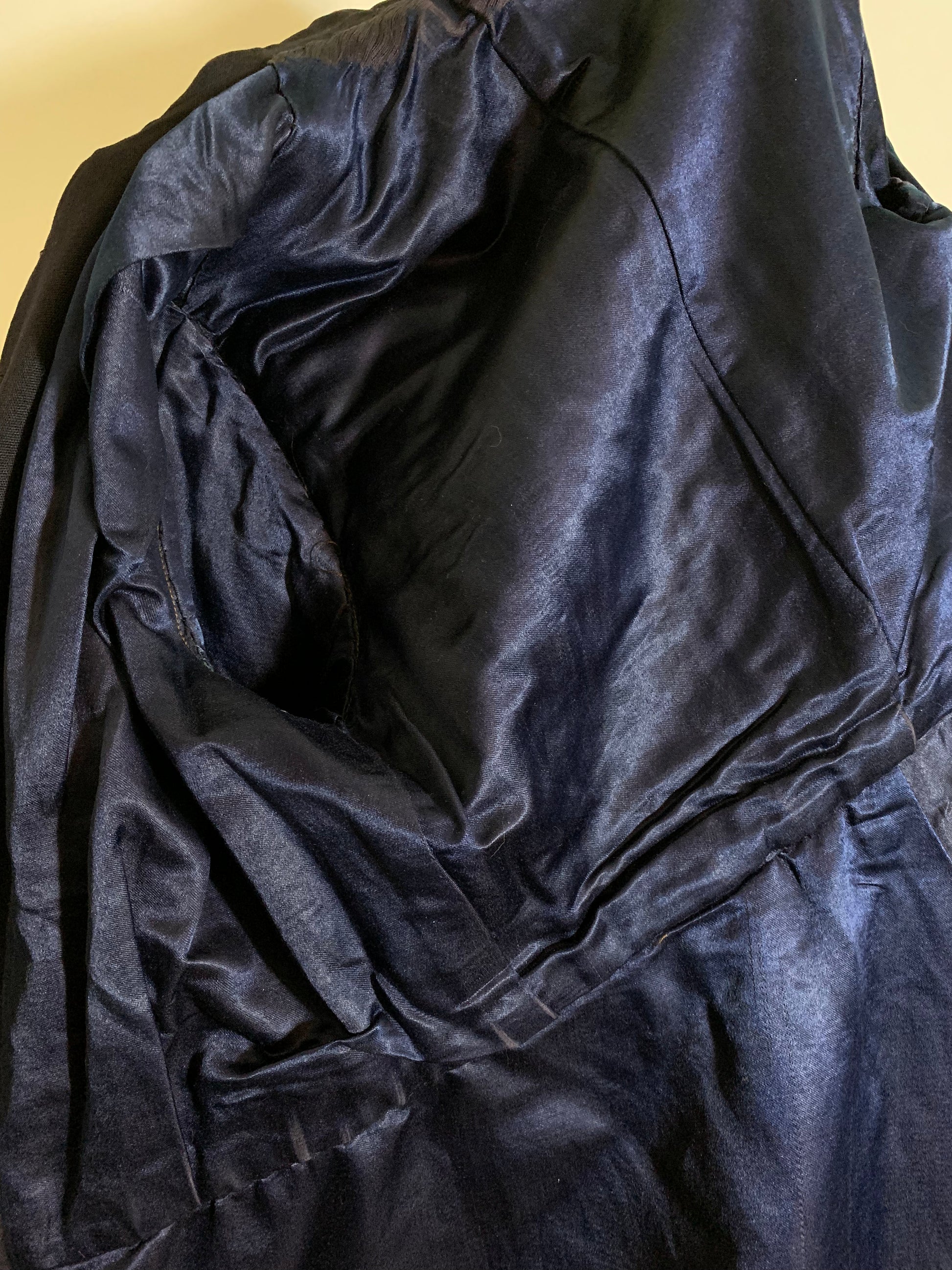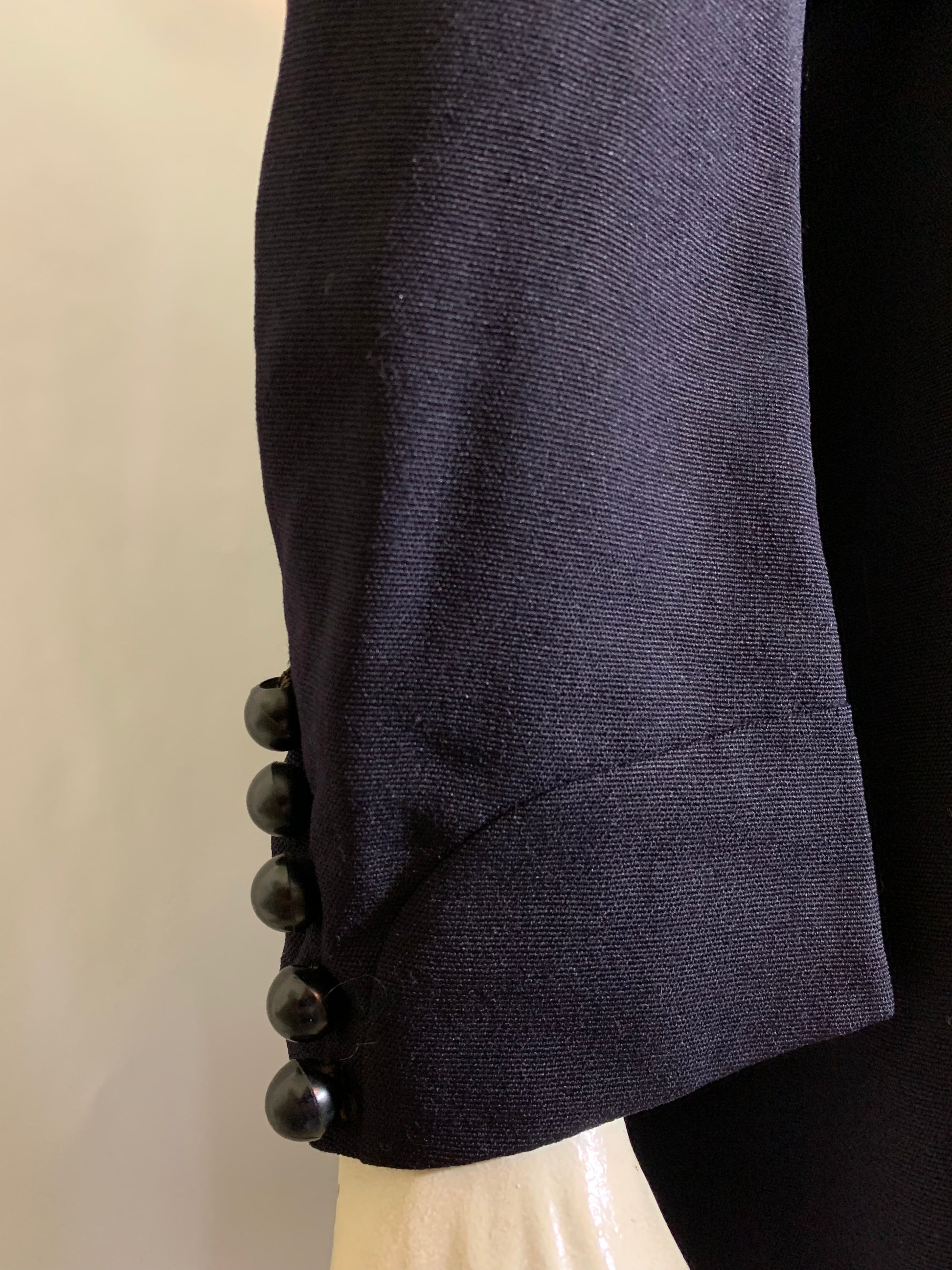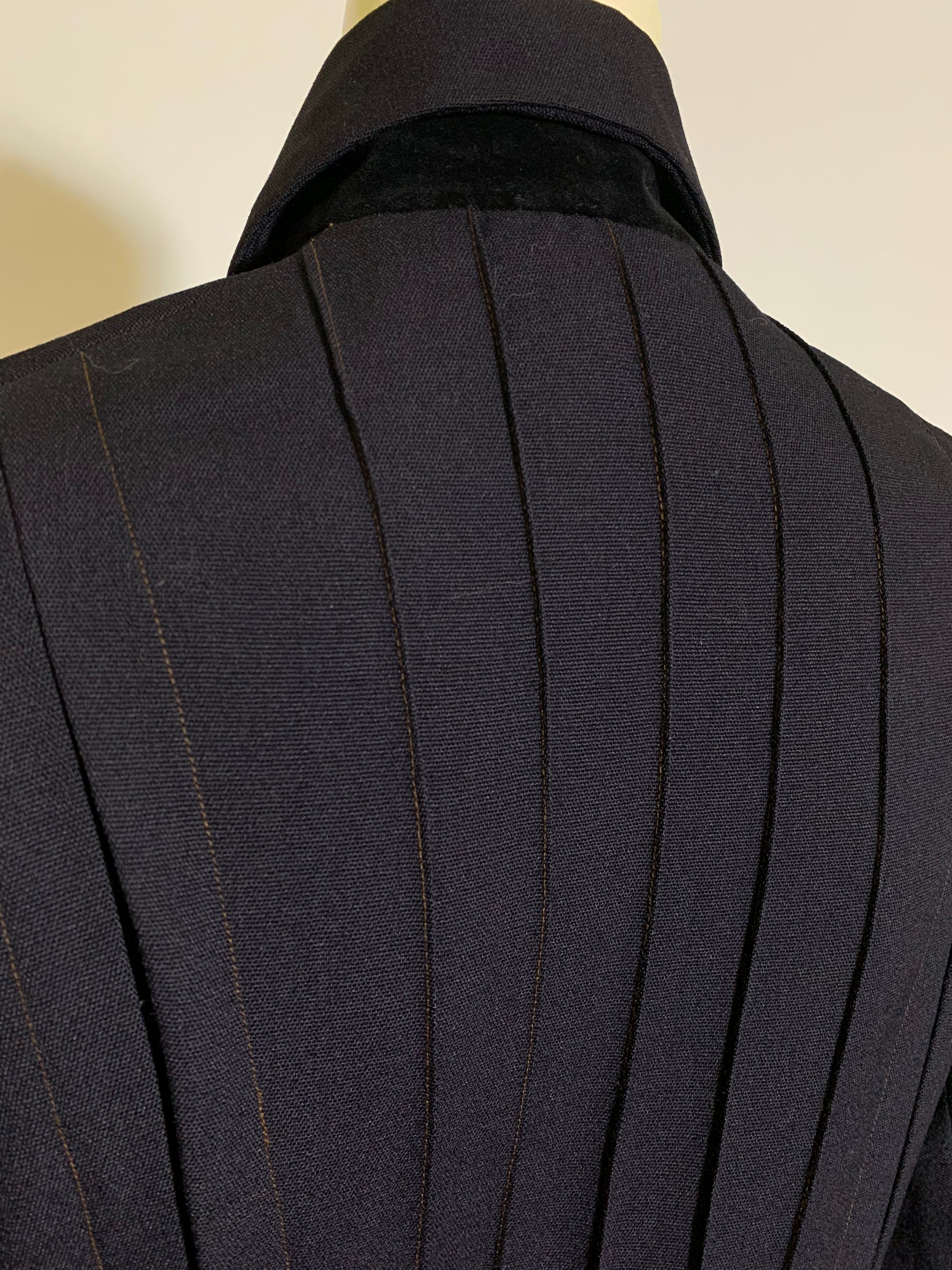 Top stitched seaming down back, more velvet and silk accents on back of sash- ball buttons on sleeve cuffs. Jacket is lined in matching silk. No label- flawless, sturdy and wearable!