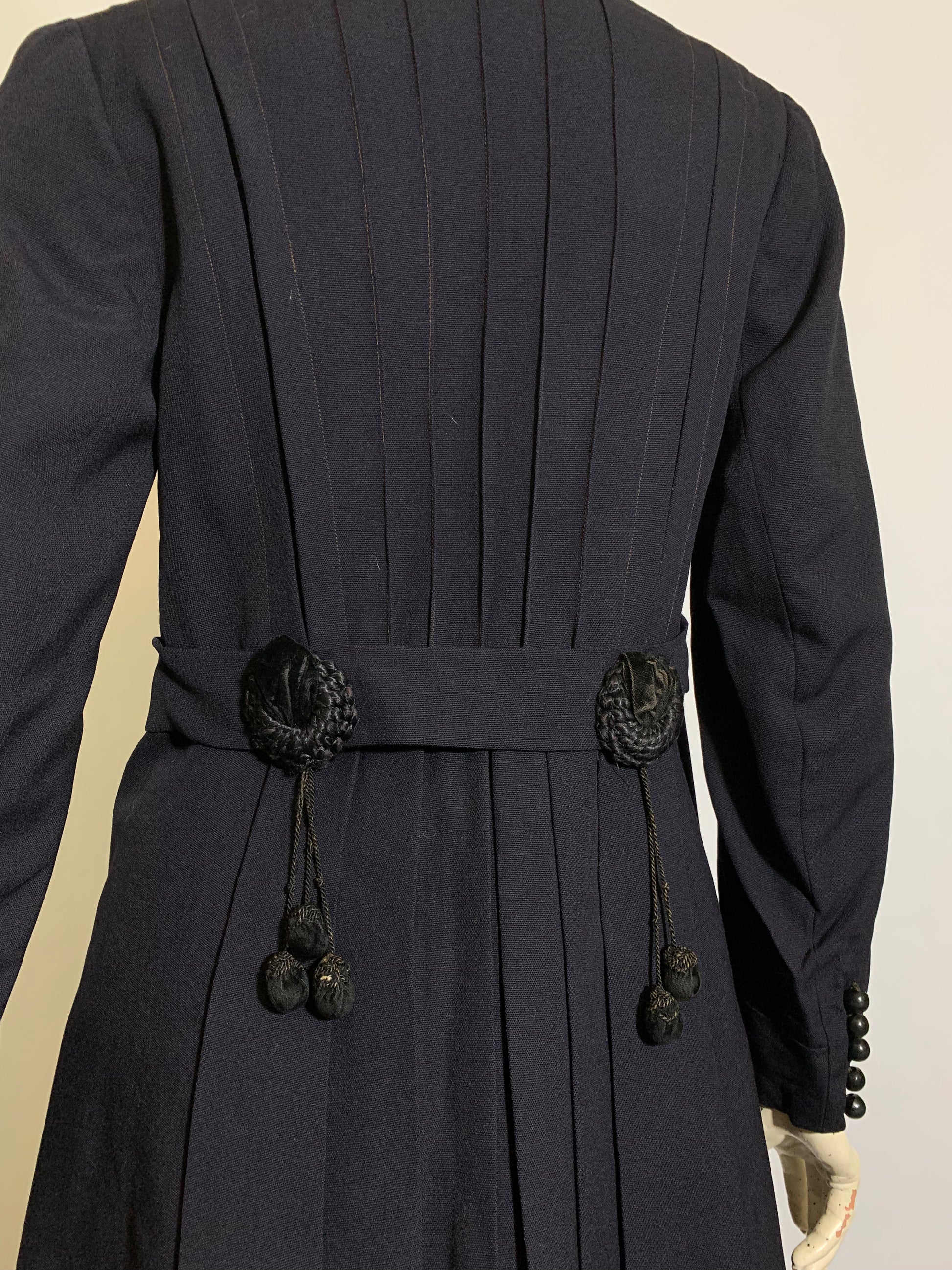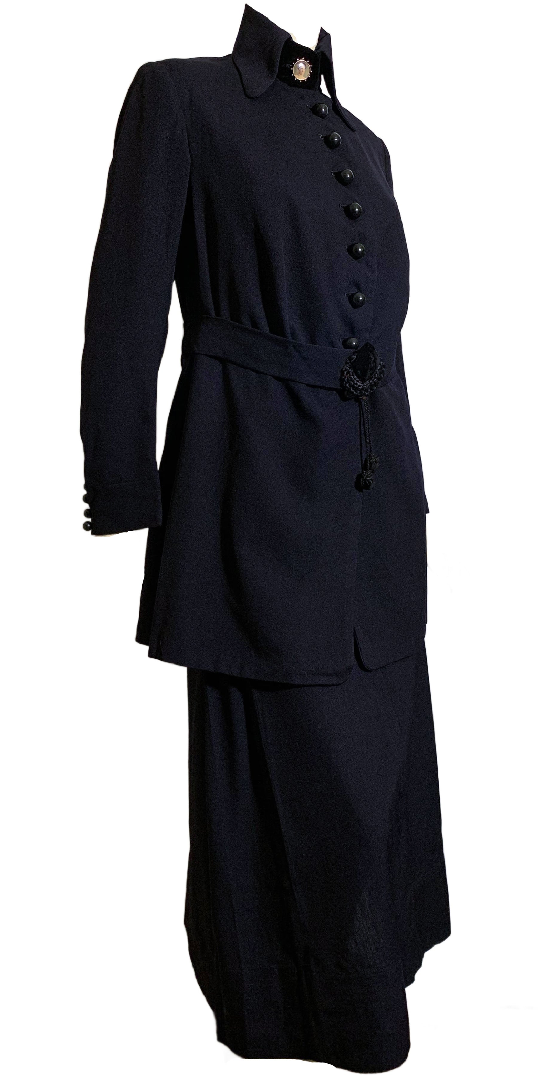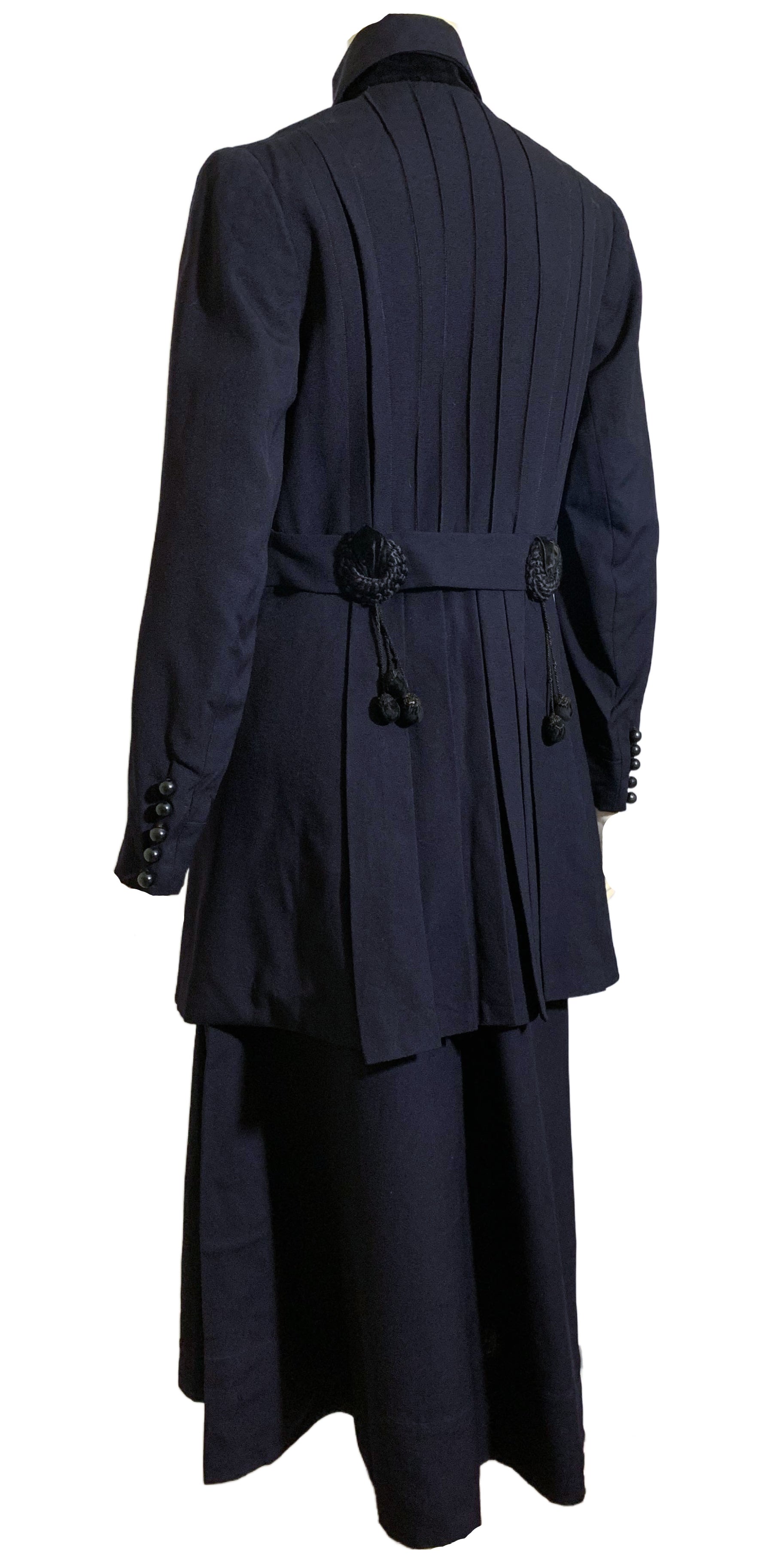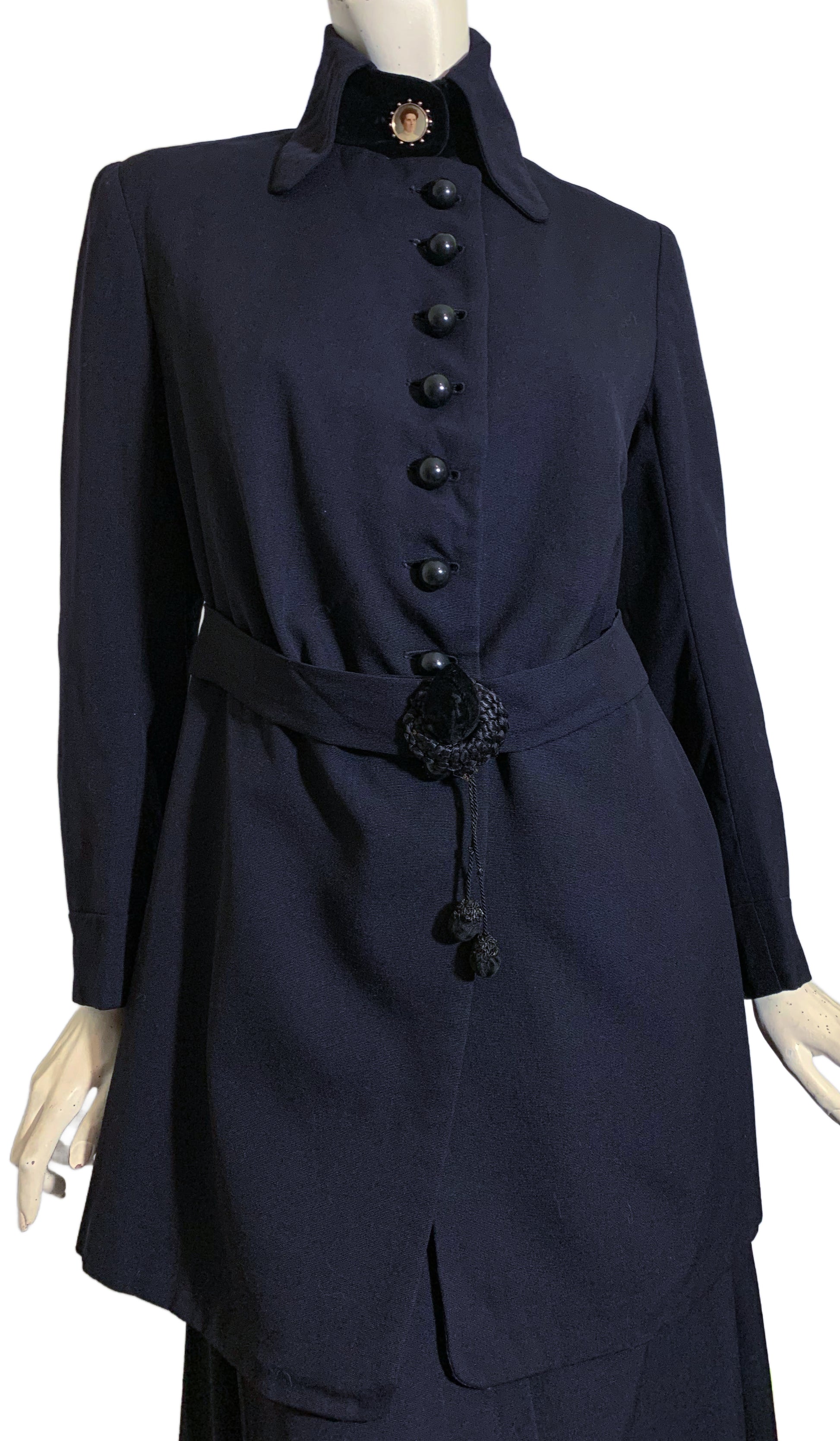 An amazing example of 1910s fashion often seen worn by Suffragettes in film and photos. Deep blue wool walking suit made up of long jacket and above ankle length skirt. Skirt has side metal hook and eyes and snaps, single pleat off to each side on front. Unlined. Jacket is mid thigh length, has attached sash with velvet and silk braided accent boasting 2 little dangling acorn ornaments. Large glass ball buttons. Velvet and wool high collar with rounded long lapel, button hole but no button- I used a period correct mourning brooch as a button (it fit perfectly though the opening!)- brooch available on the site here.