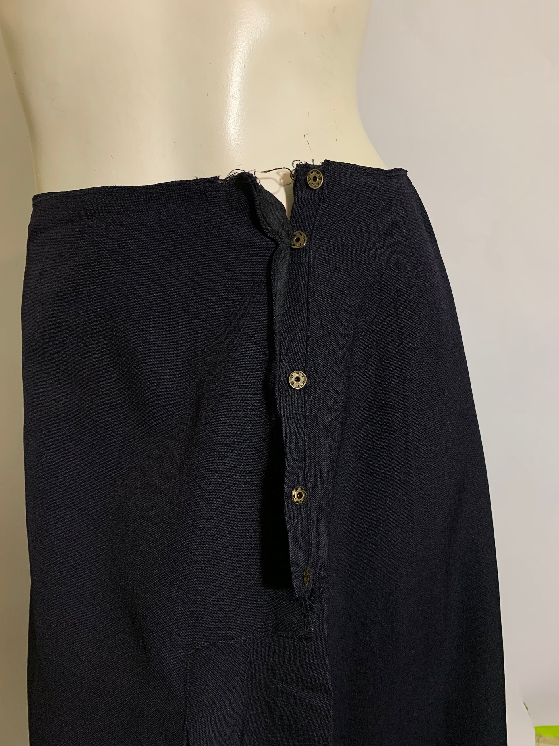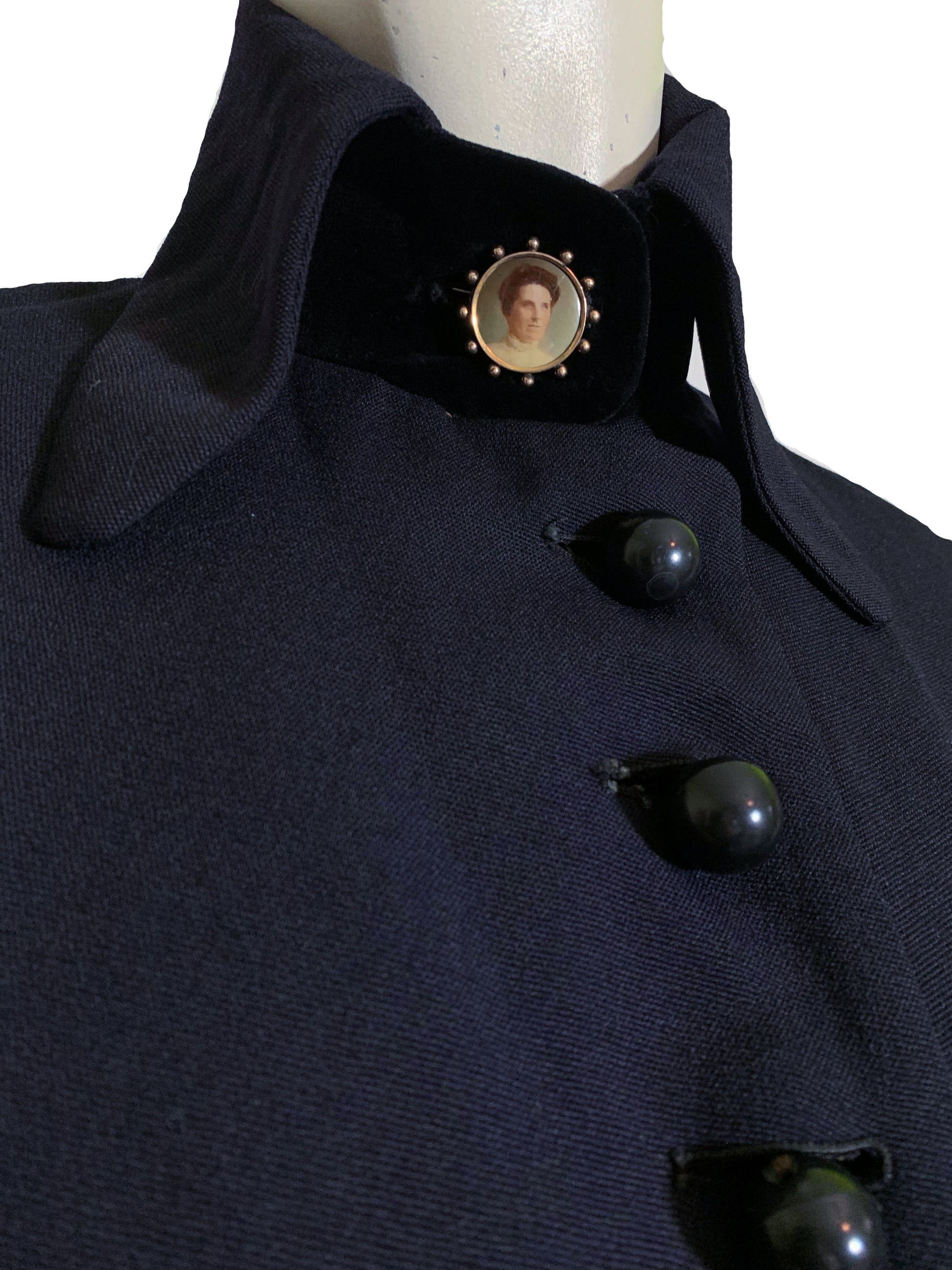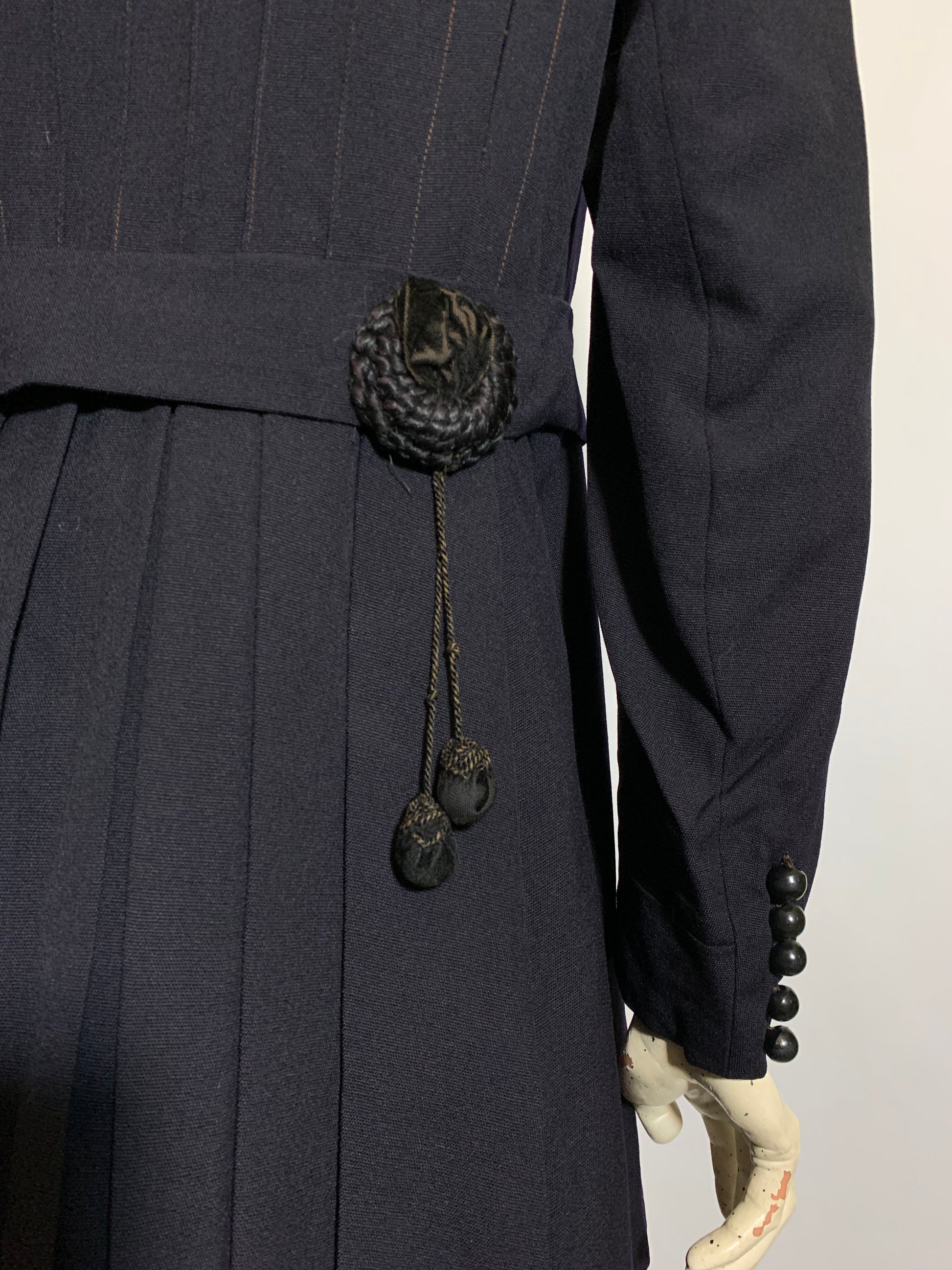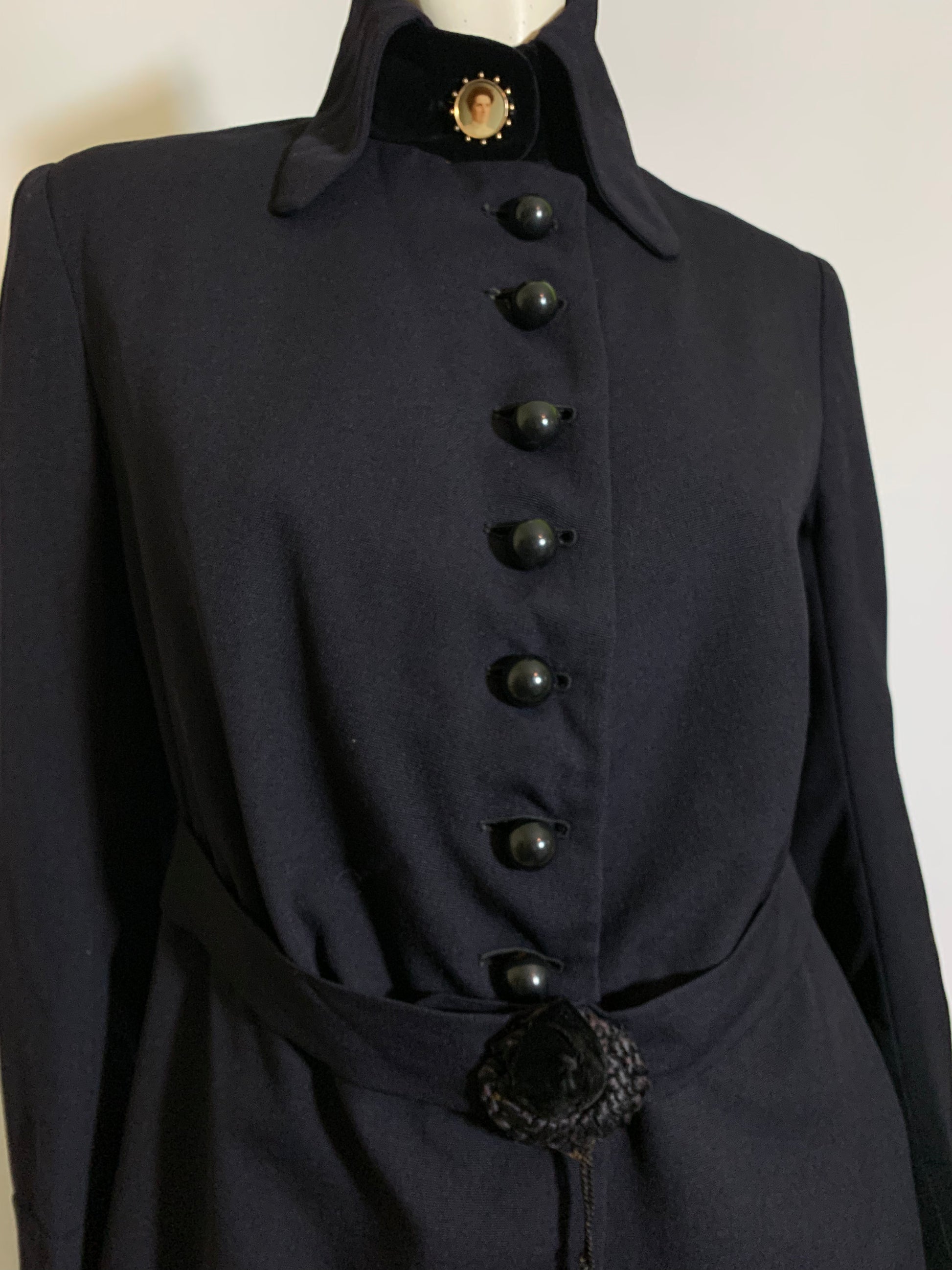 An amazing example of 1910s fashion often seen worn by Suffragettes in film and photos. Deep blue wool walking suit made up of long jacket and above ankle length skirt. Skirt has side metal hook and eyes and snaps, single pleat off to each side on front. Unlined. Jacket is mid thigh length, has attached sash with velvet and silk braided accent boasting 2 little dangling acorn ornaments. Large glass ball buttons. Velvet and wool high collar with rounded long lapel, button hole but no button- I used a period correct mourning brooch as a button (it fit perfectly though the opening!)- brooch available on the site here.