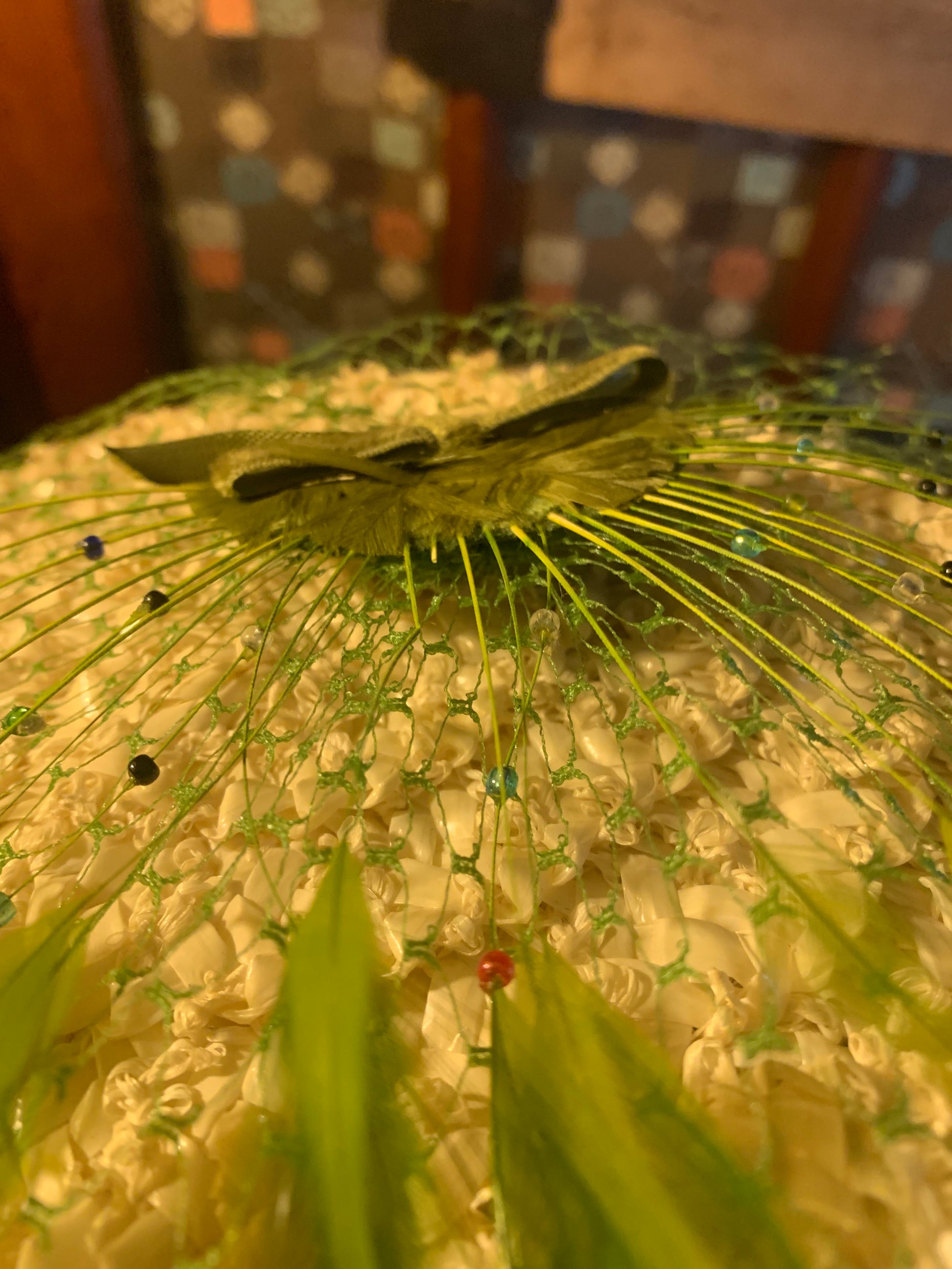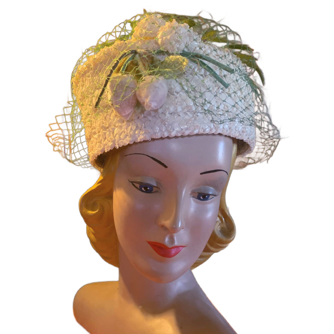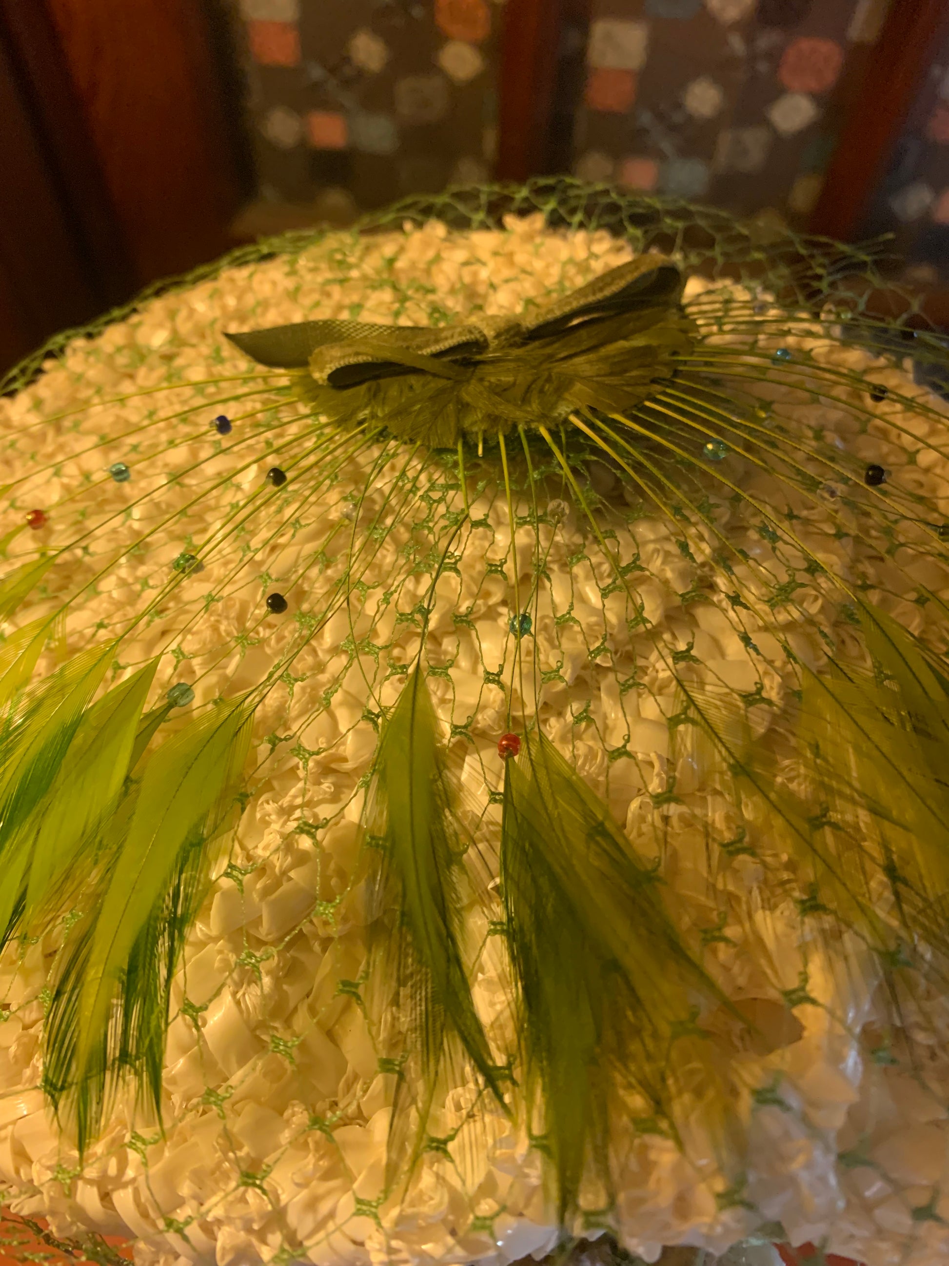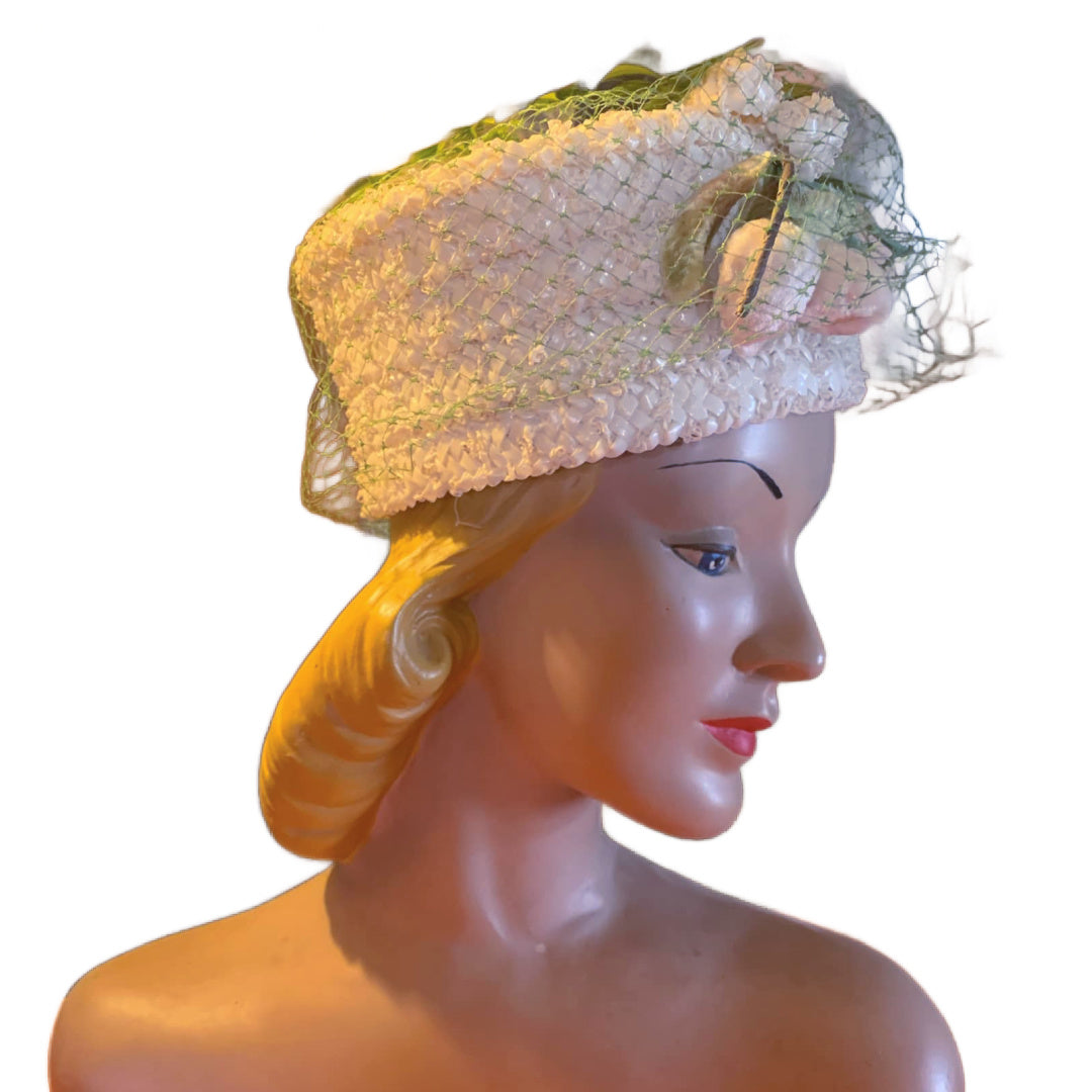 Warm Ivory Braided Sisal Pill Bow Hat with Green Feathers and Iridescent Beads circa 1960s