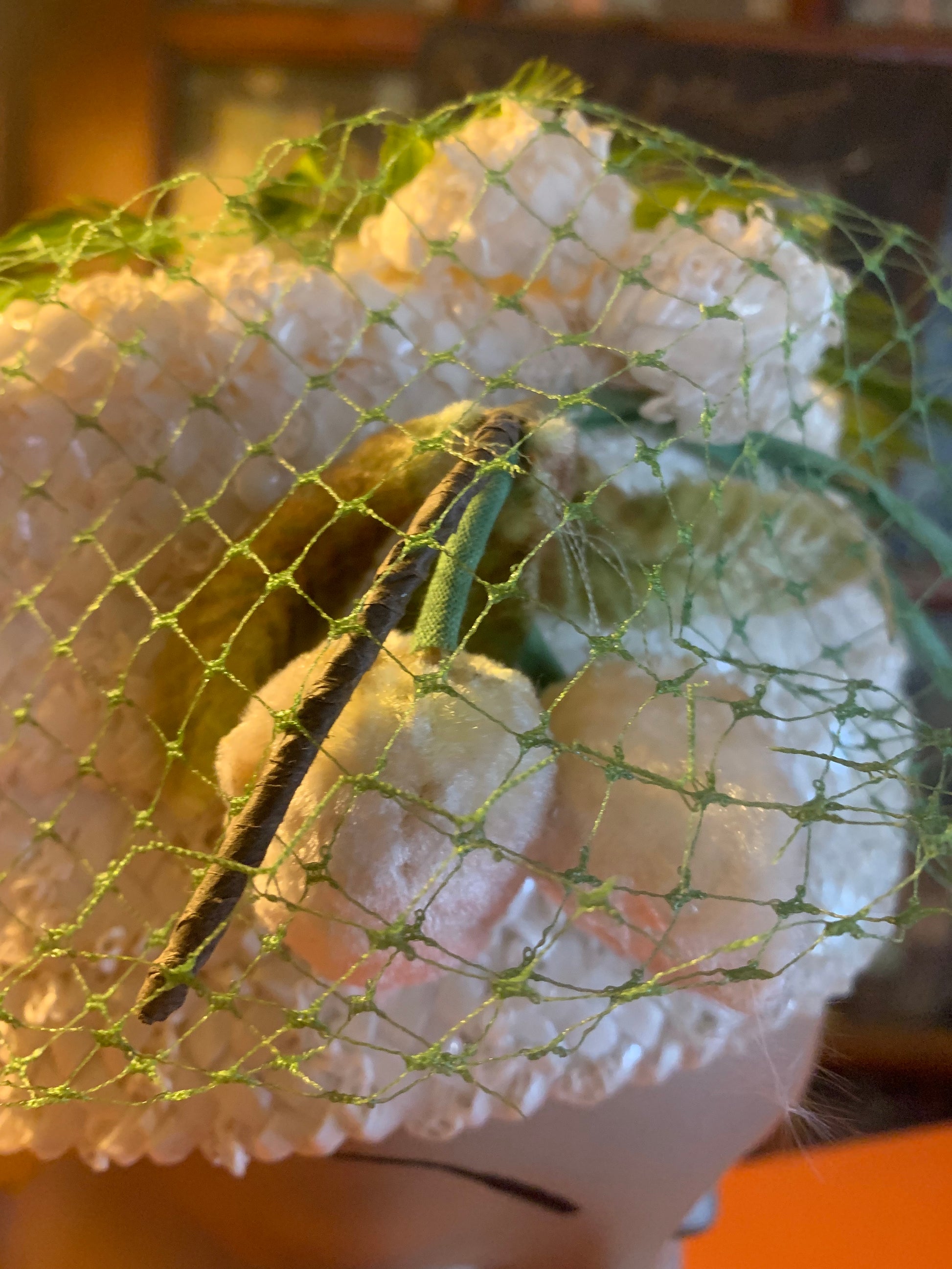 Delightful 1960s braided sisal pill box hat with green netting and spray of feathers on top accented with iridescent beads, small bow. Velvet flower bouquet on front. Perches atop head, measures 20" around inside. 8" tall. No label, no flaws.