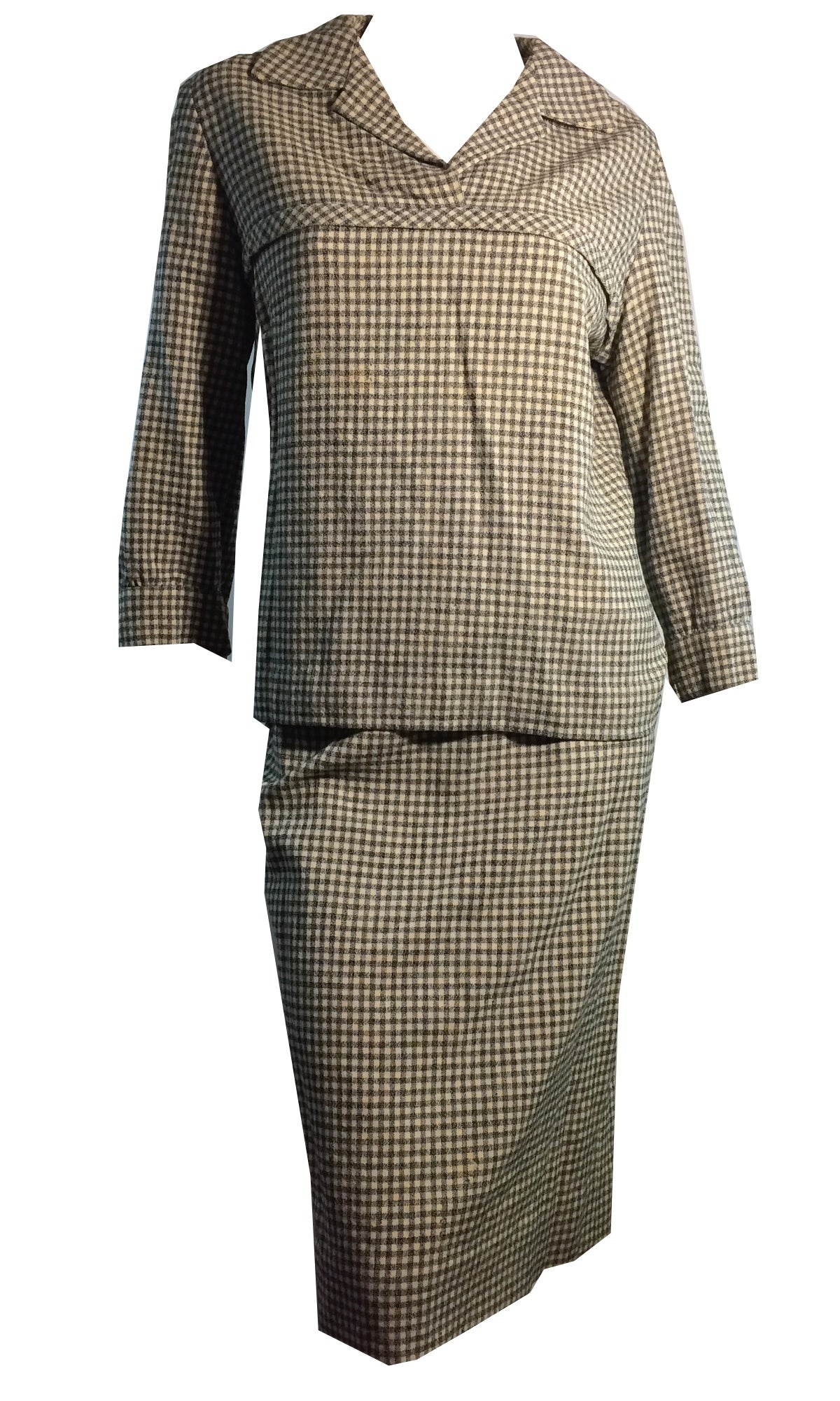 Warm Khaki and Grey Plaid Wool 2 pc Dress Set circa 1950s as is