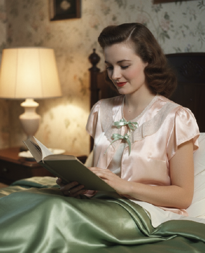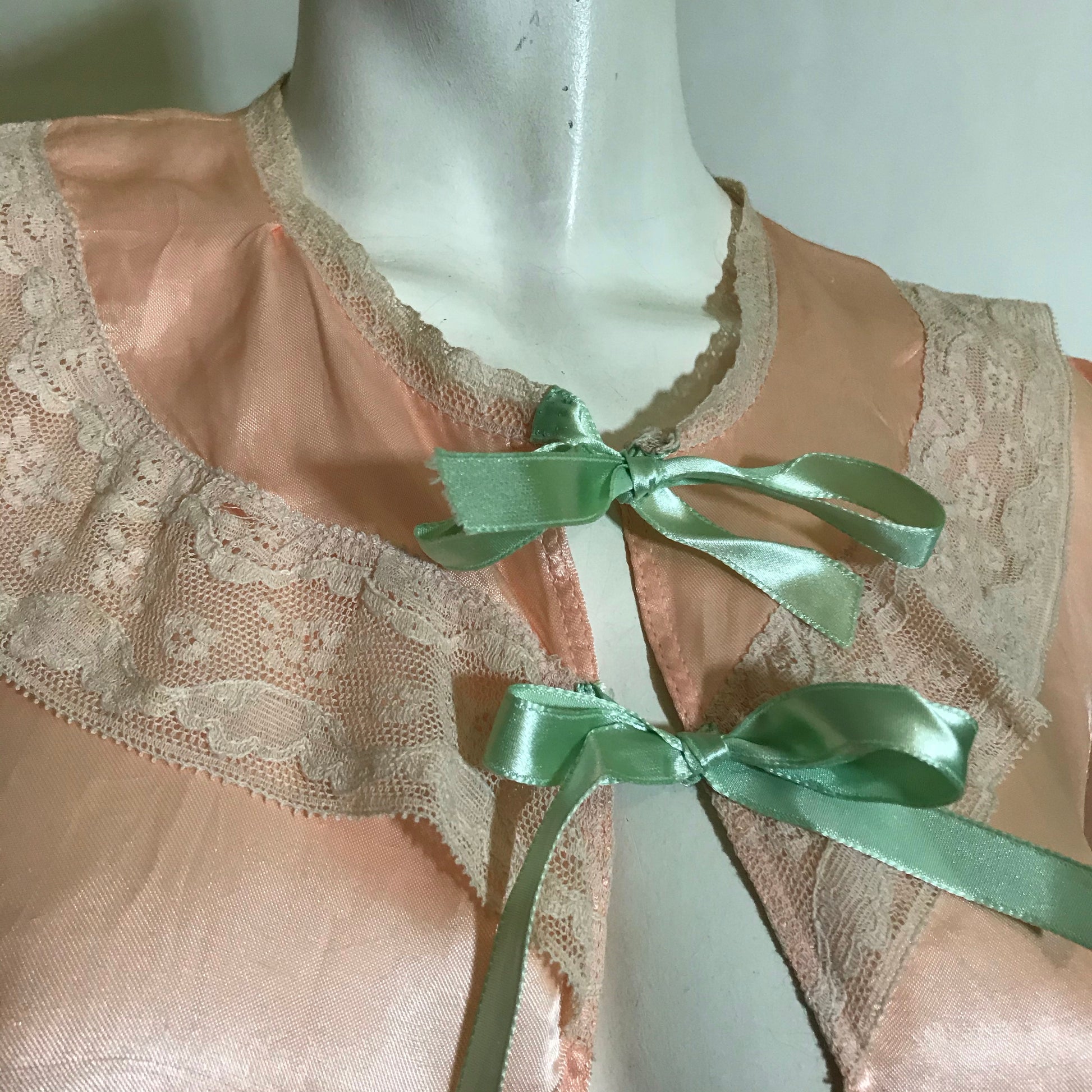 1940s acetate satin warm peach jacket with ecru lace trim and green bow tie closure, tiny puff sleeves. No label, one small snag.