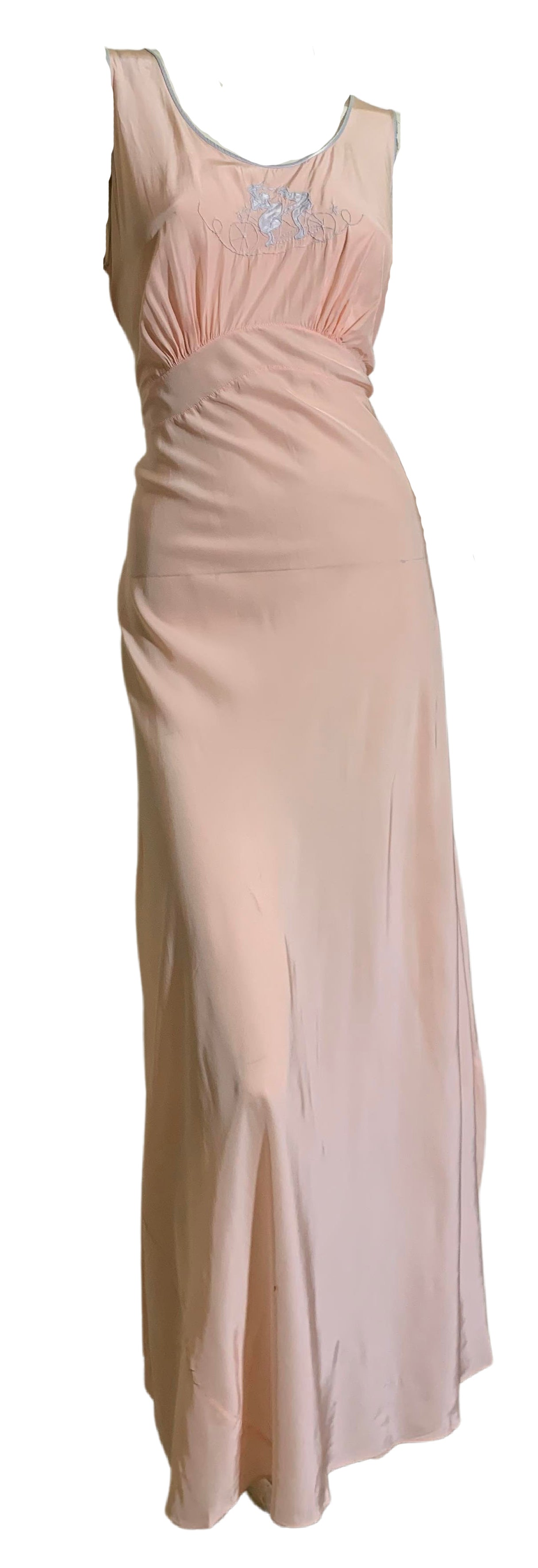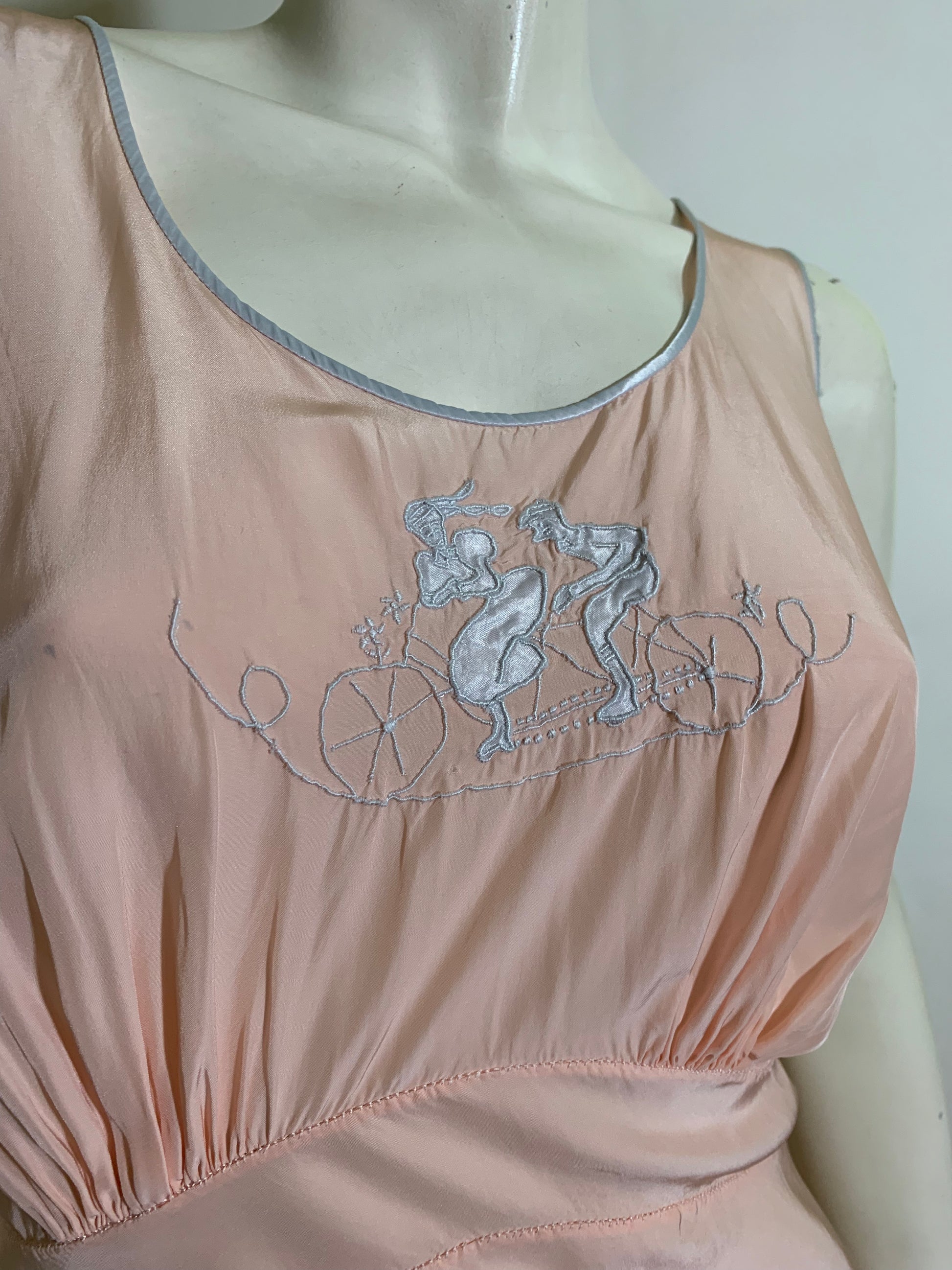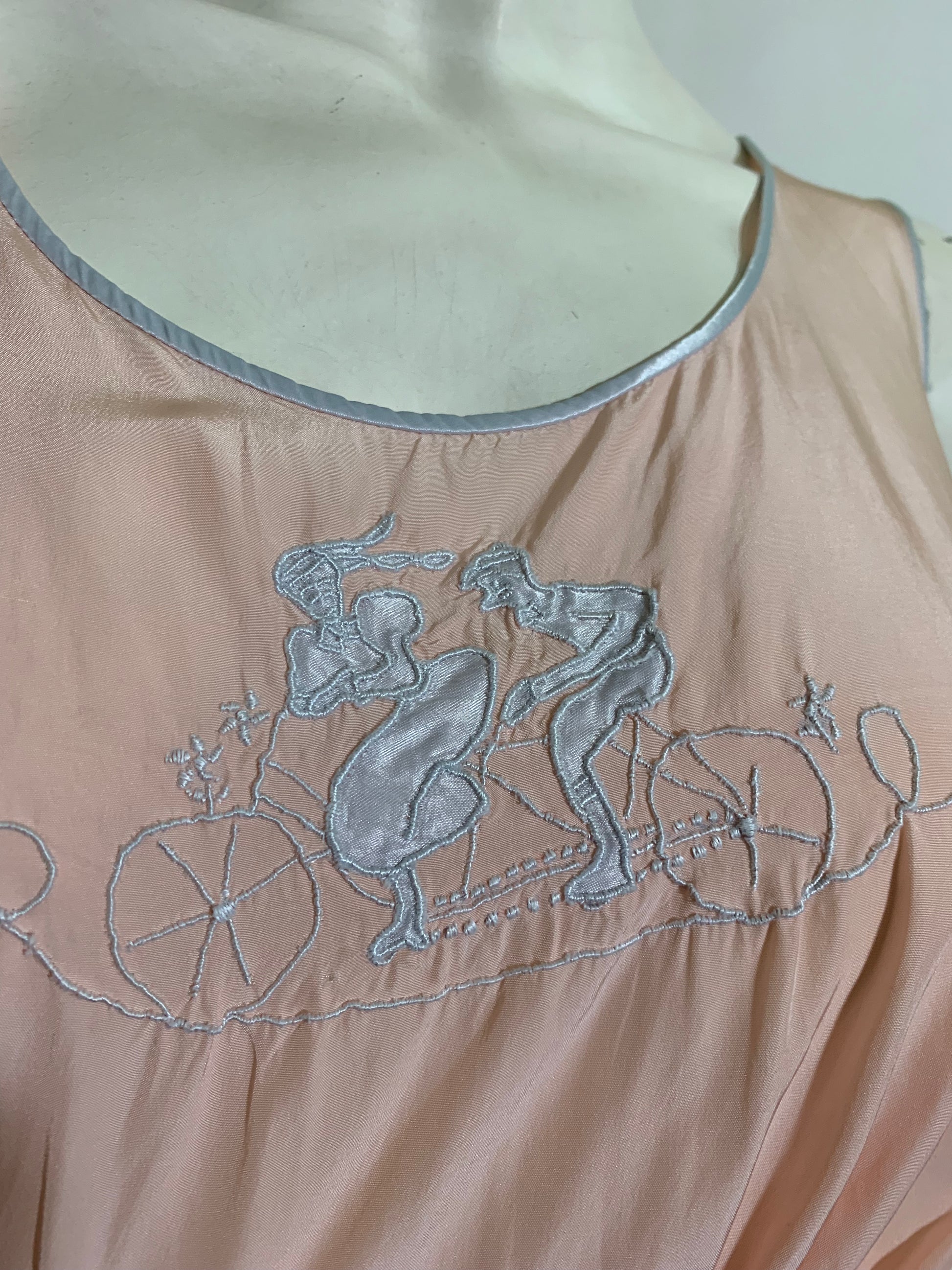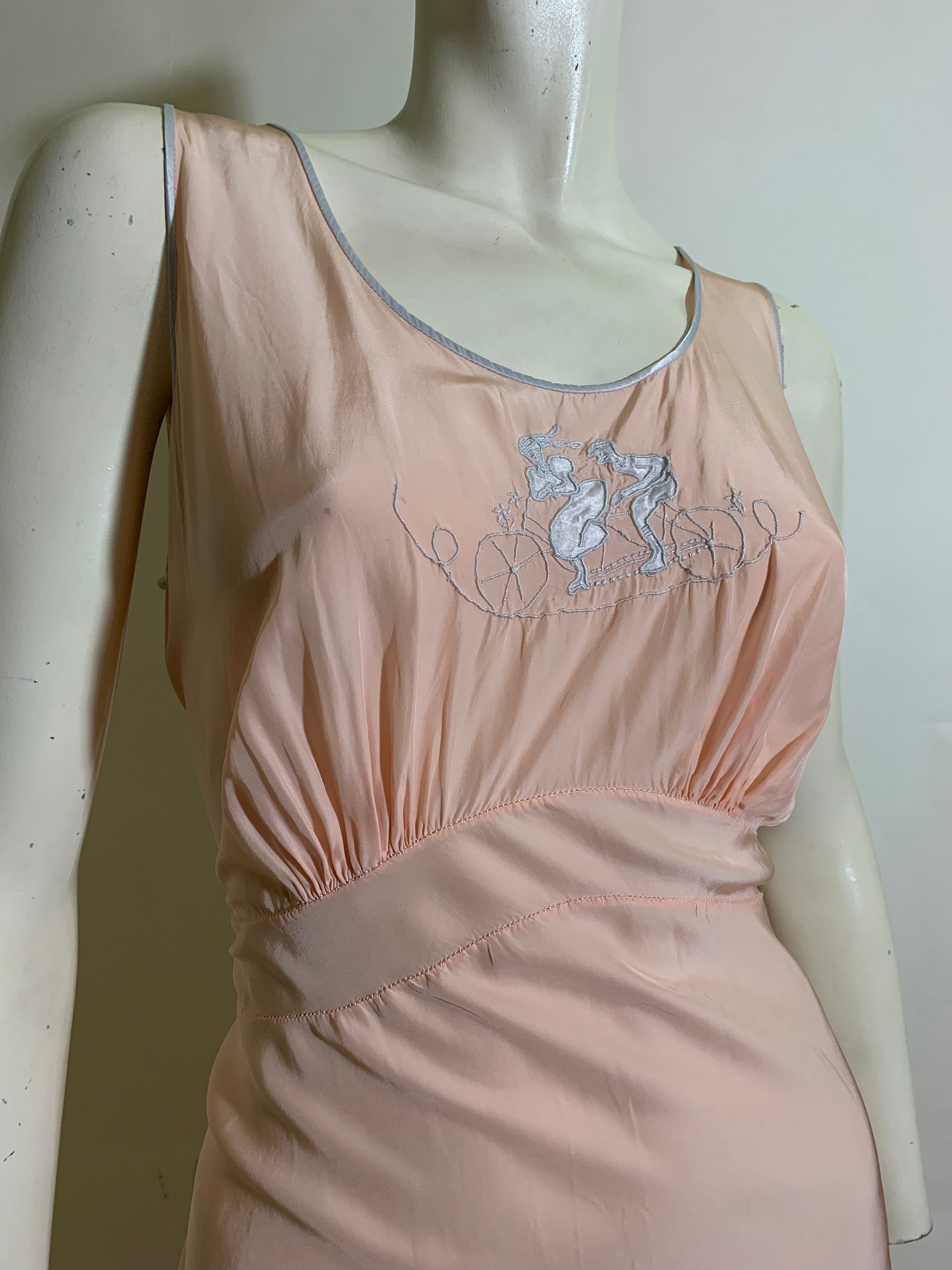 1940s peach acetate rayon nightgown with darling embroidered flirting couple on a tandem bicycle in pale sky blue. Matching piping around neckline. Ruched under bust. One small spot on front toward hem on right side.