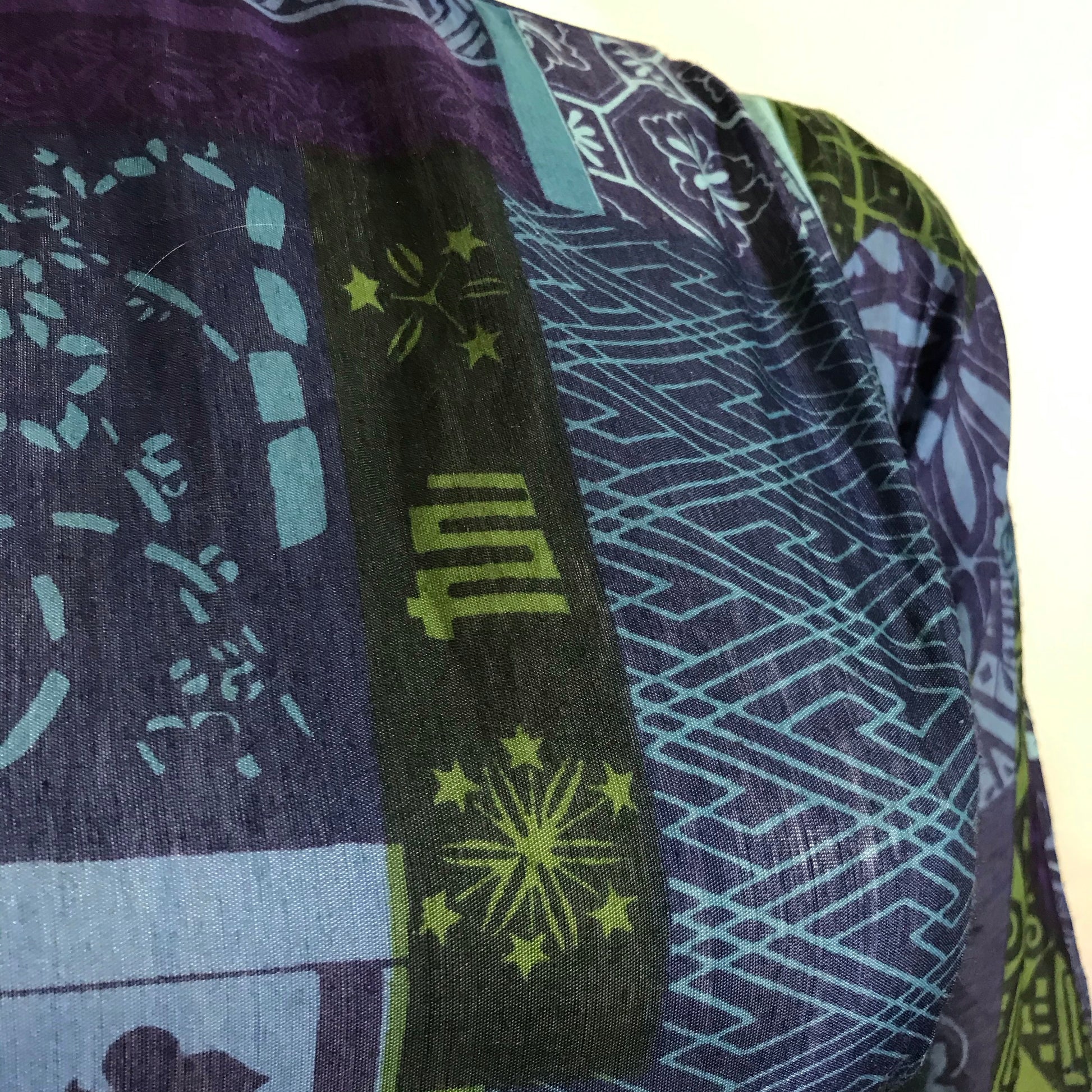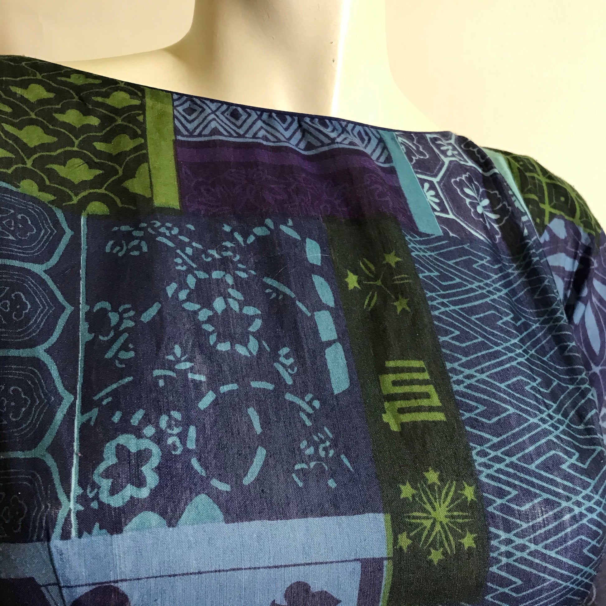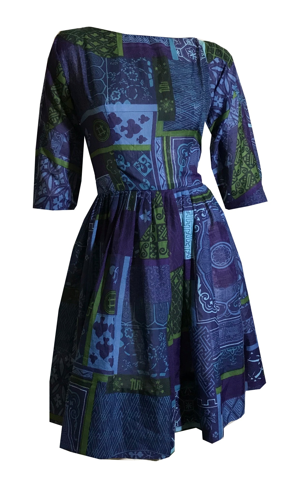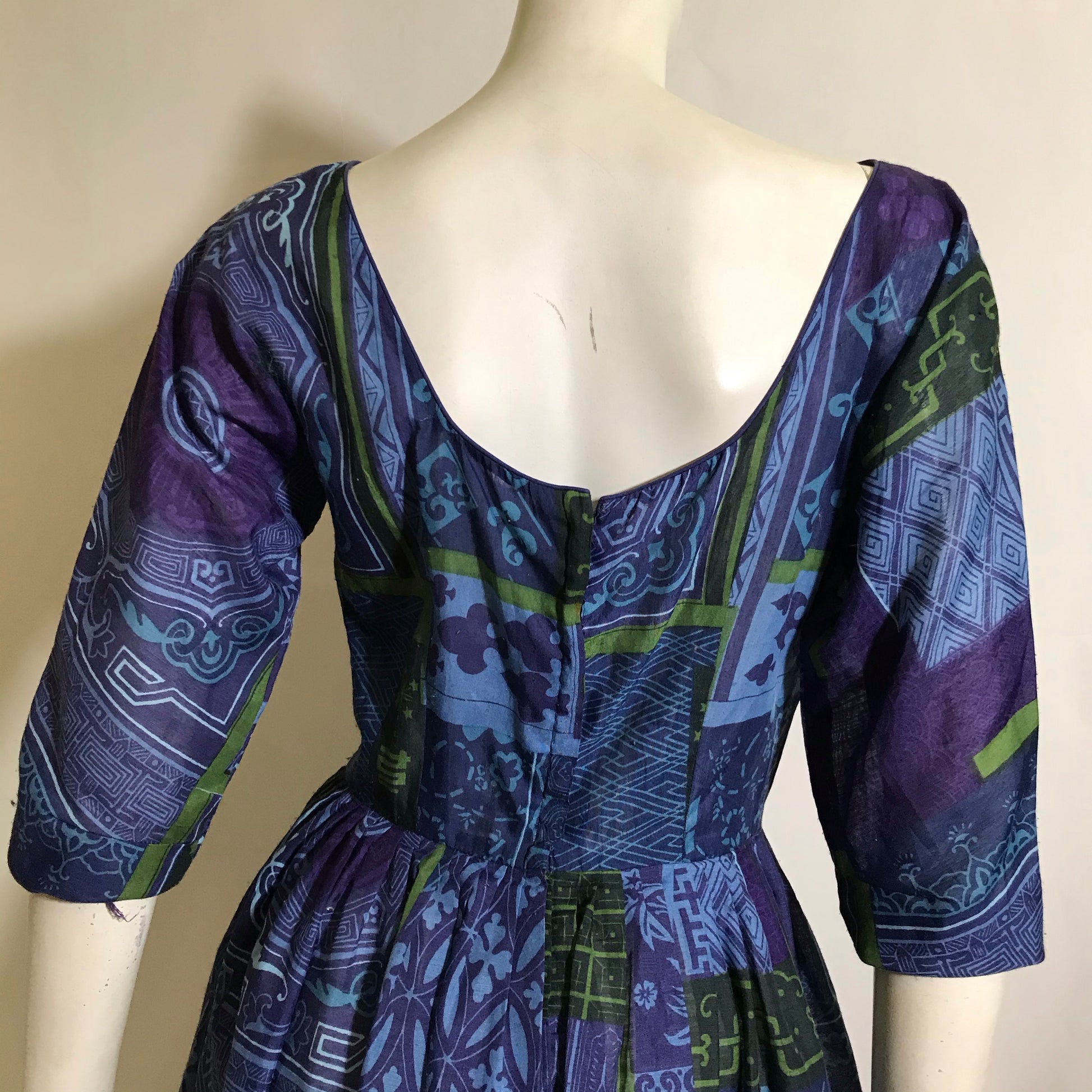 1960s L'Aiglon semi-sheer cotton full skirt dress in shades of blue and green. All over print in abstract shapes accented with hashtags, spades, stars, fireworks and hearts. Low scoop back. Sleeves "hemmed", no holes or stains.