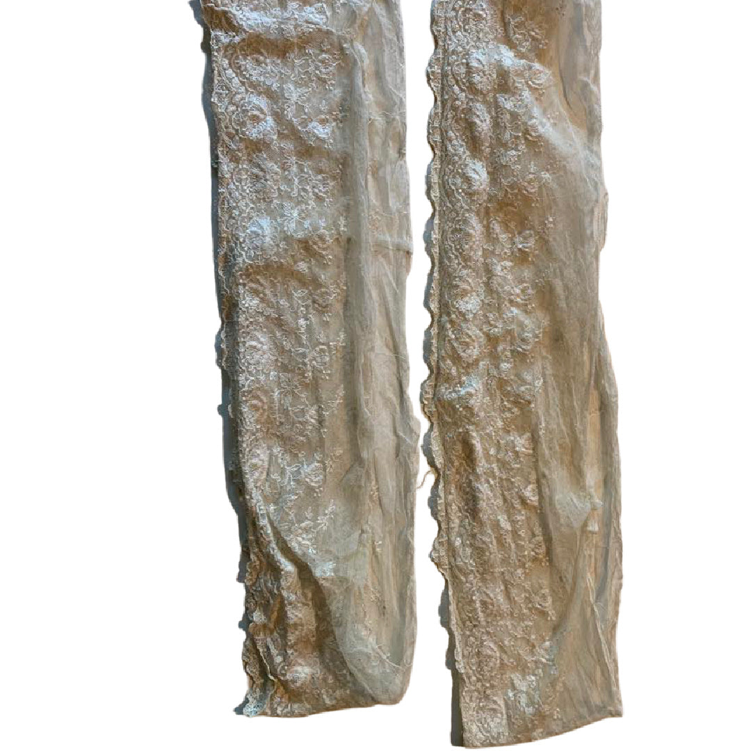 2 loops of soft white silk mesh trim with floral embroidery sewn together at ends. Torn along top of mesh. One piece= 44" by 5", the other= 52" long, 5" wide.