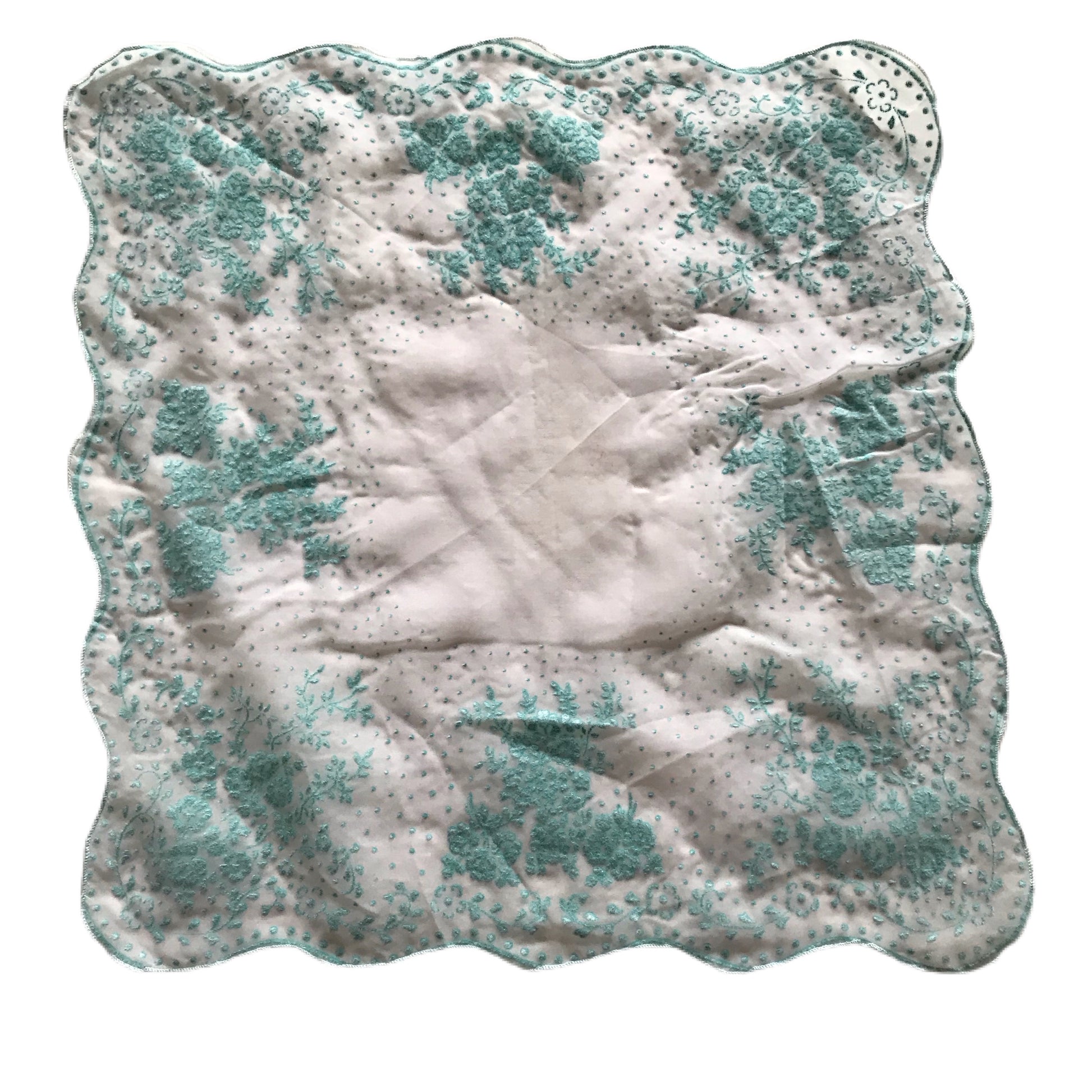 13" white nylon handkerchief with flocked aqua blue detail. No flaws.