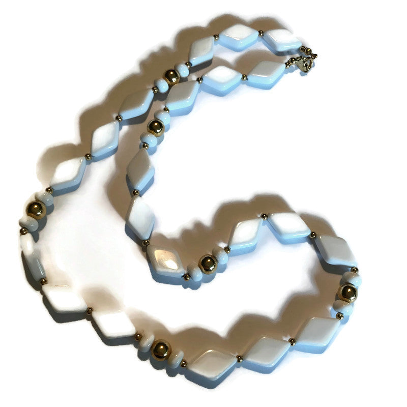 White Plastic Halequin Shaped Beaded Necklace circa 1980s