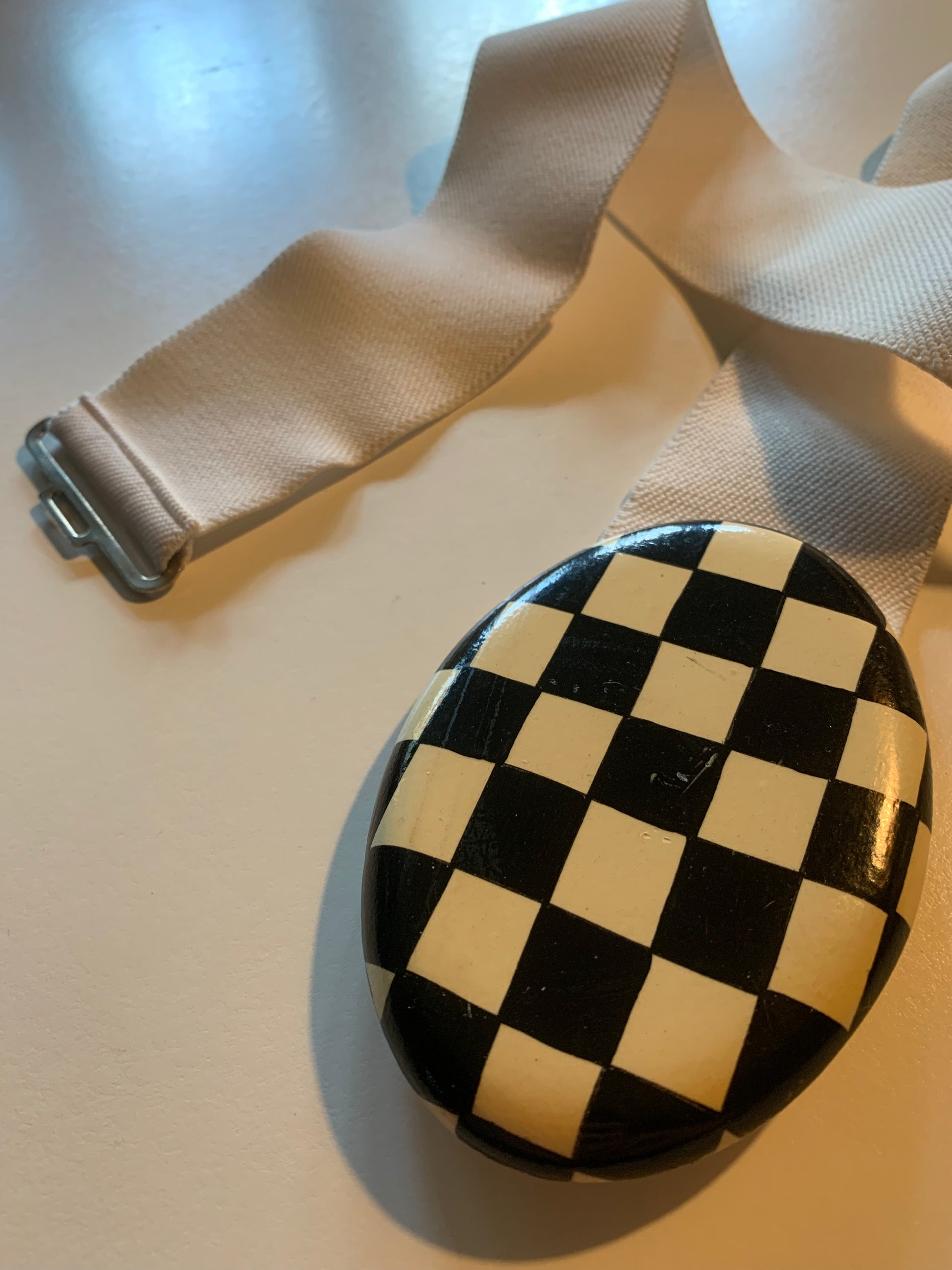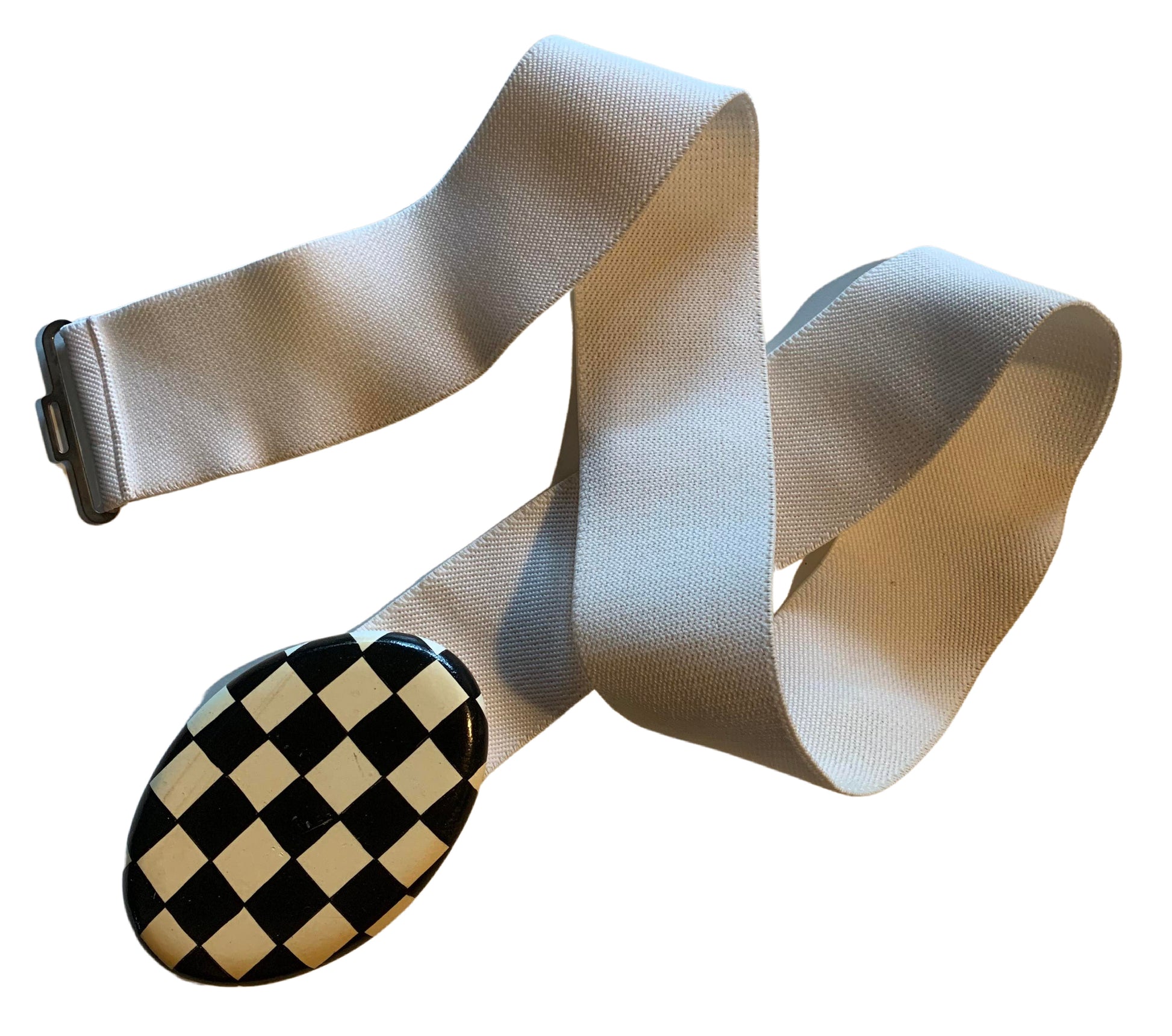 New Wave White Wide Elastic Belt Black Checkerboard Wood Clasp circa 1980s