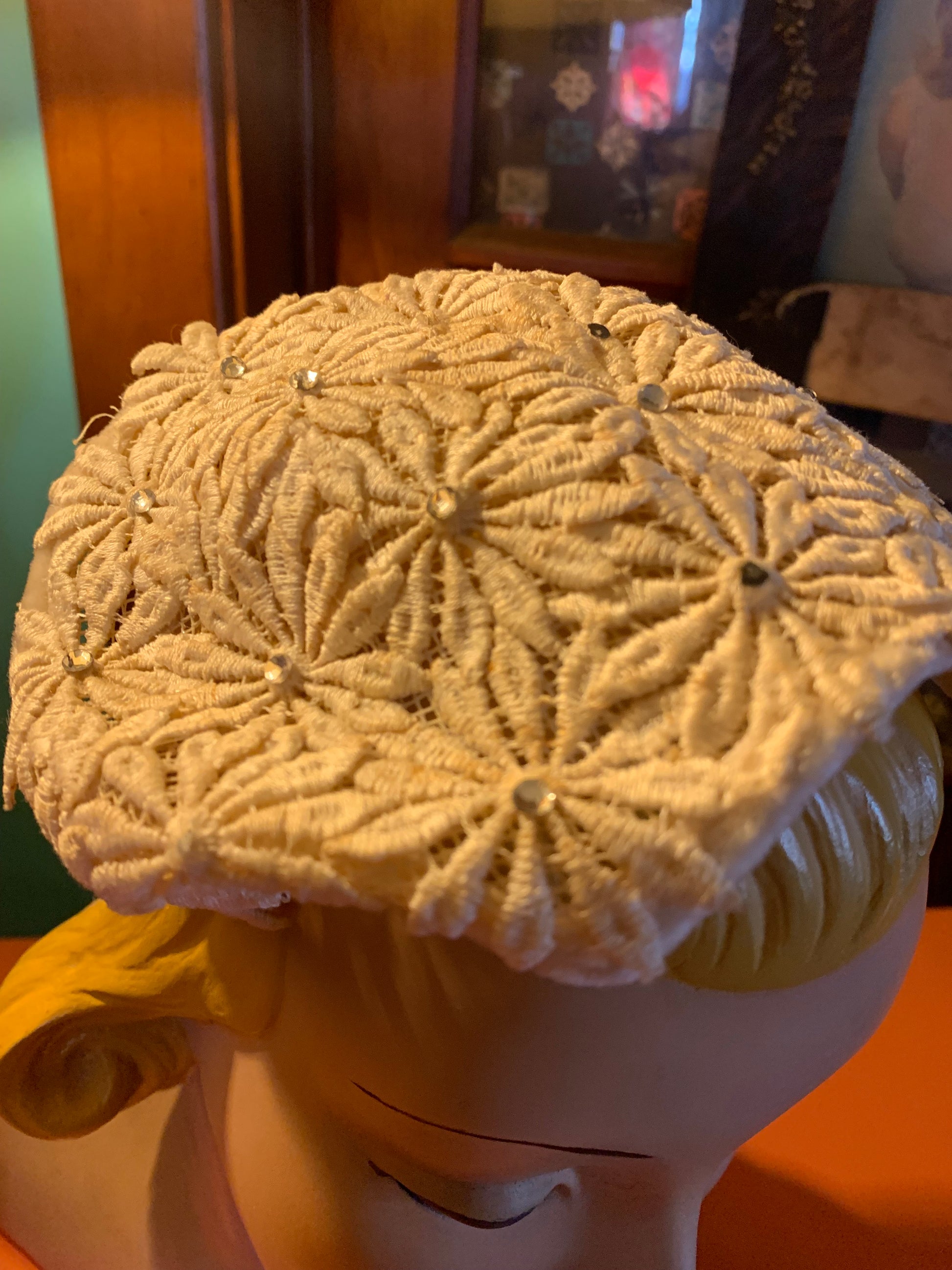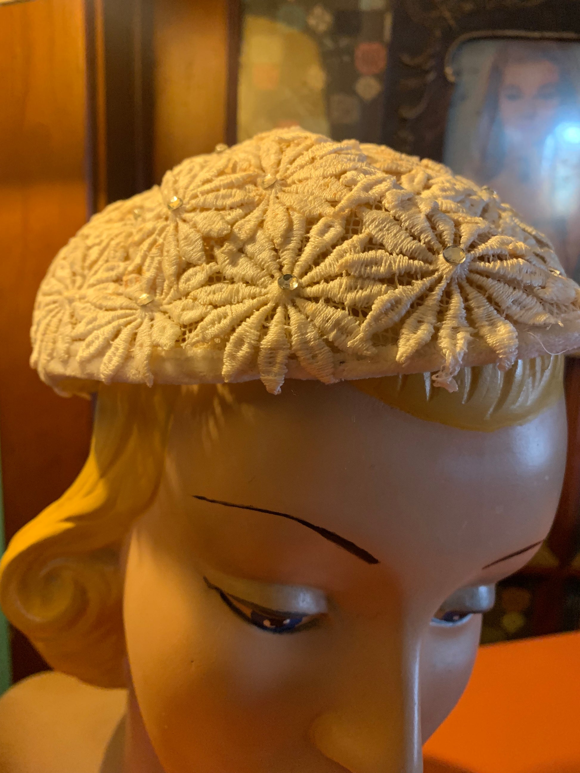 Wintry White Lace Cocktail Hat with Rhinestones circa 1950s