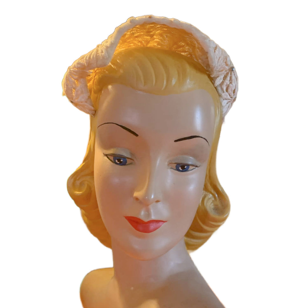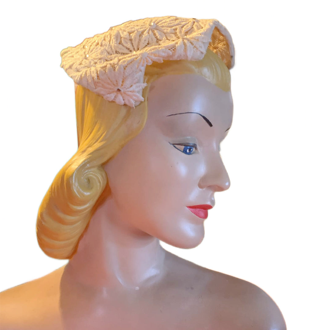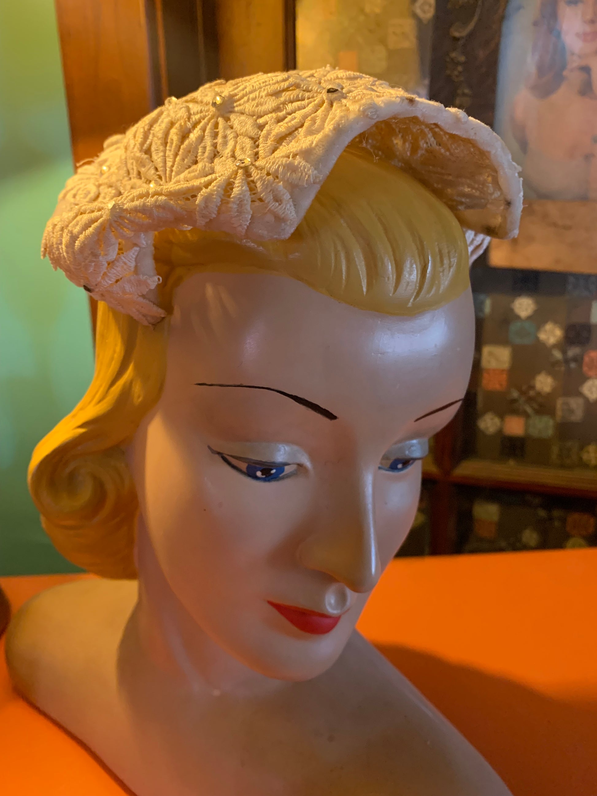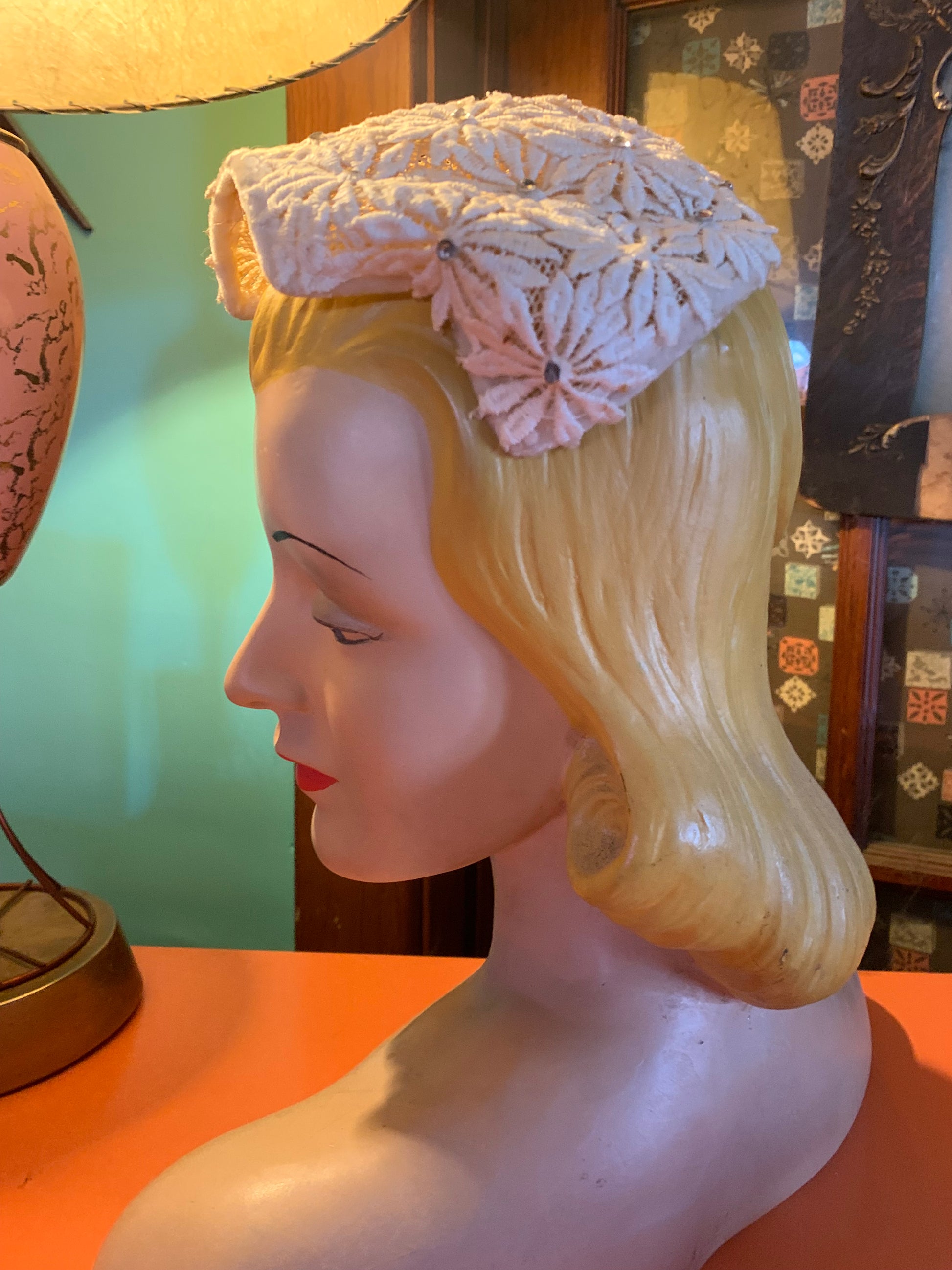 1950s wintry white lace sculpted cocktail hat with rhinestones- a perfect spring or summer hat, delightful for a bride! A few stones missing. Wired frame, one size. 12" wide 8" deep