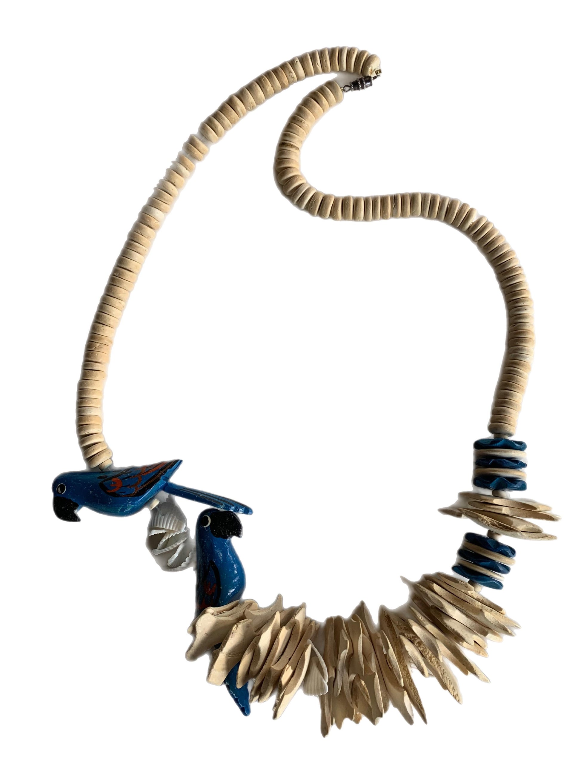 Wooden Tropical Parrots Beaded Statement Necklace circa 1980s