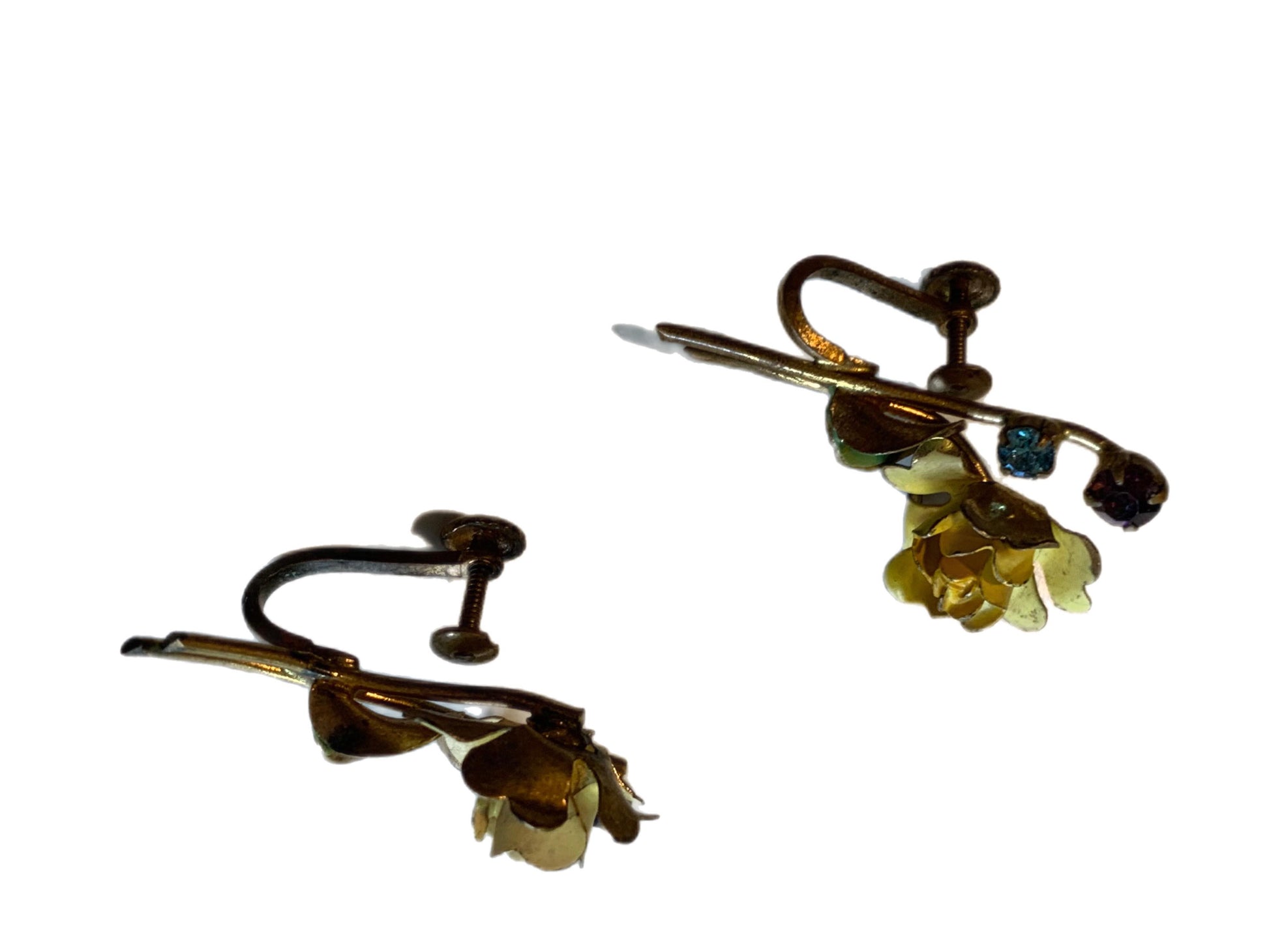 Yellow Rose and Purple & Blue Rhinestone Screw Back Metal Clip Earrings circa 1940s