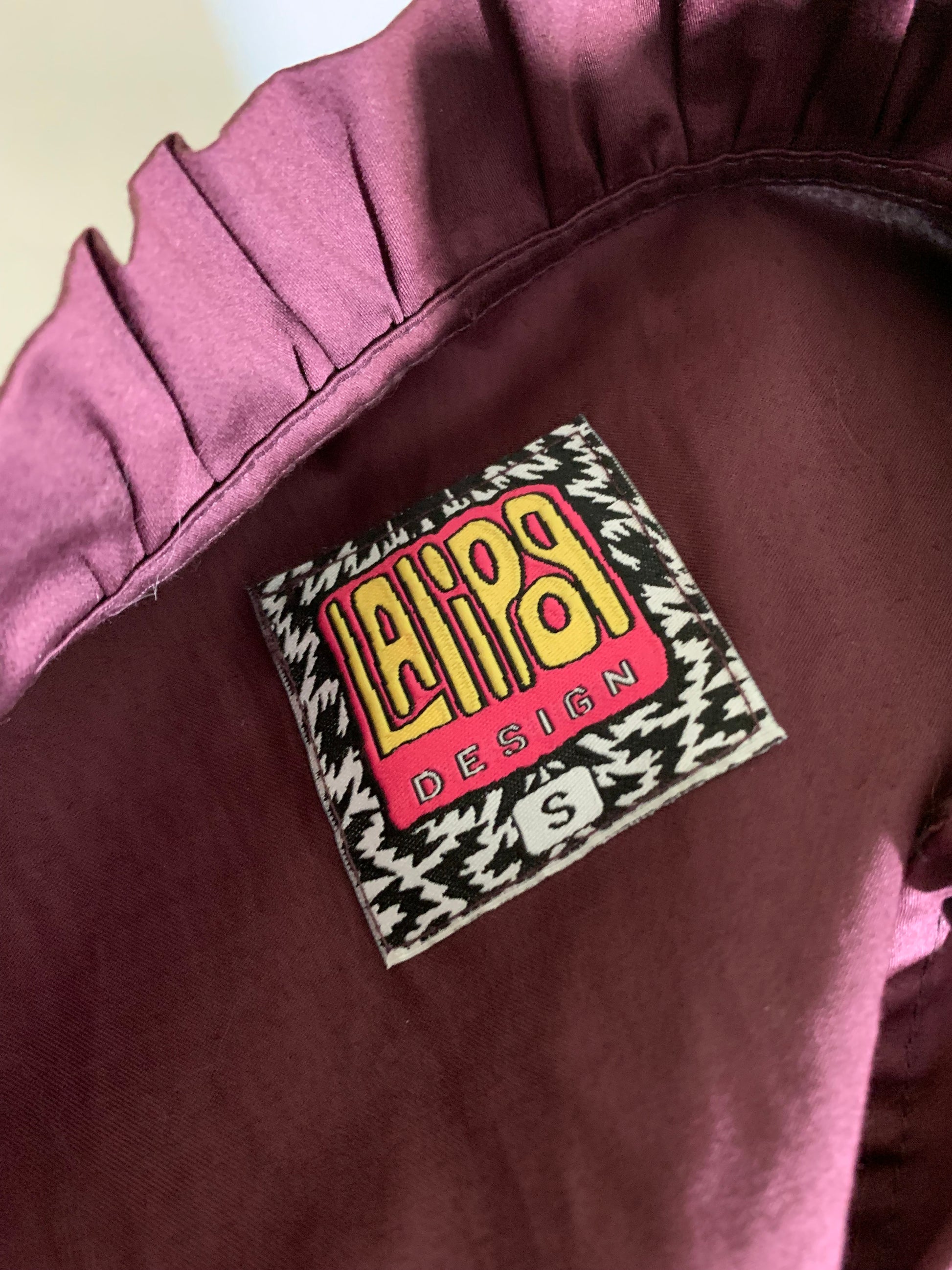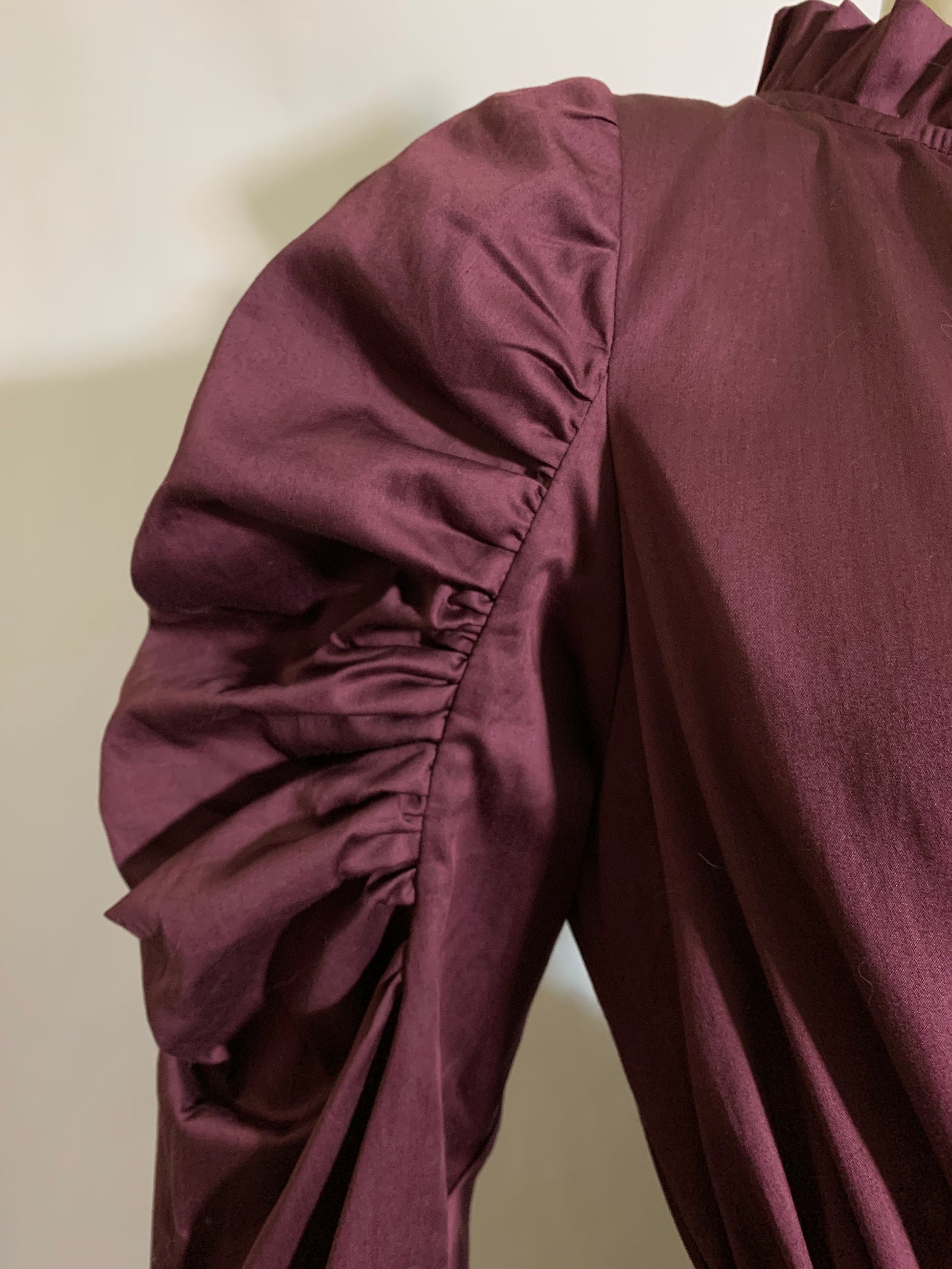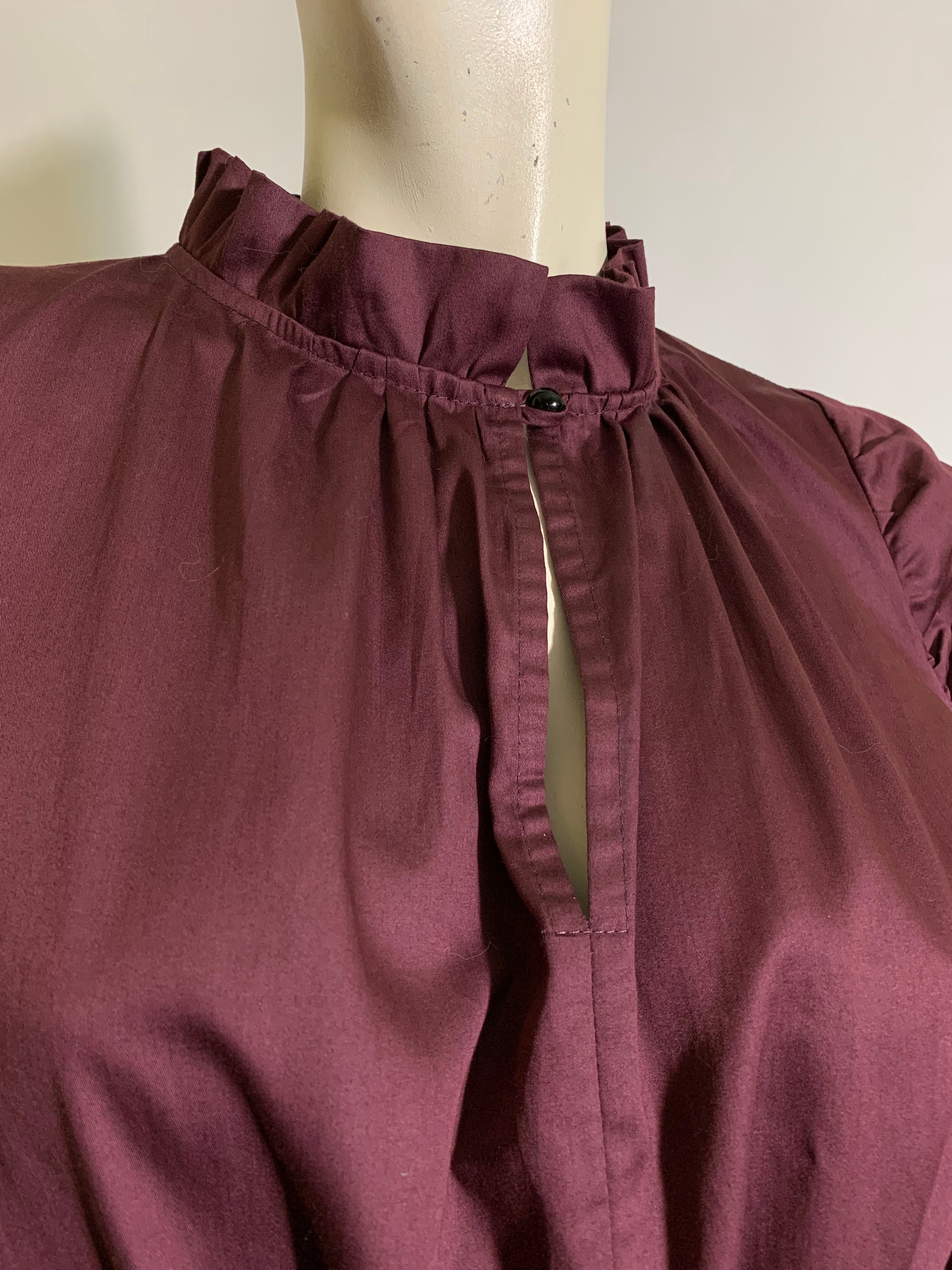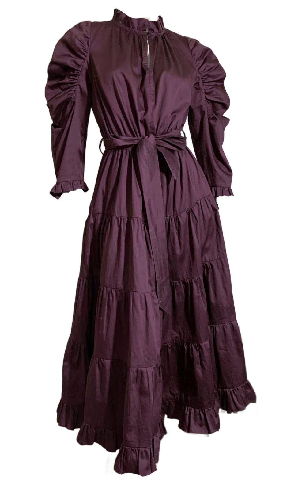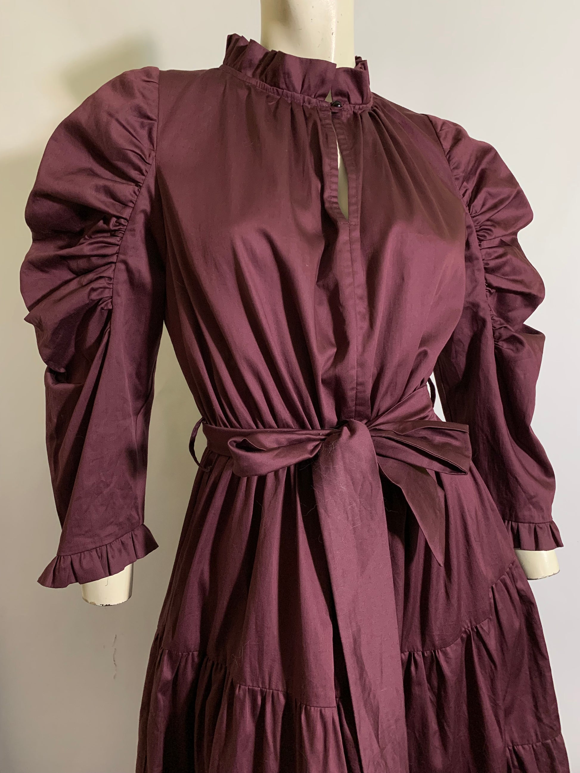 Plum poplin modern dress with 80s does Victorian styling- by LaliPop. Retails around $200! Keyhole neckline with loop and button, tiered full skirt, stylized leg-o-mutton sleeves. Sash at waist. No flaw. Size small.