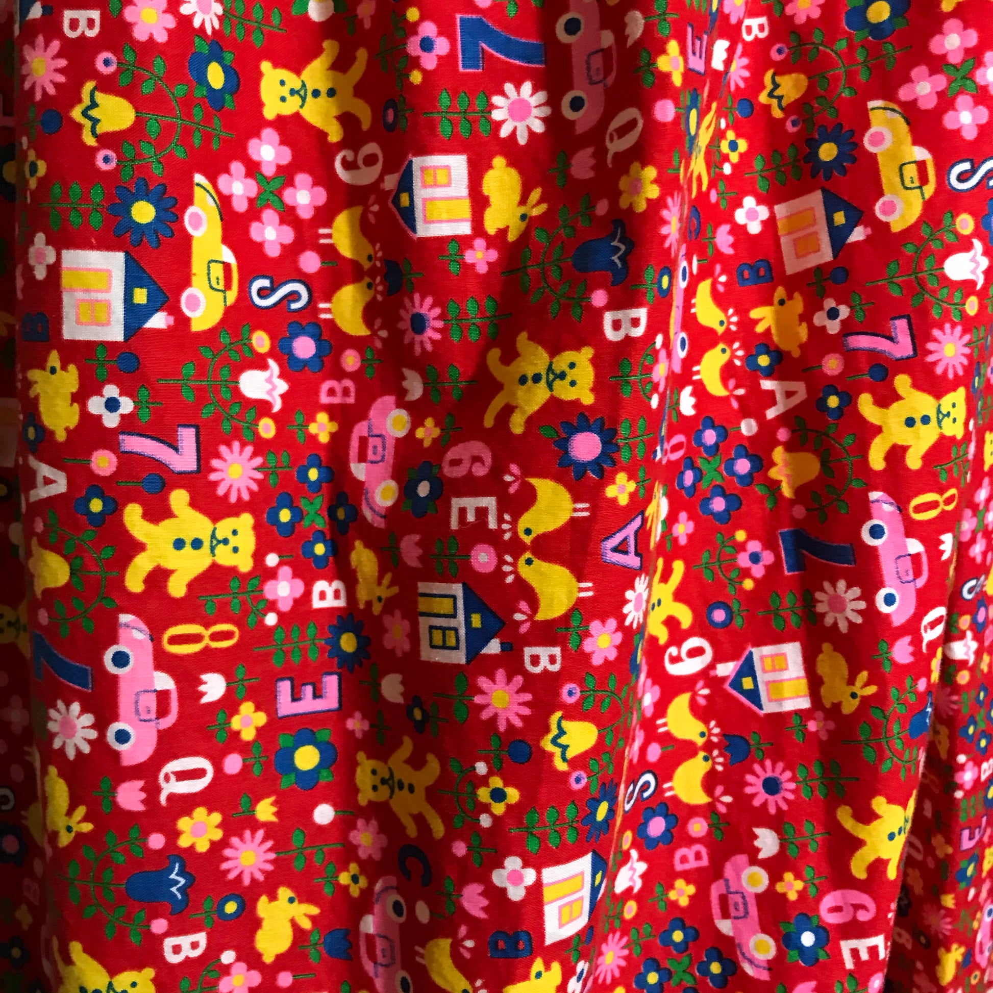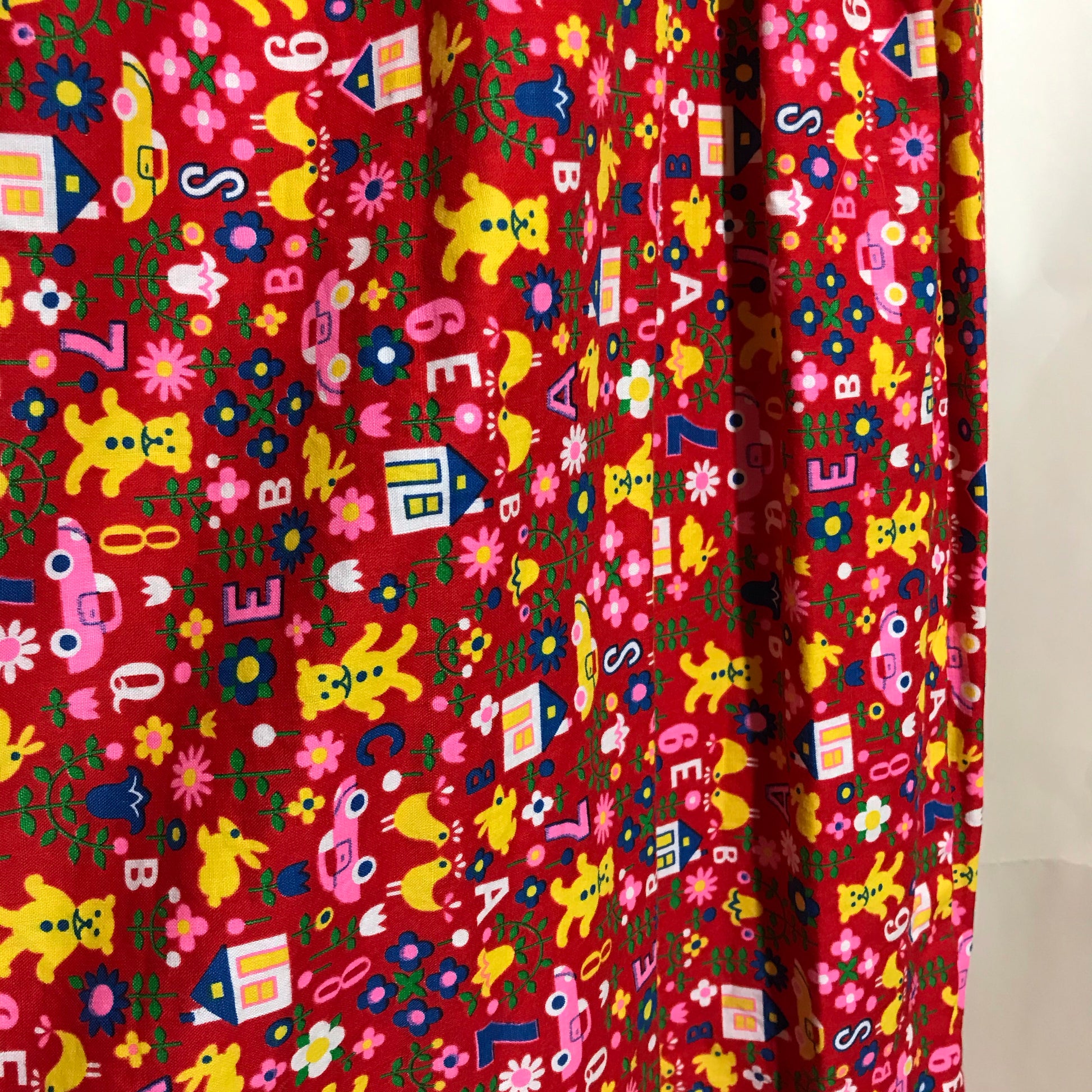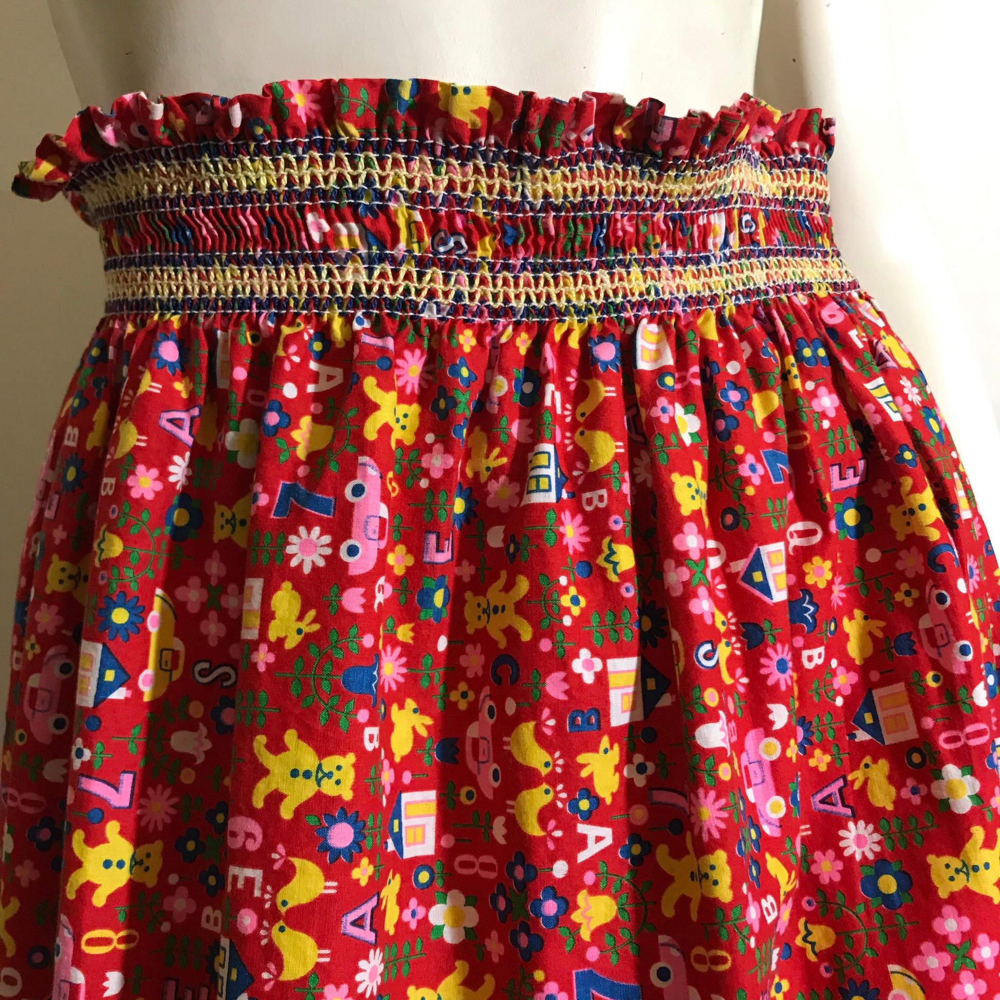 1970s red cotton maxi skirt with smocked waist, adorable print of ABCs, numbers, teddy bears, ducks, cars and more. Can be worn pulled up above bust and belted as well! Hand made, no flaws.