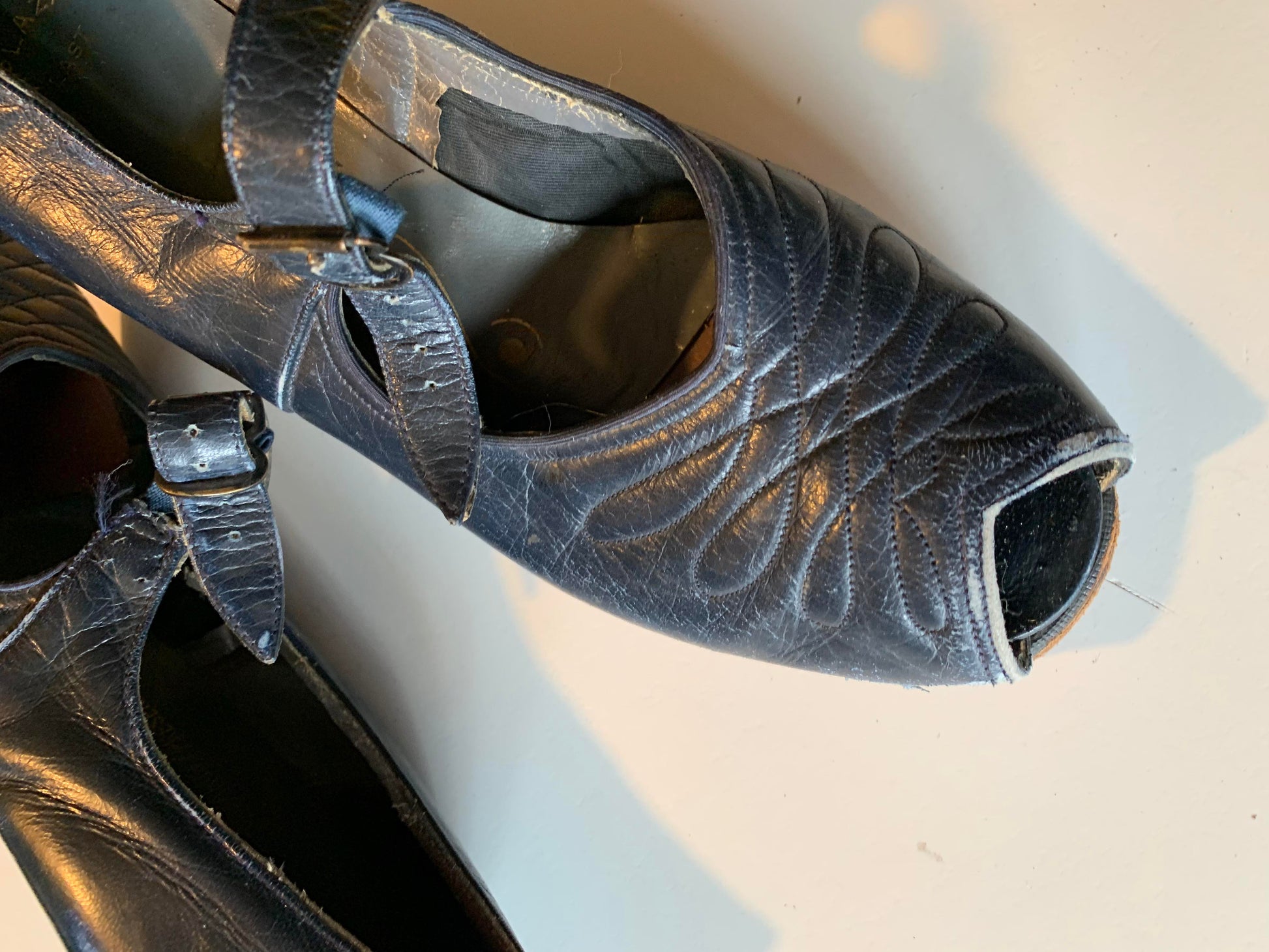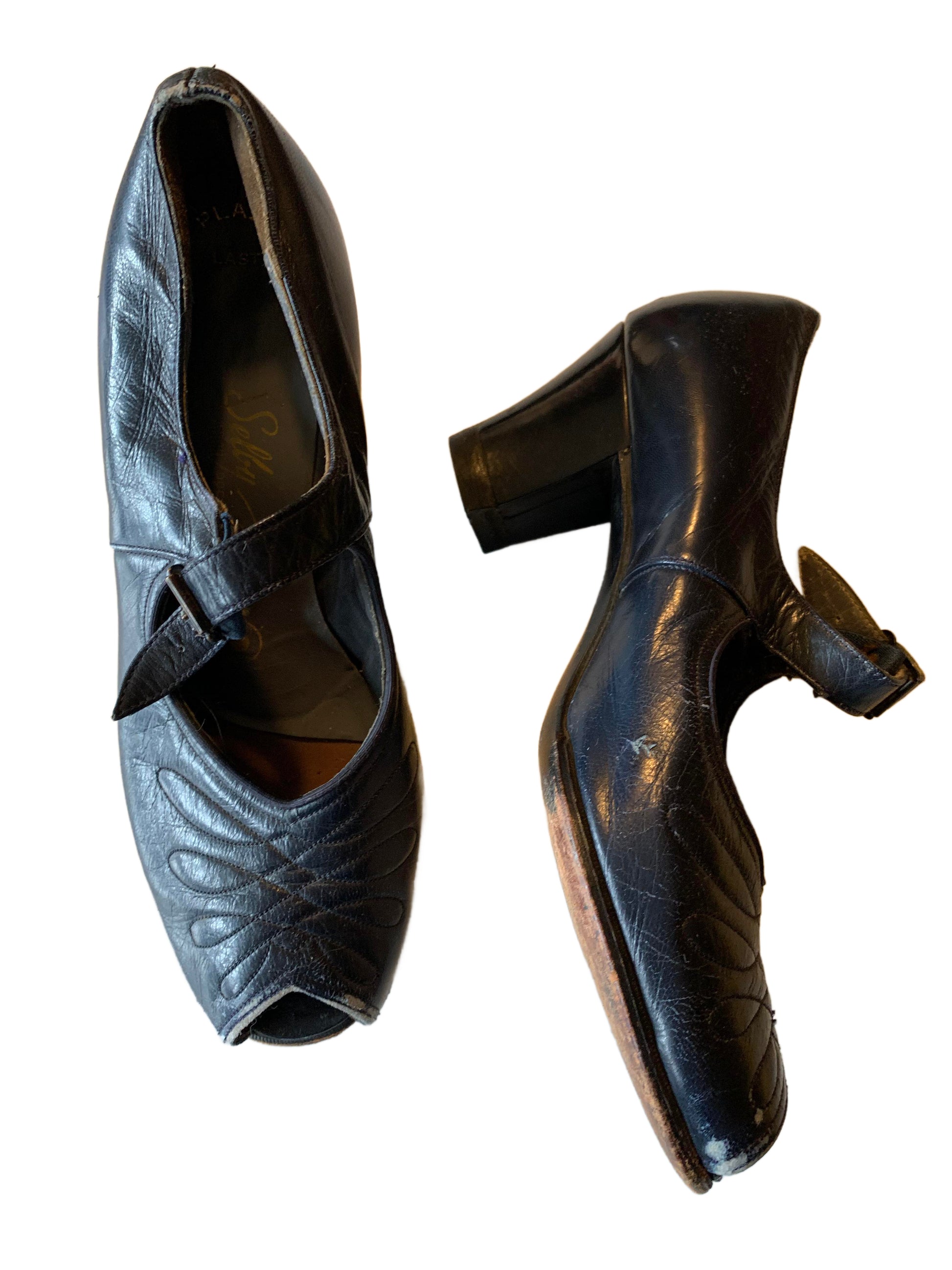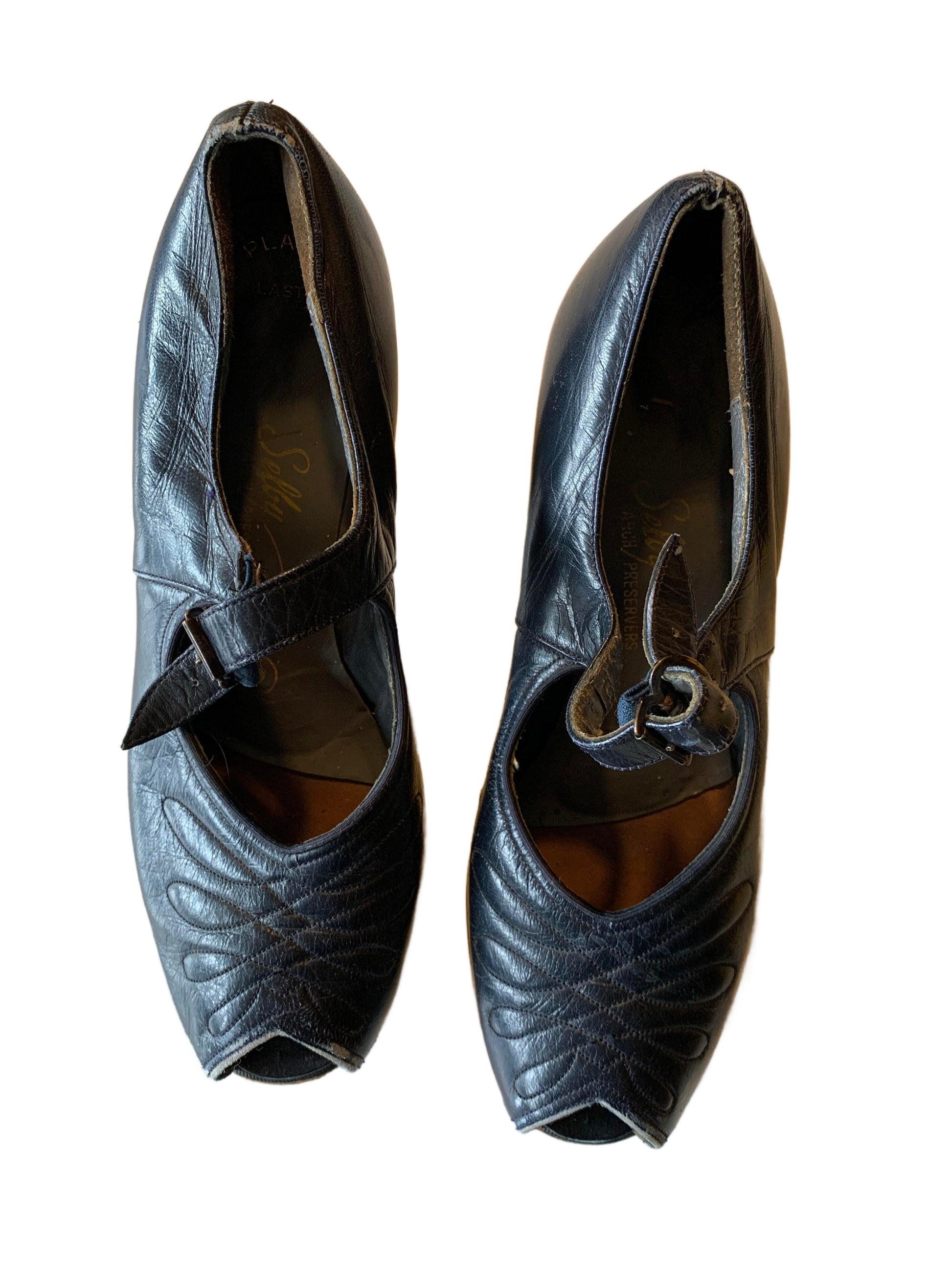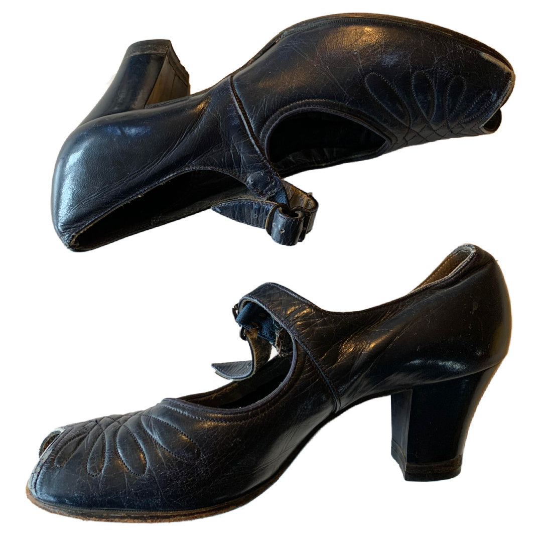 Blue leather 1940s low heel peep toe shoes with top stitched detail. By Selby. Repair to strap/buckle on right shoe- wearable, but definitely some wear. Leather soles.
