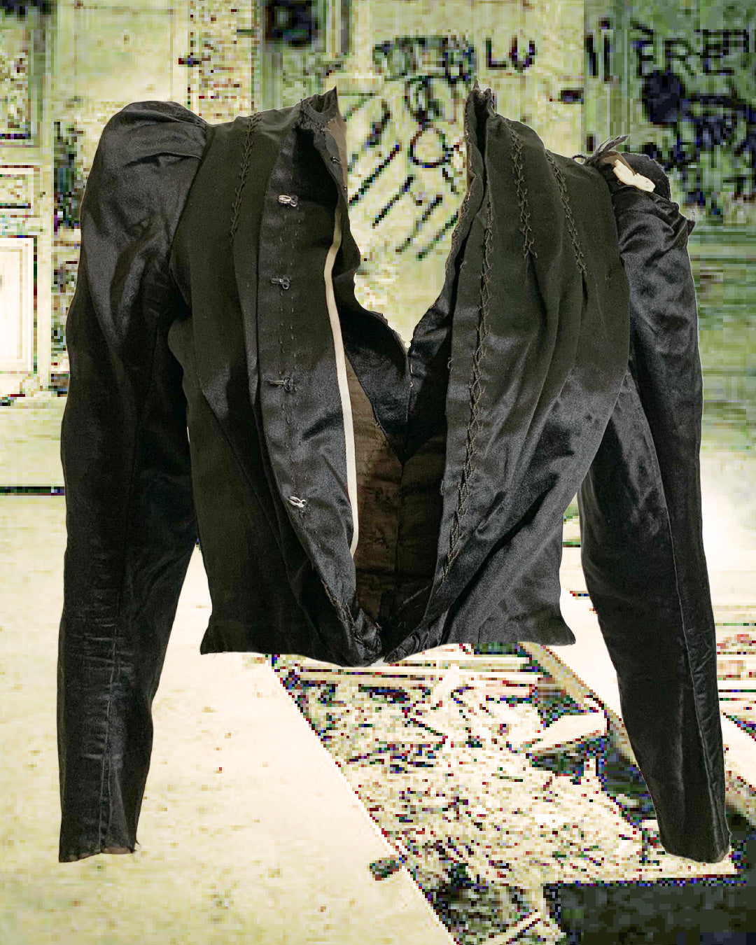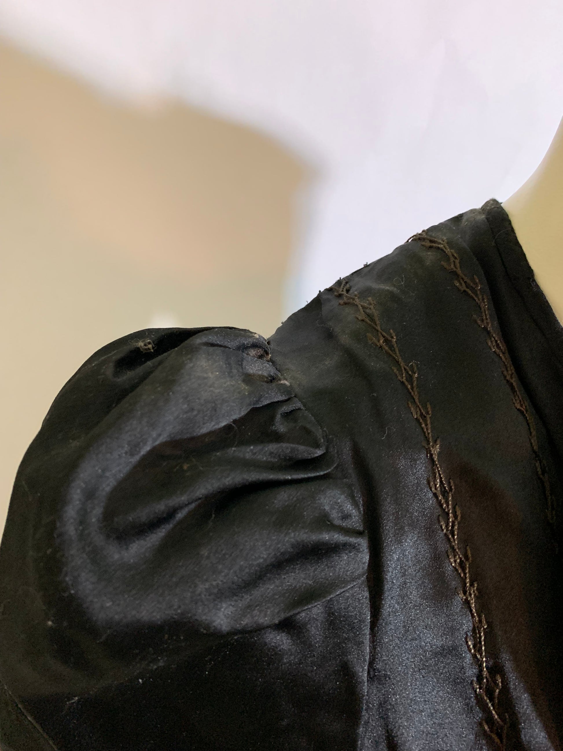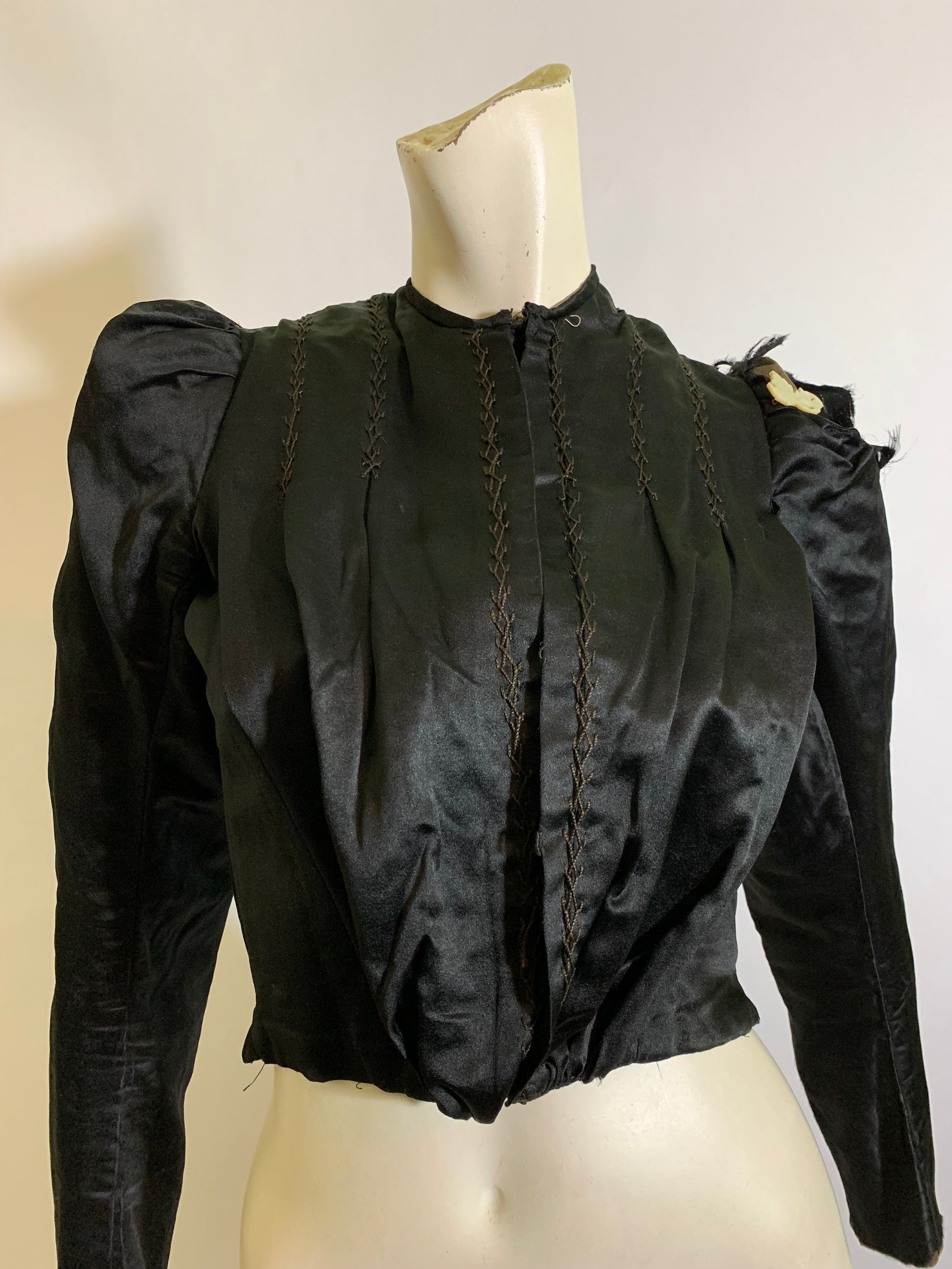 Black silk Victorian era bodice with puff shoulders, hook and eye closure down front and inside. Boned. Tears on left shoulder as shown- sold as is.