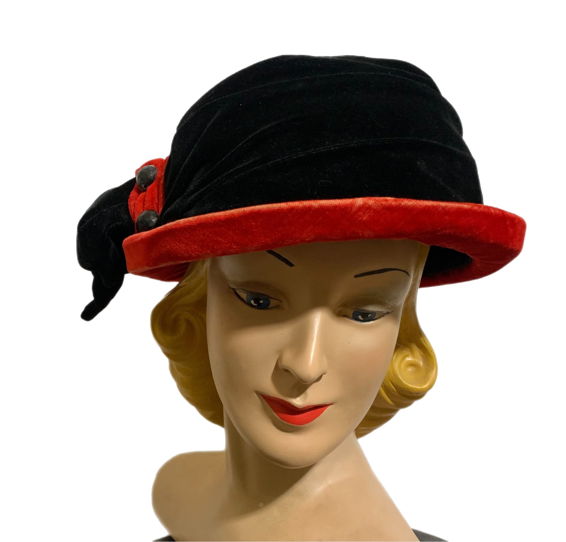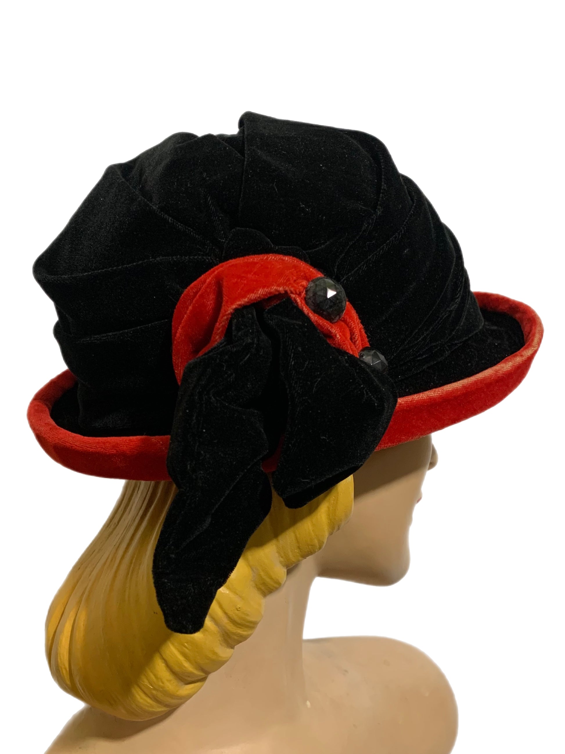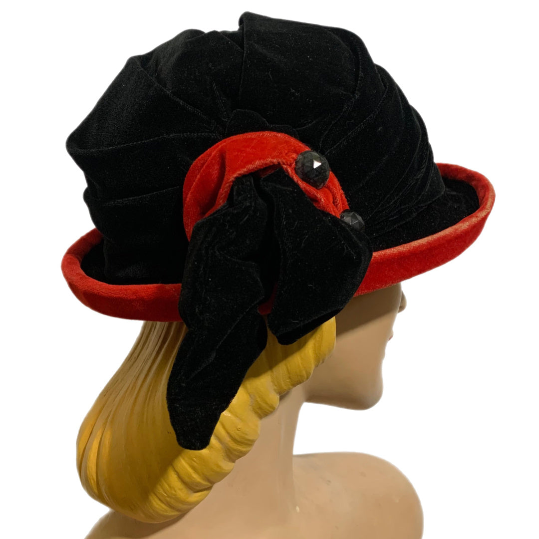 Black Velvet Curved Brim Hat with Tomato Red Accents circa 1910s