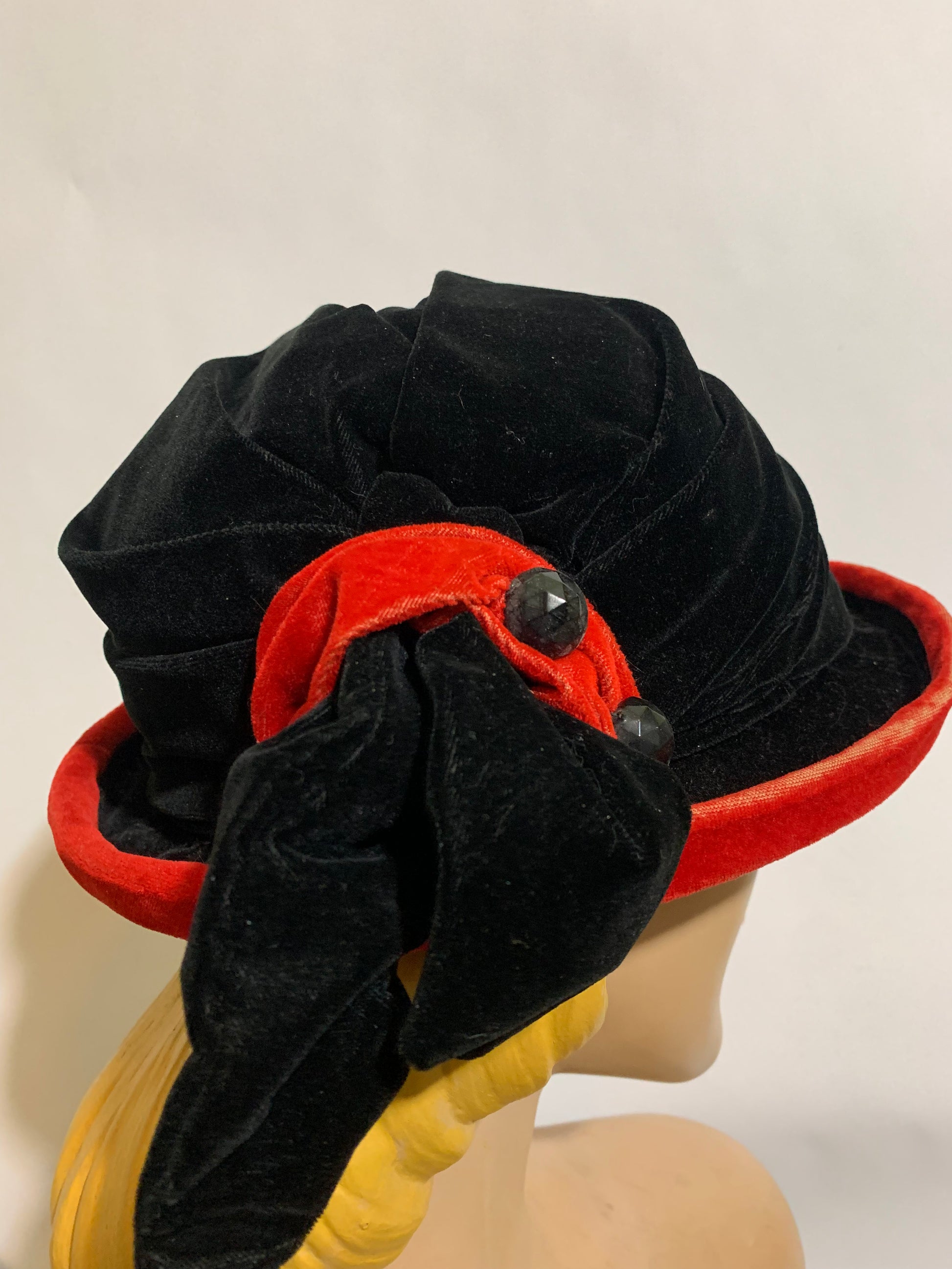 Black velvet Edwardian hat with tomato red accent wing and button detail, small curved brim. Lined in silk. No label, no flaws. Size 21.5.