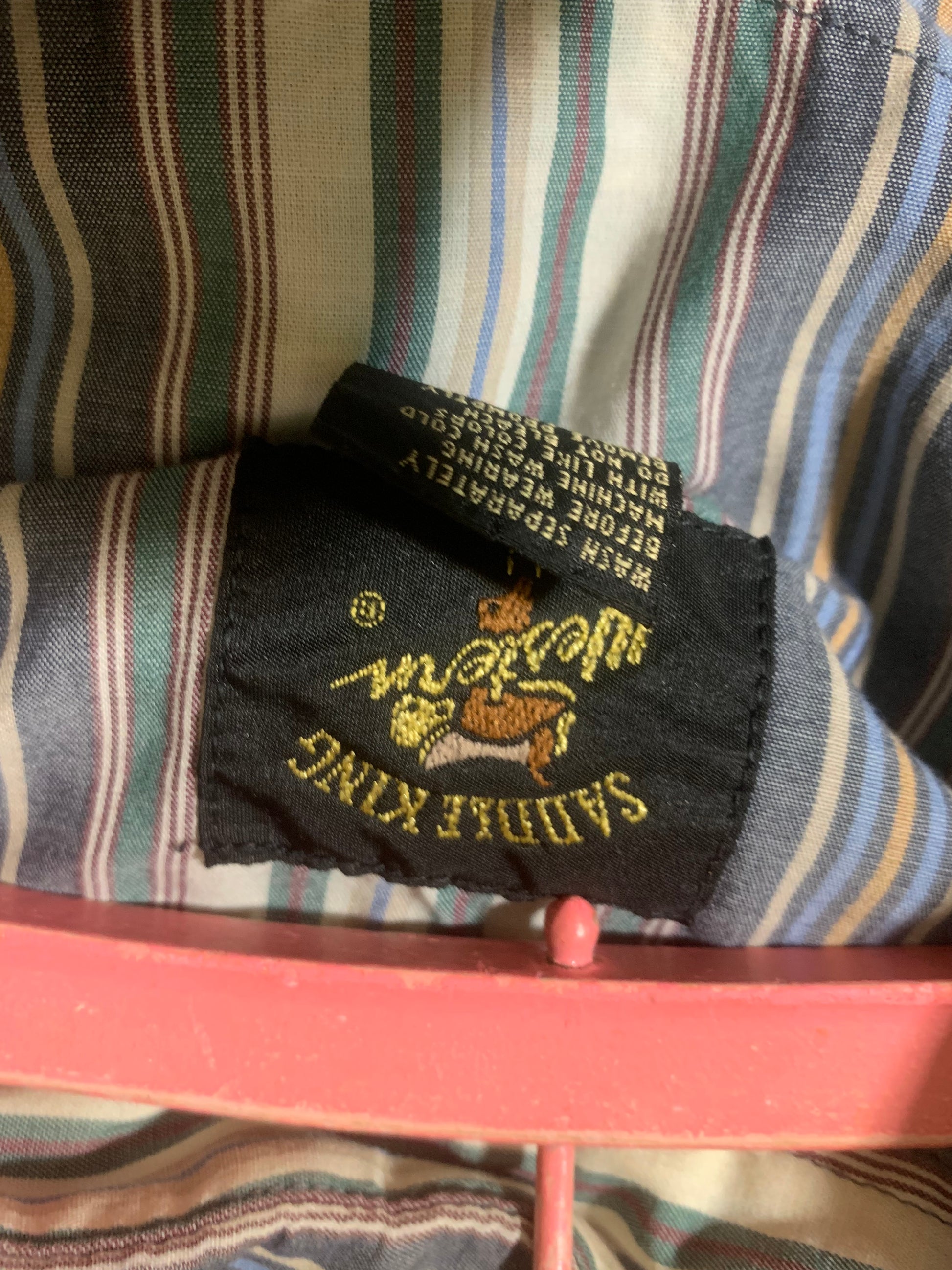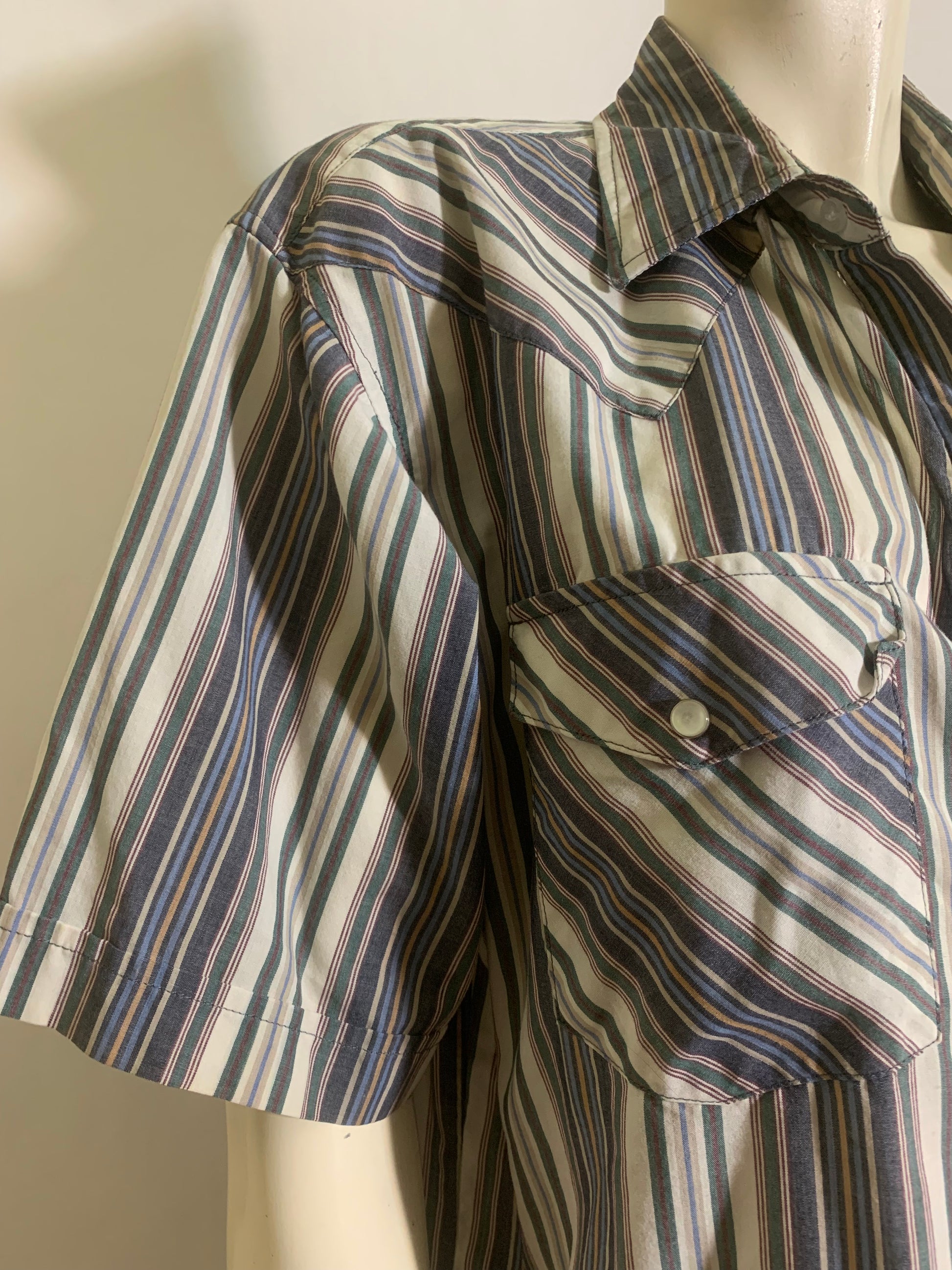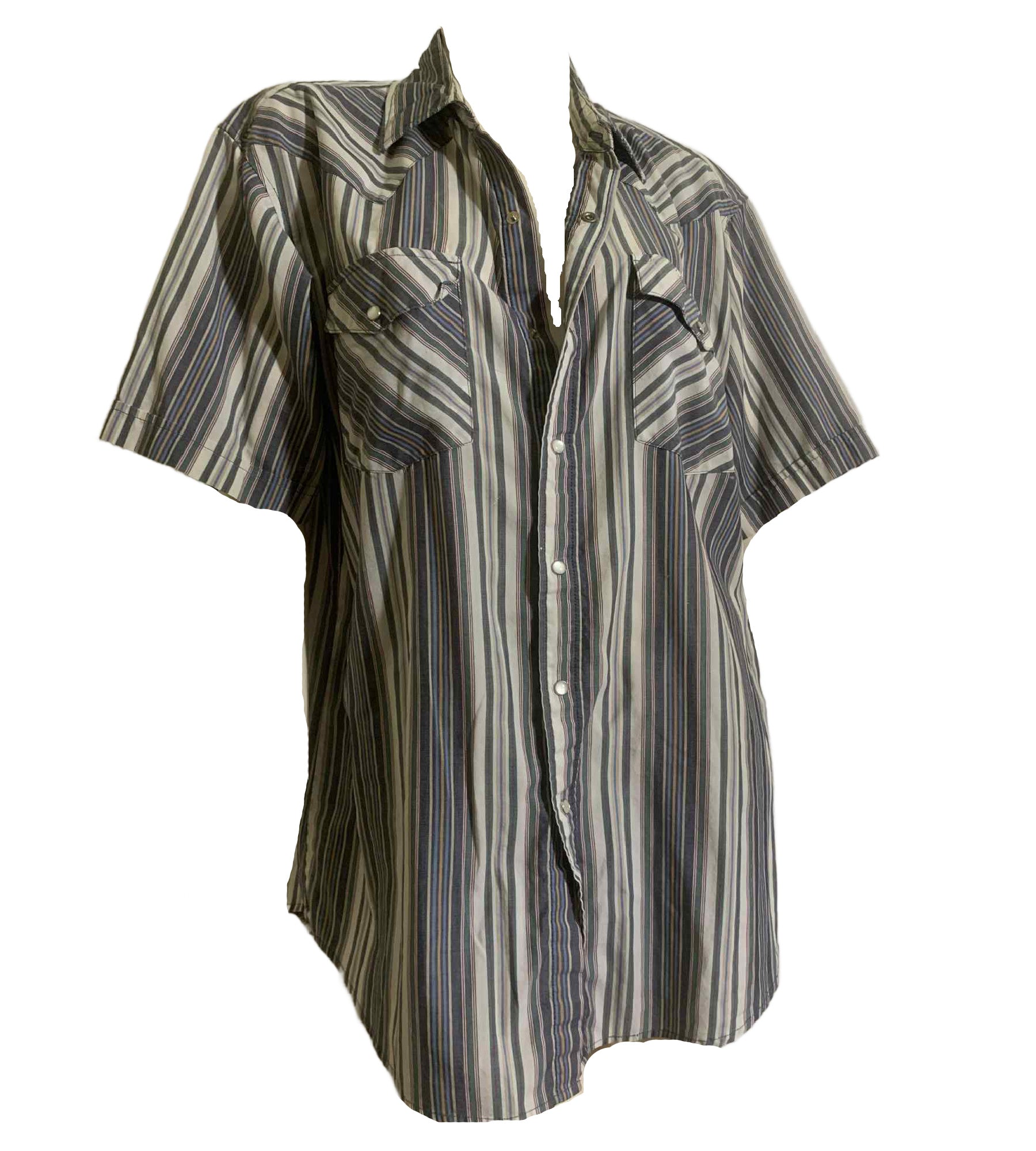 White, blue, red and green snap front western shirt by Saddle River. Cotton. No flaws.
