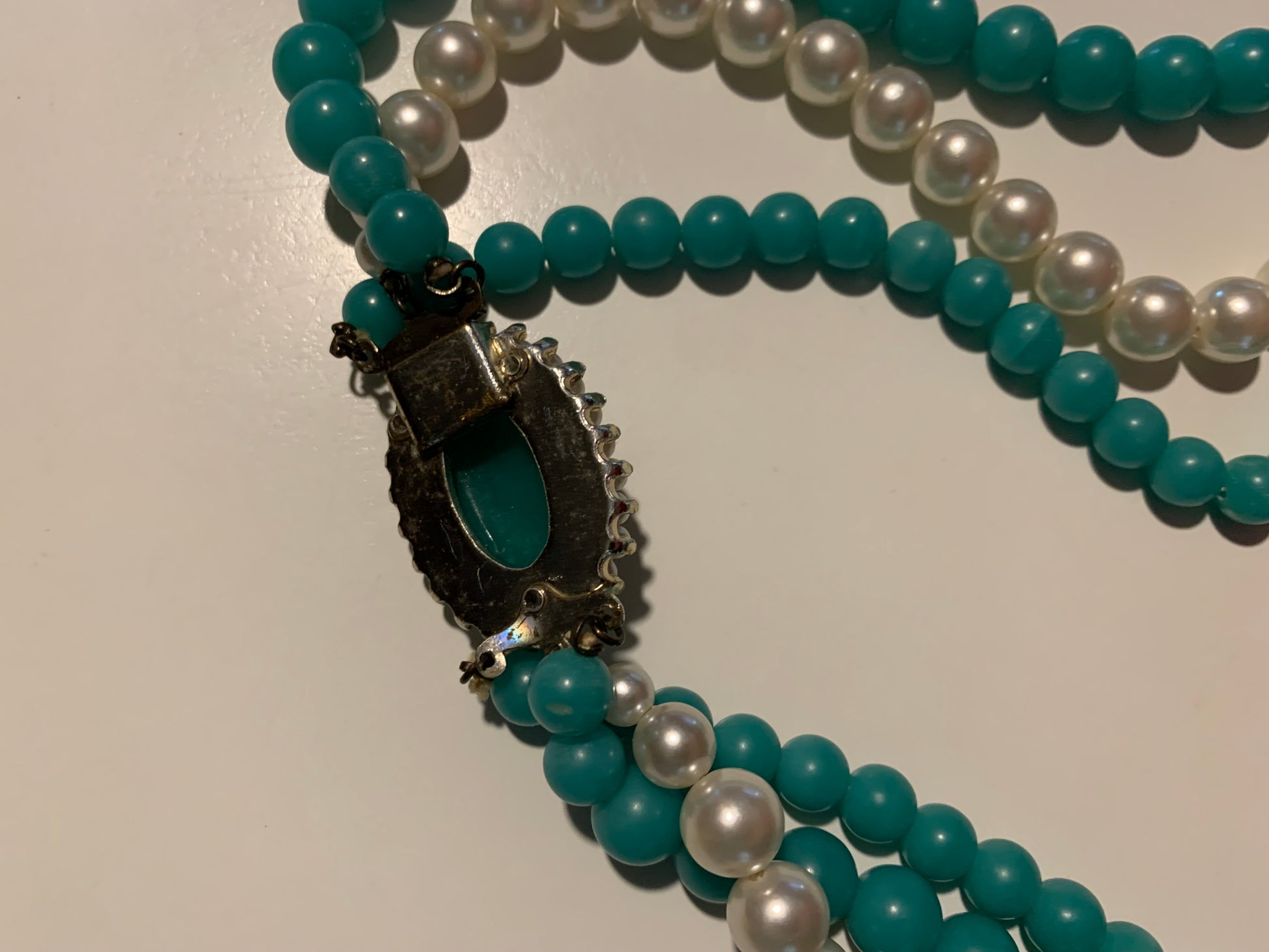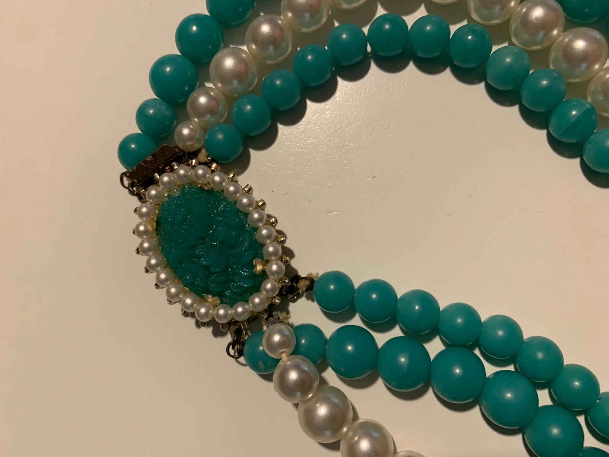 Bright seafoam green and faux pearl triple strand bead necklace with big decorative clasp. No markings, no flaws. 16" around, 1 1/2" clasp.