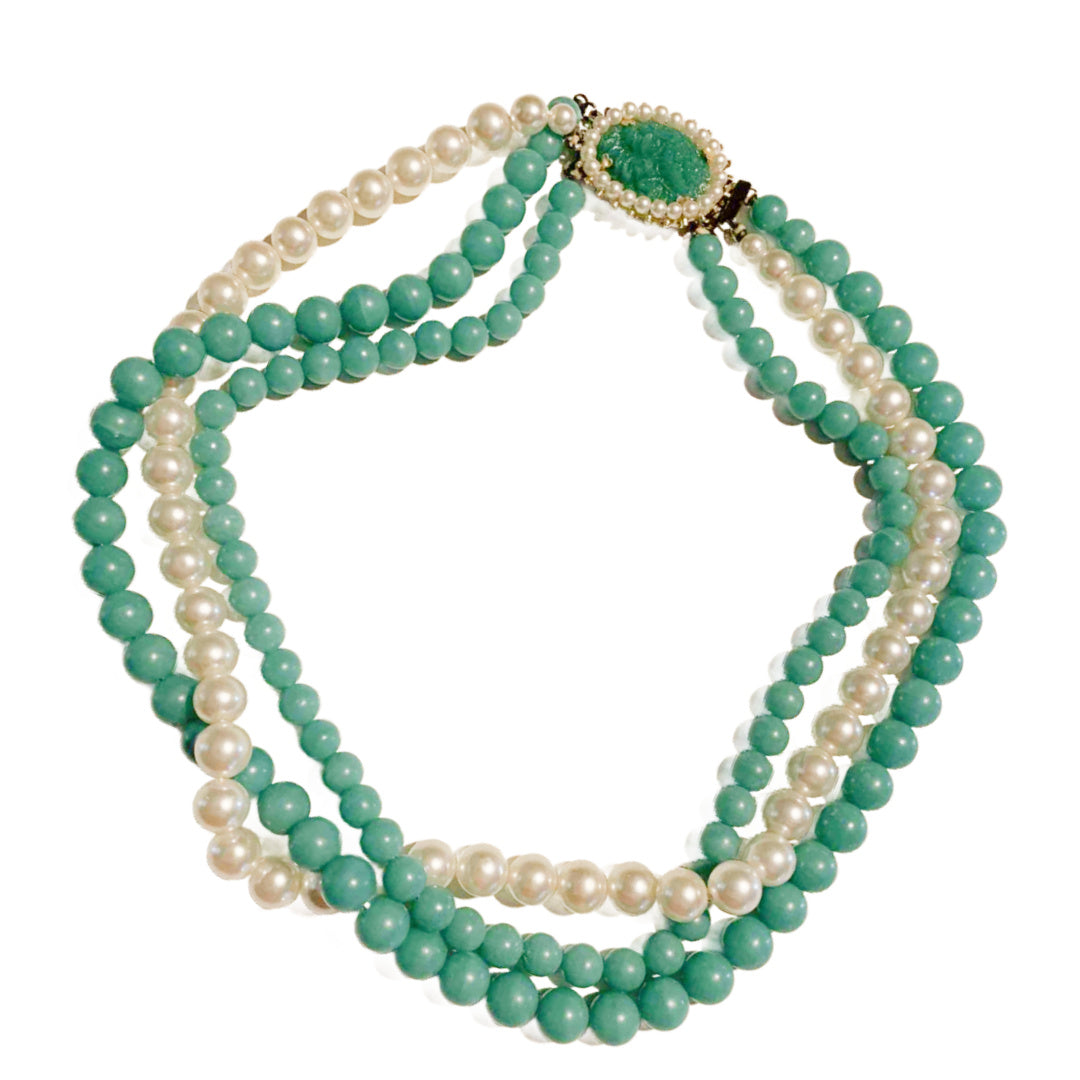 Bright Seafoam Green and Faux Pearl Triple Strand Necklace circa 1960s