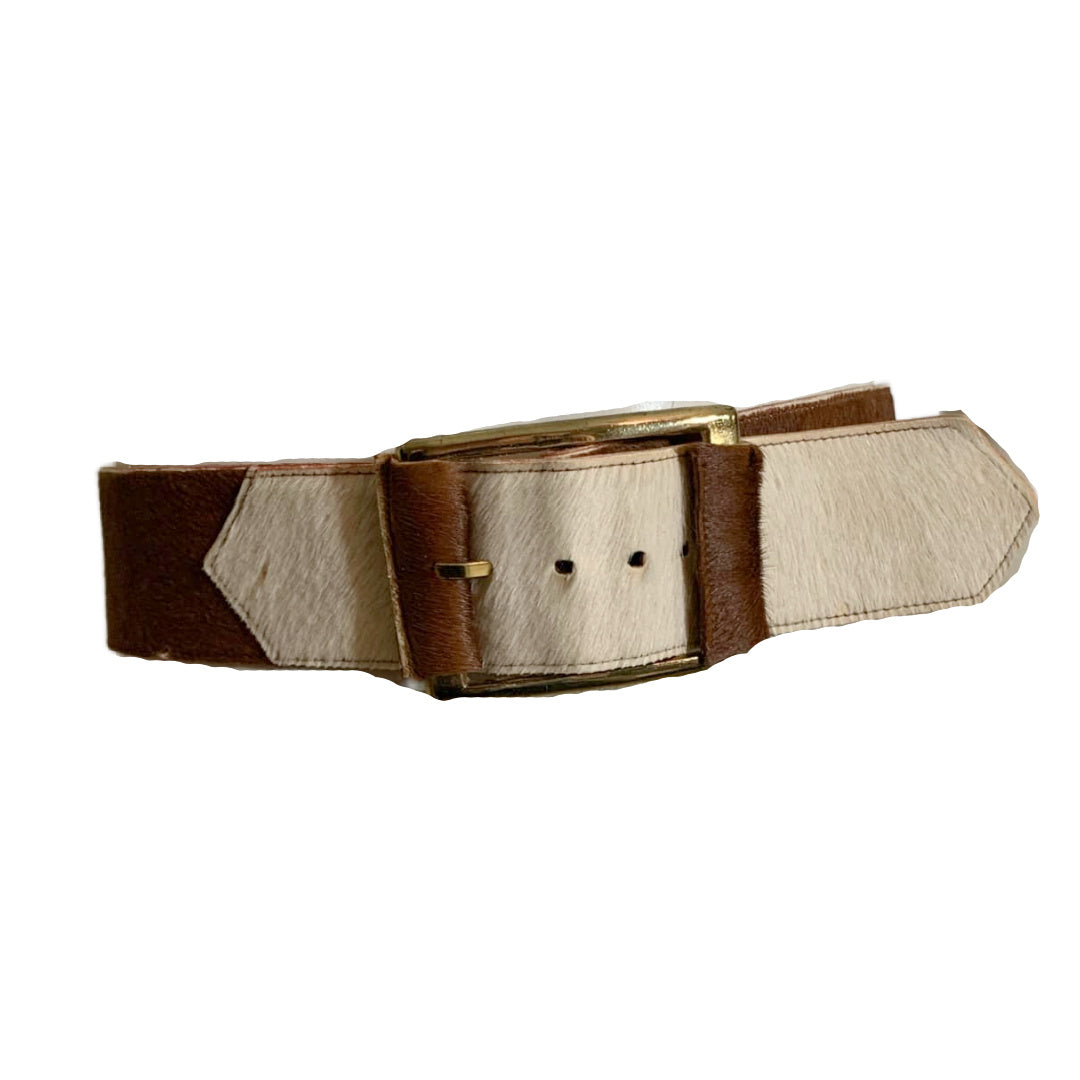 Brown and white leather cowhide hair belt from the 1970s. No flaws.