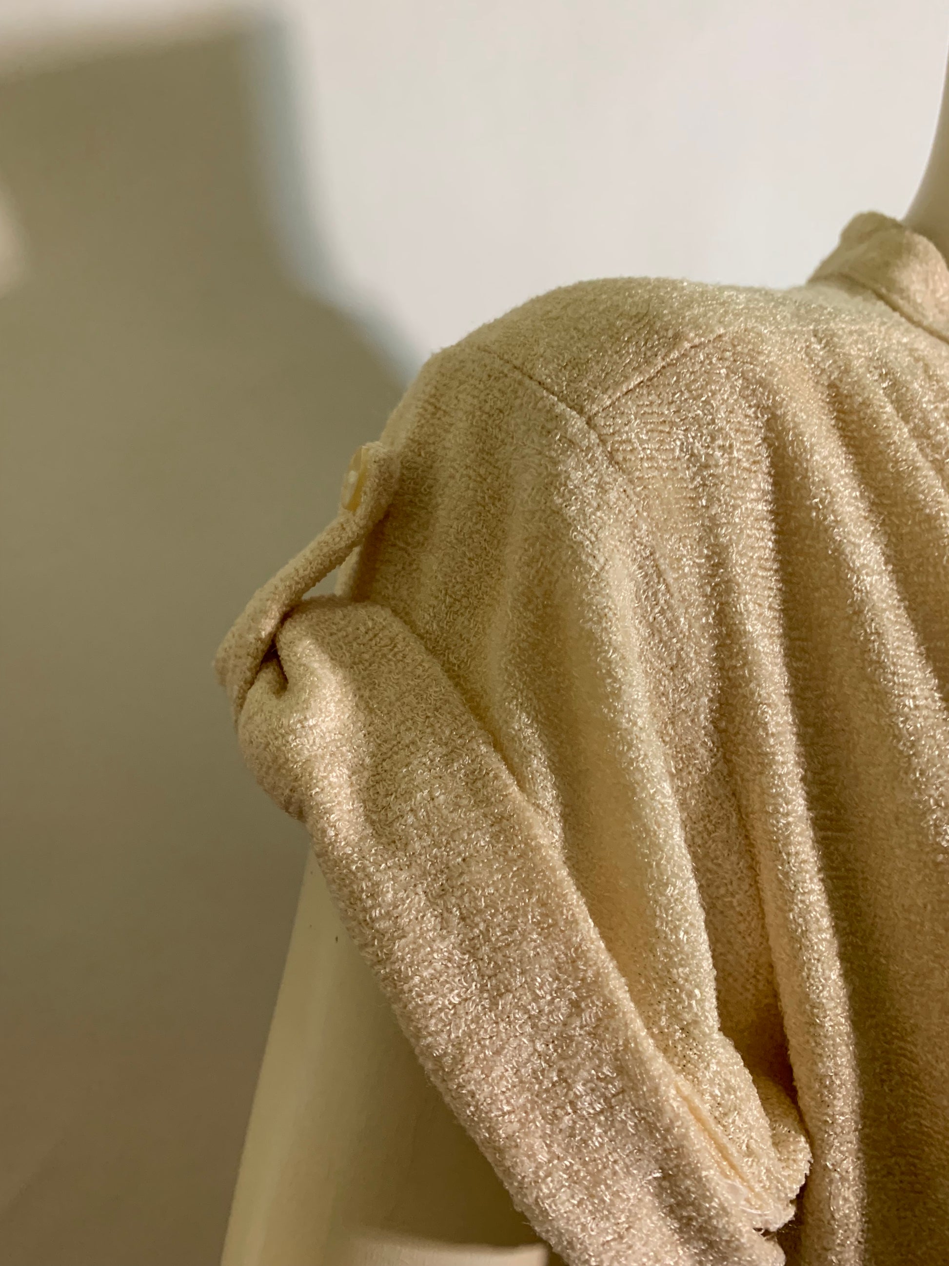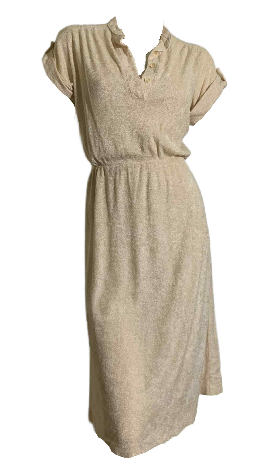 1970s butter cream terry cloth 1970s dress with tabbed cuffed sleeves, button neckline. Missing sash. No label, no flaws.