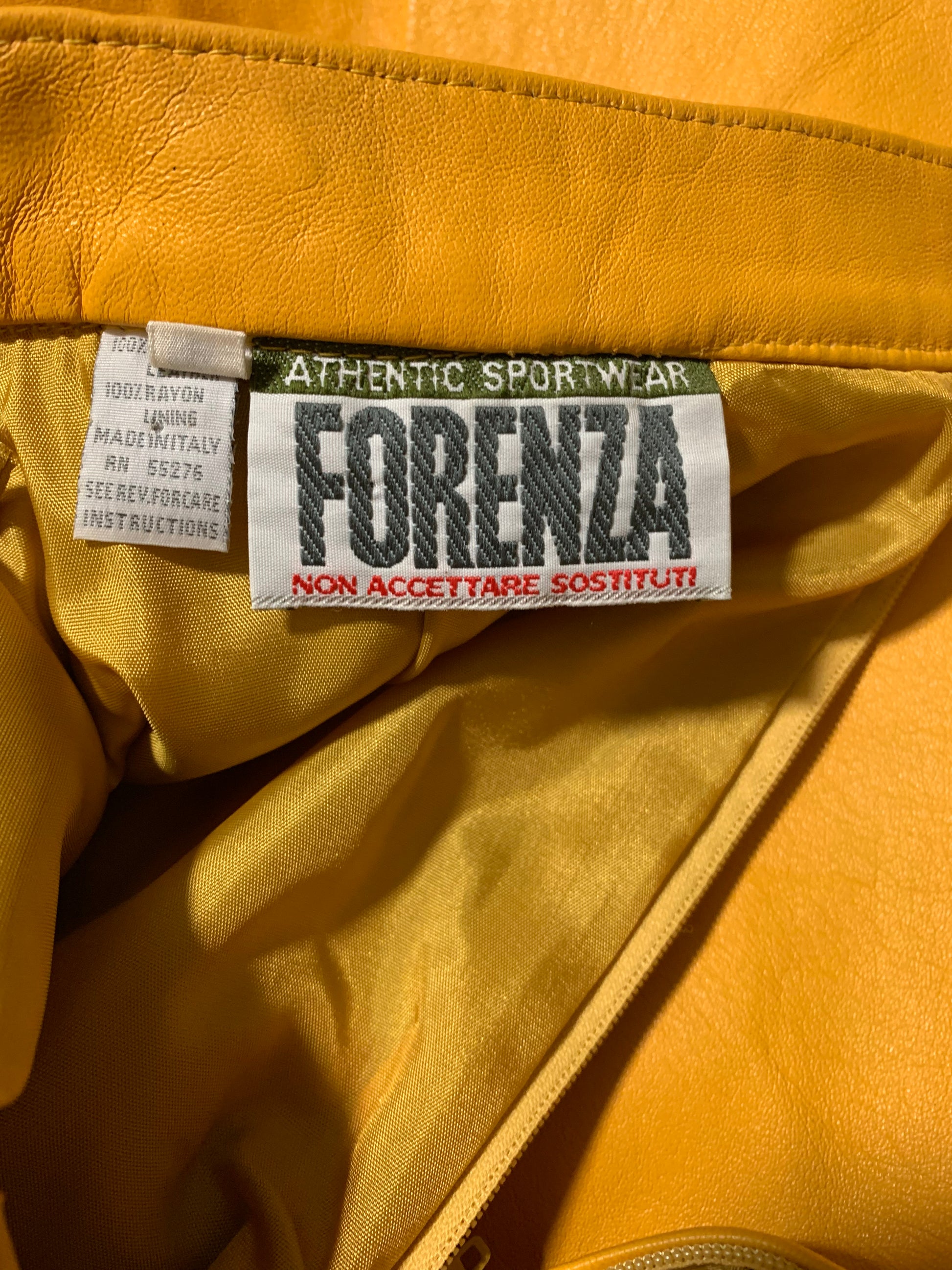 Forenza 1980s butter yellow leather pencil skirt with back slit, snap and zipper closure center back. Lined. By FORENZA! Has hanger dents at waist (cleaned with leather cleaner after photos- no discoloration).