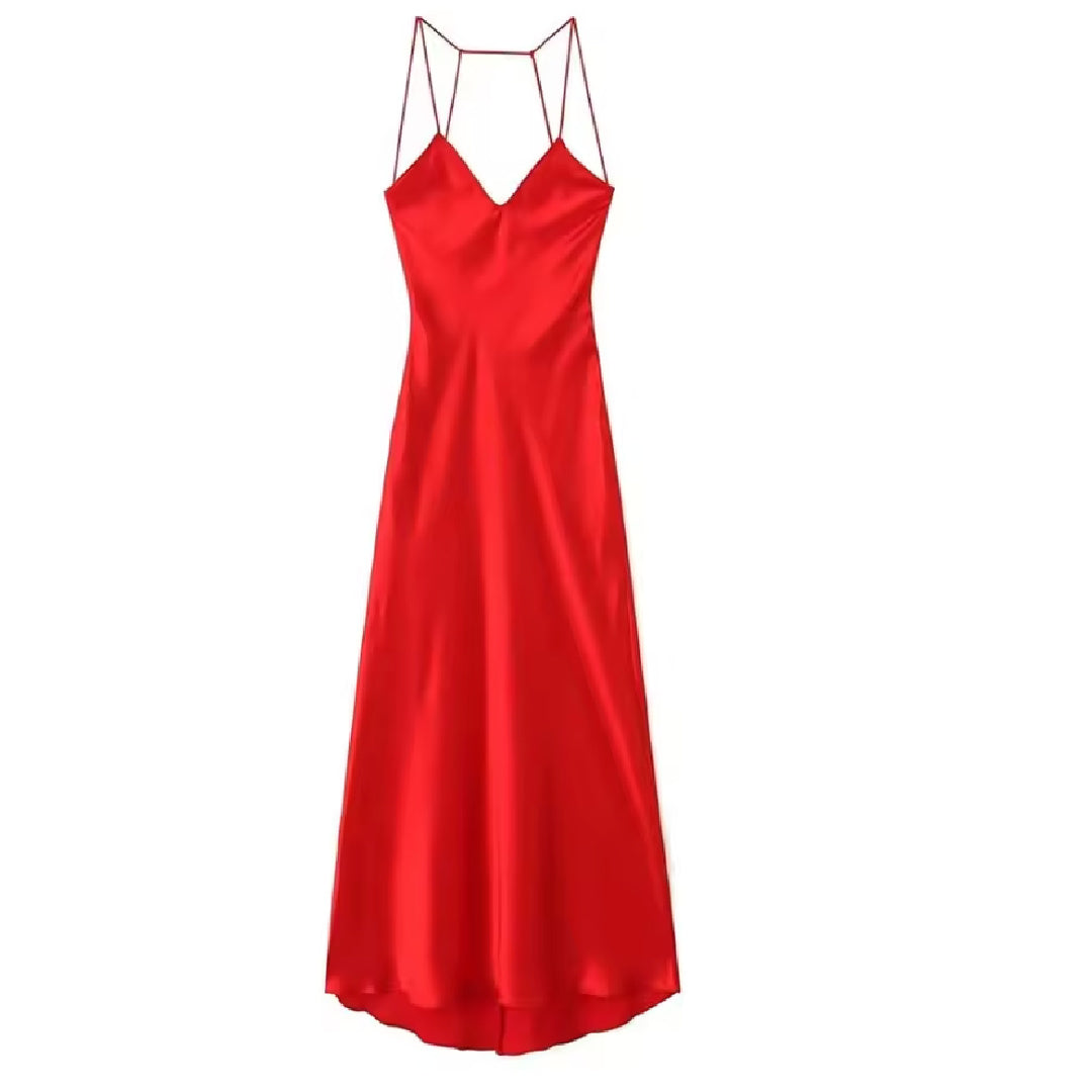 Cherry poly satin slip style 1930s inspired strappy dress with low back. Tea length. Unlined. Modern, 2-3 week delivery.