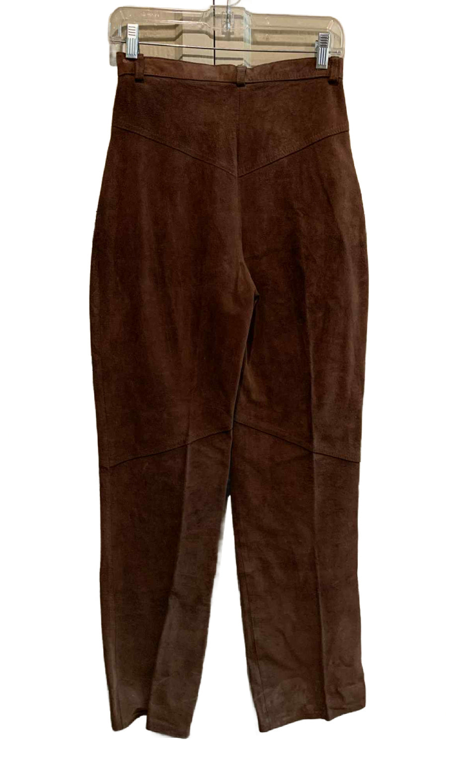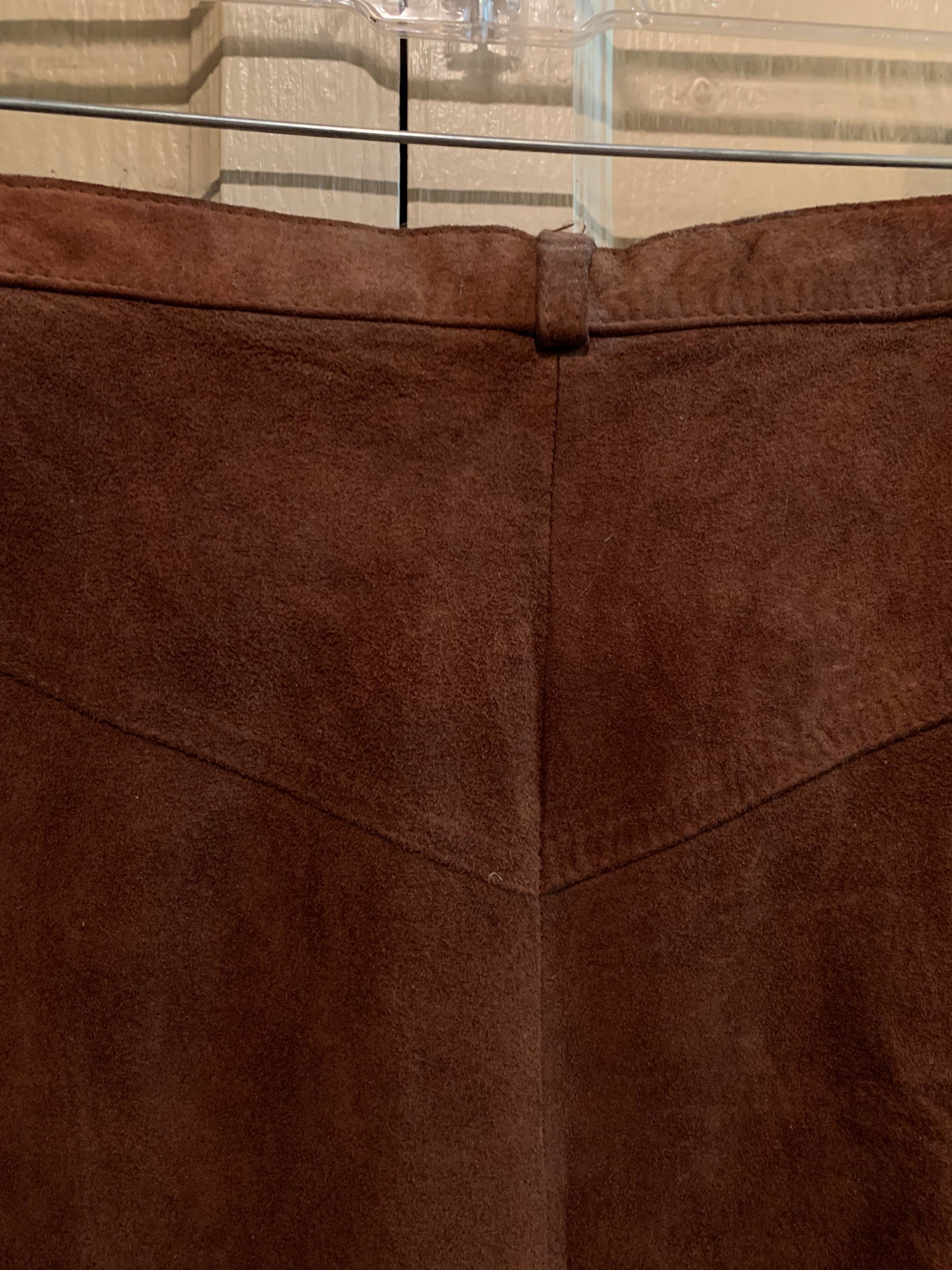 Chocolate suede leather high waist pants. Hip pockets, snap waist with zipper front. Angled seaming above knees. Lined. Hanger dents in 4 places around waist. No stains or holes.