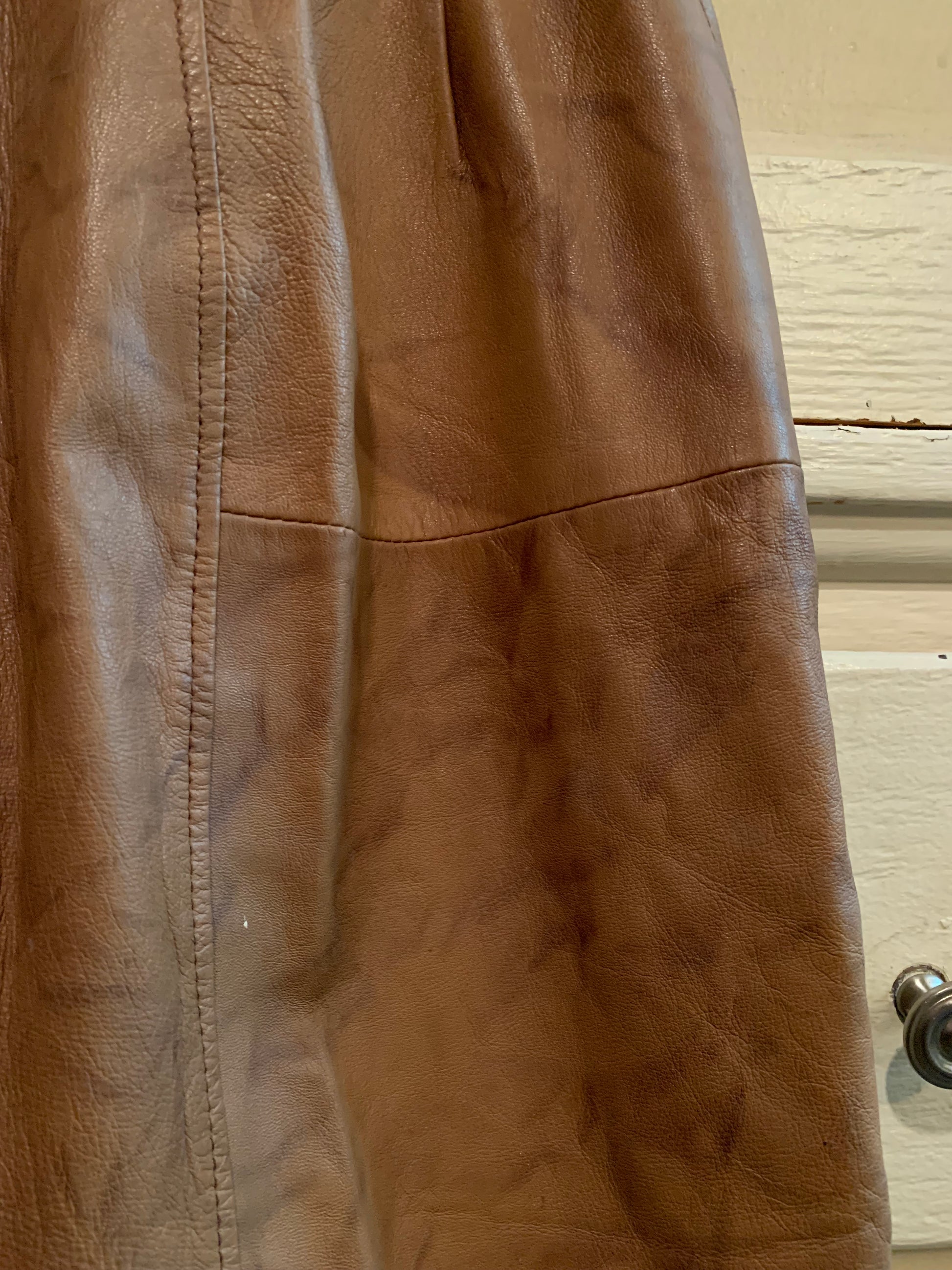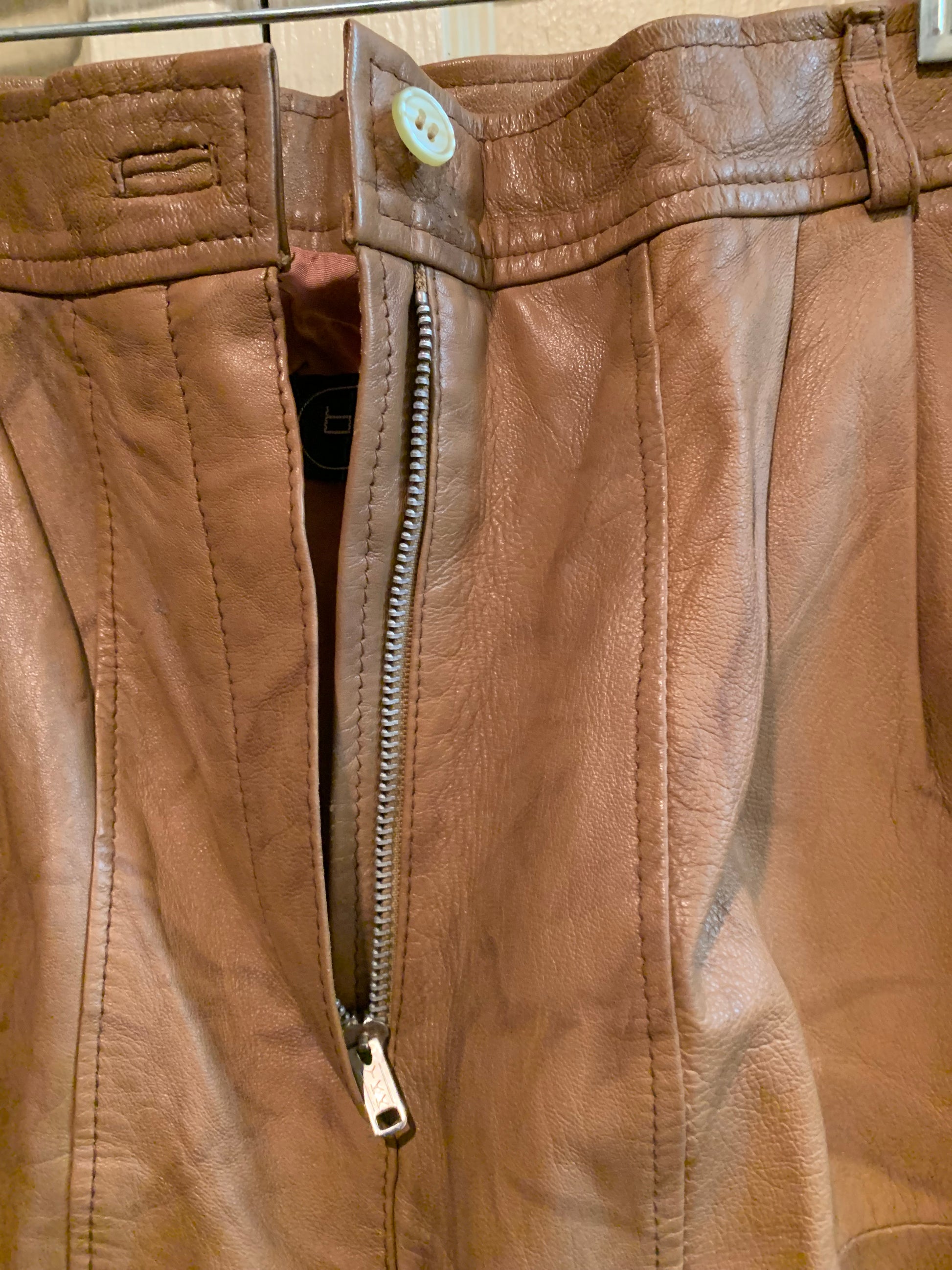 Caramel and cocoa marbled leather high waist pants. Hip pockets, snap waist with zipper front. . Hanger dents in 4 places around waist. No stains or holes.
