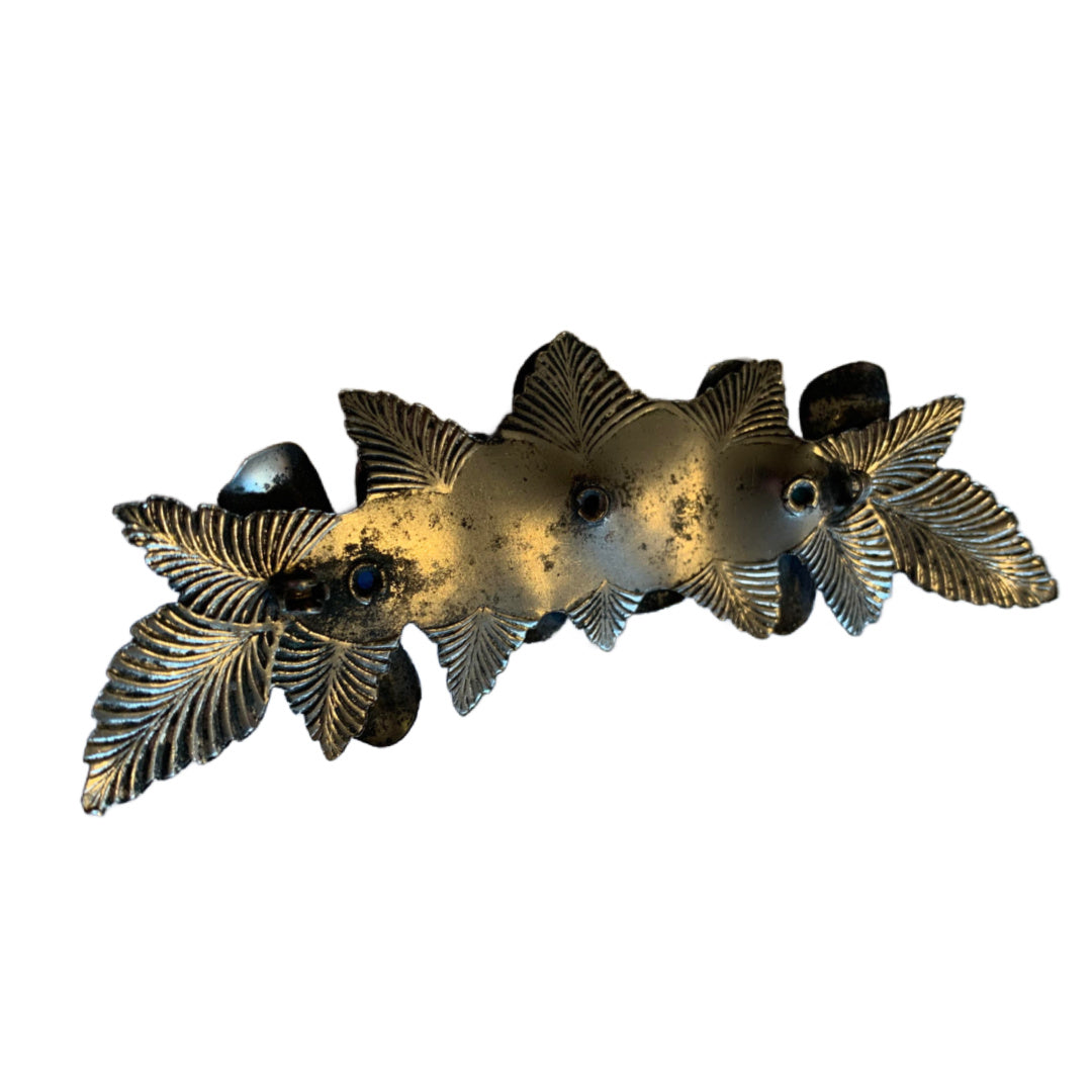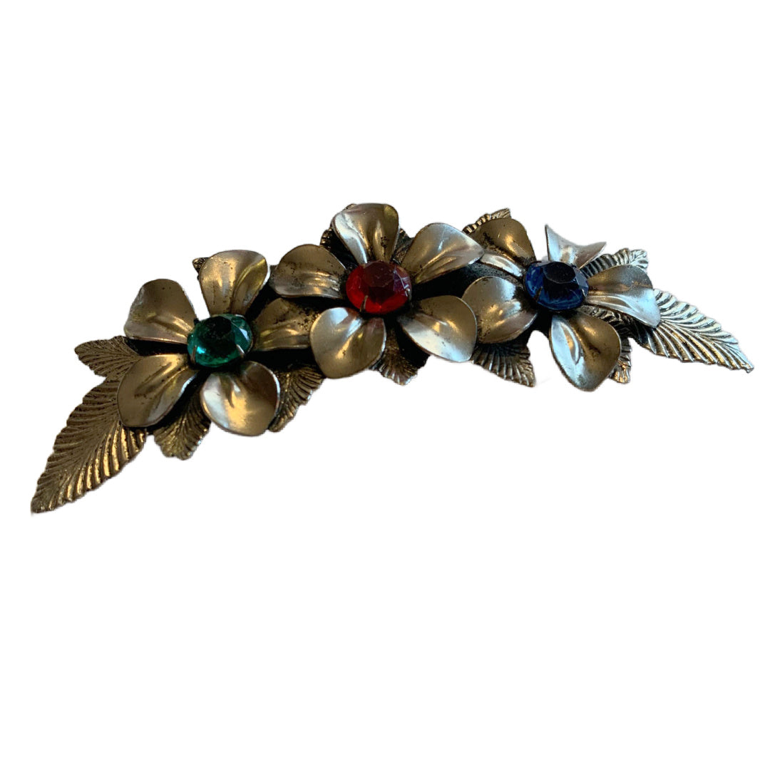 4 1/8" long, 1 1/2" wide etched silver garland brooch with colored glass- missing pin, could be repaired or sewn onto project. No markings.