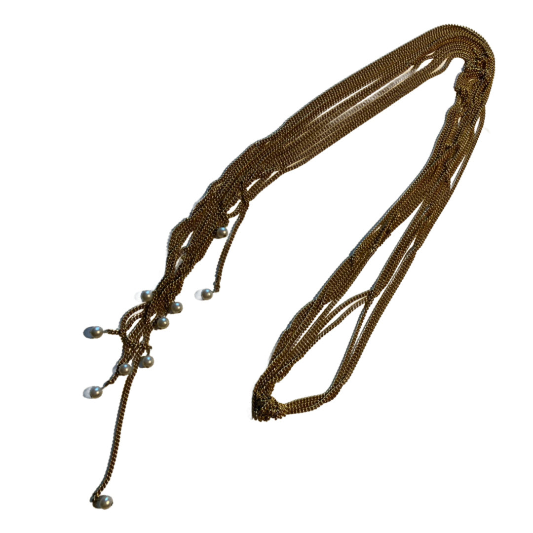 Multistrand gold tone chain sautoir style necklace (could also be worn at waist)- 66" around at longest point. Knotted at middle of chains, small faux pearl accents at ends. A glorious, versatile piece of 1960s costume jewelry .