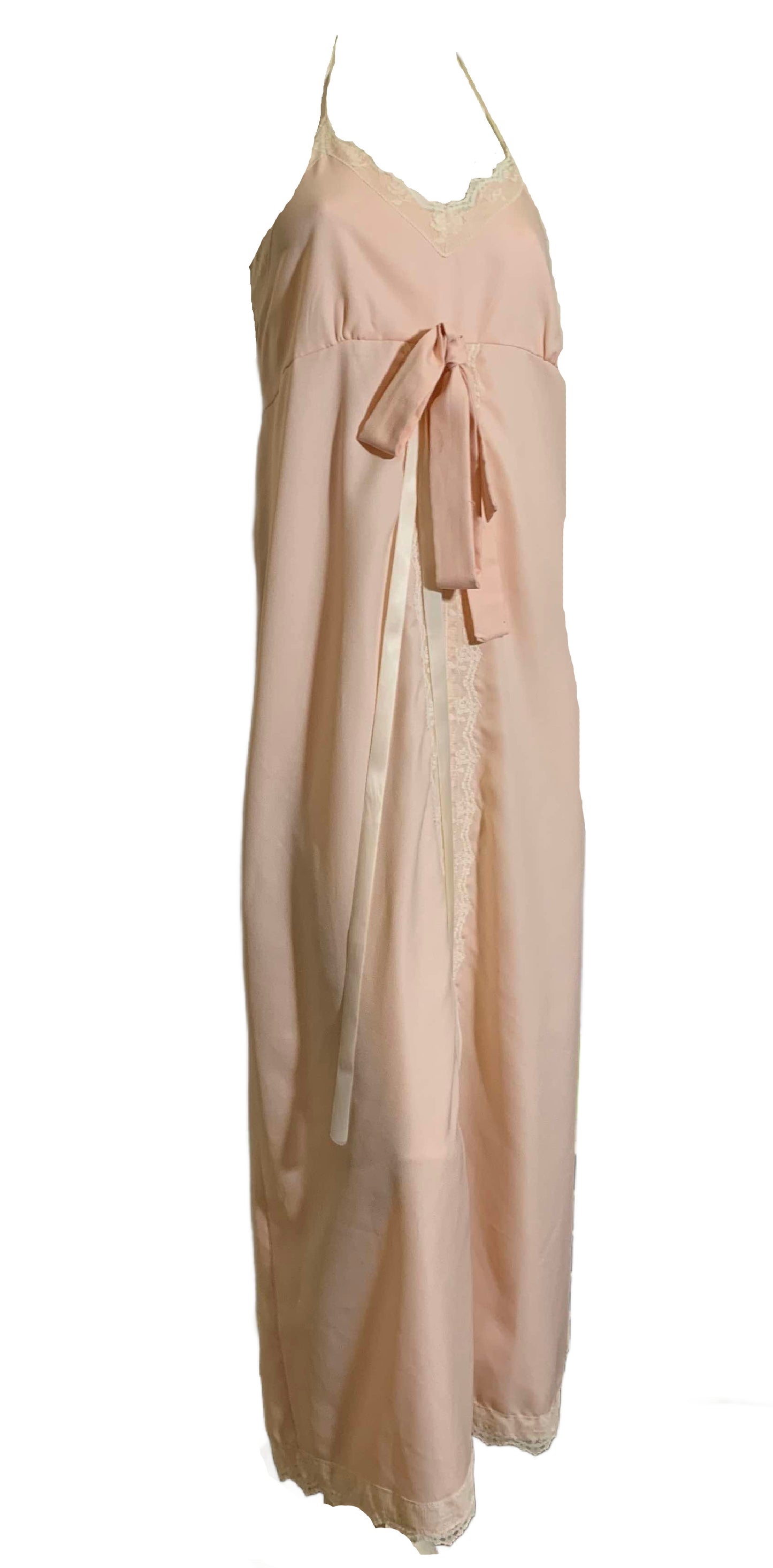 Demure Pale Peach Crepe Poly Halter Dress with Lace Trim circa 1970s