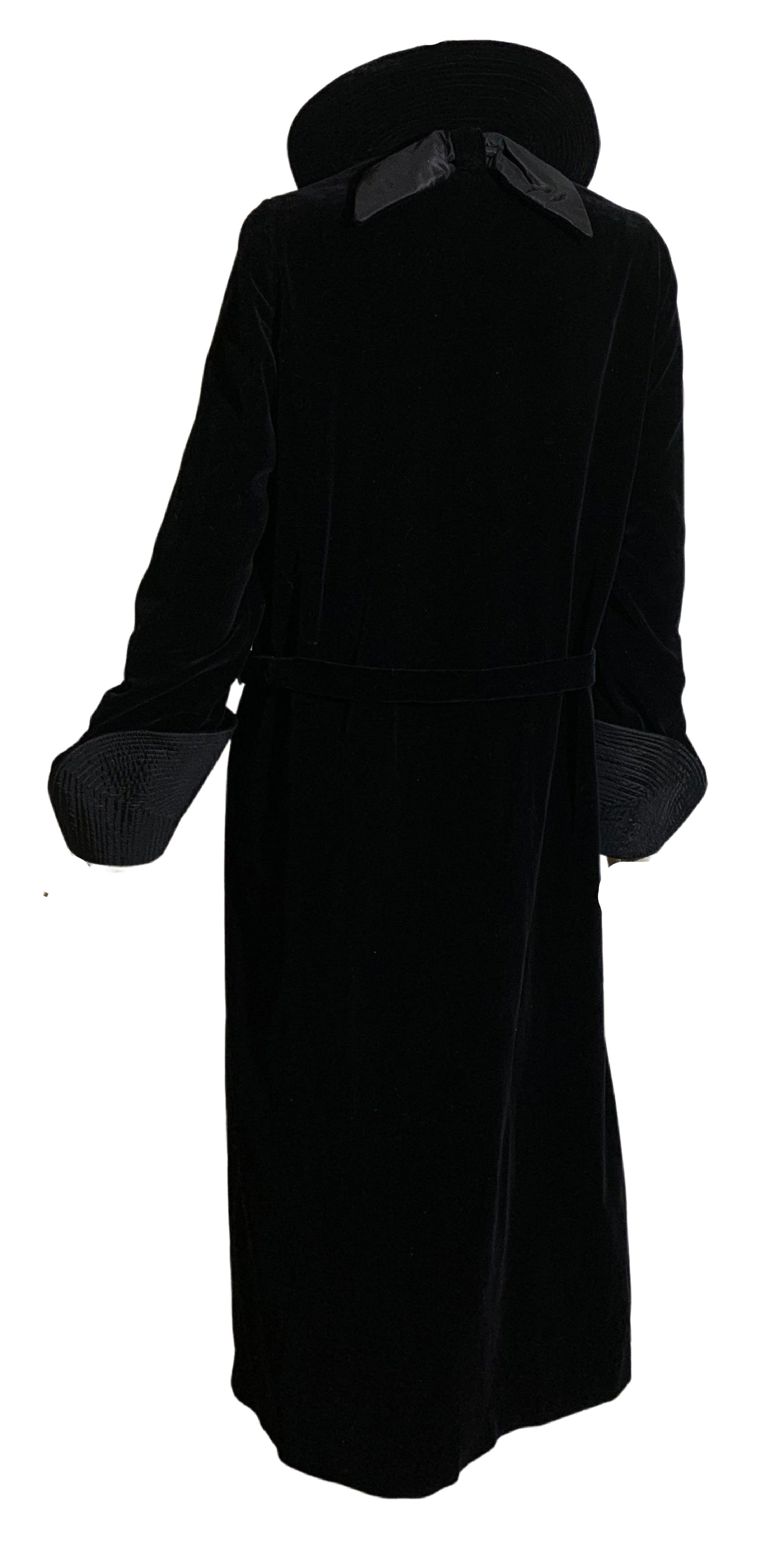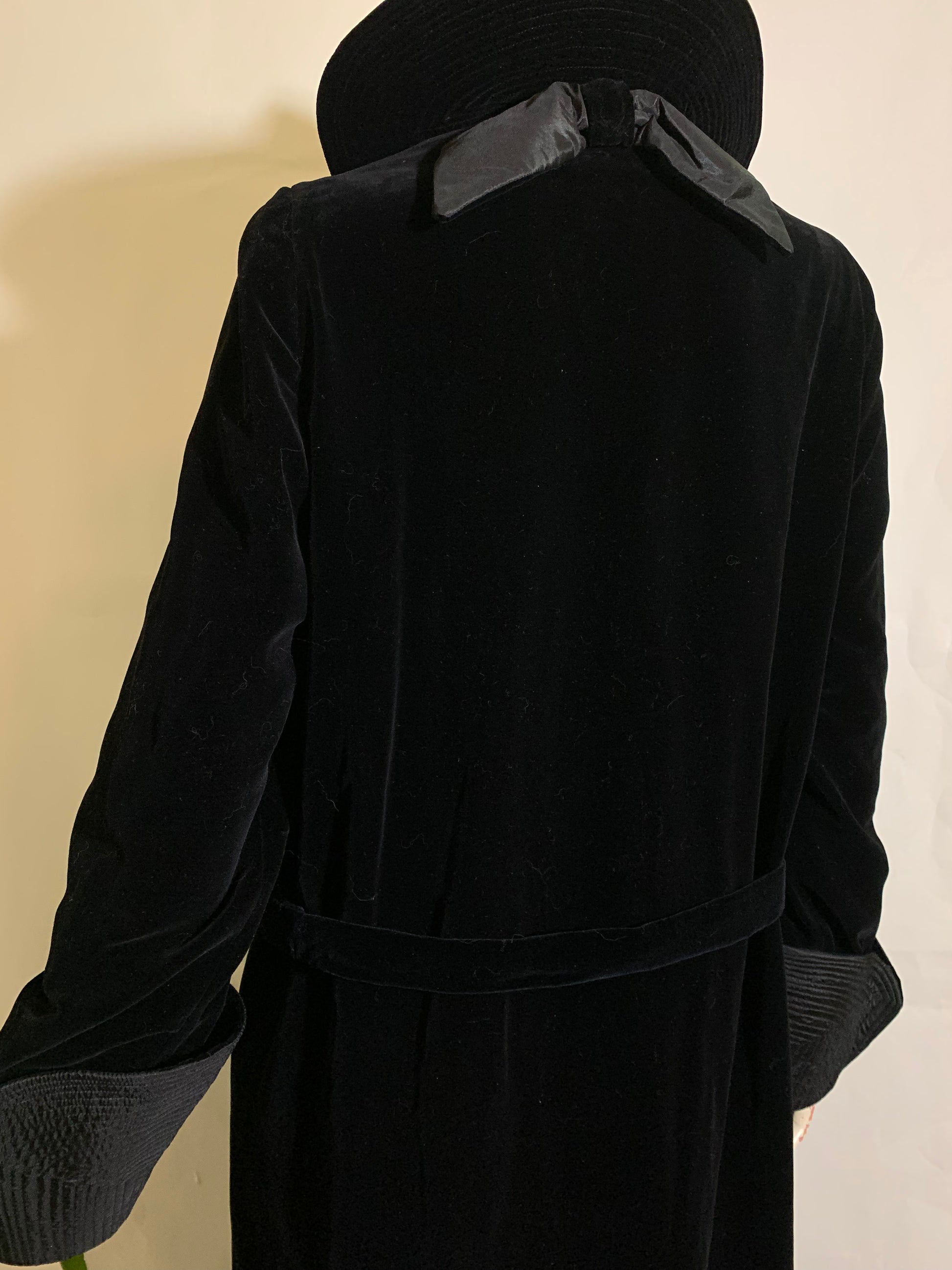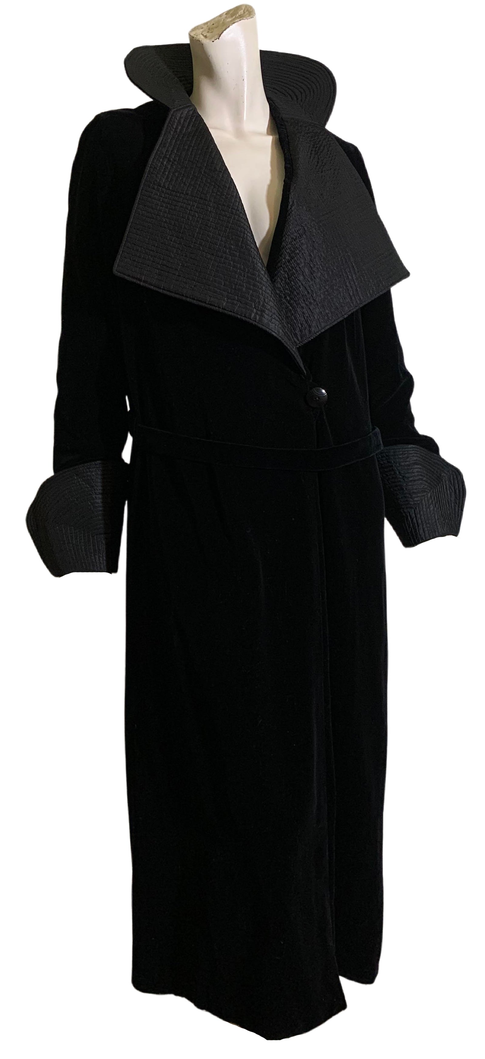 Divine black cotton velvet 1910s coat with dramatic trapunto padded stand up collar and bold, wide cuffs (almost in an Art Deco design). Deep front neckline, one button closure- inside has velvet loop and silk ribbon closure as well. Fully lined in black silk. Absolutely flawless- appears never worn!