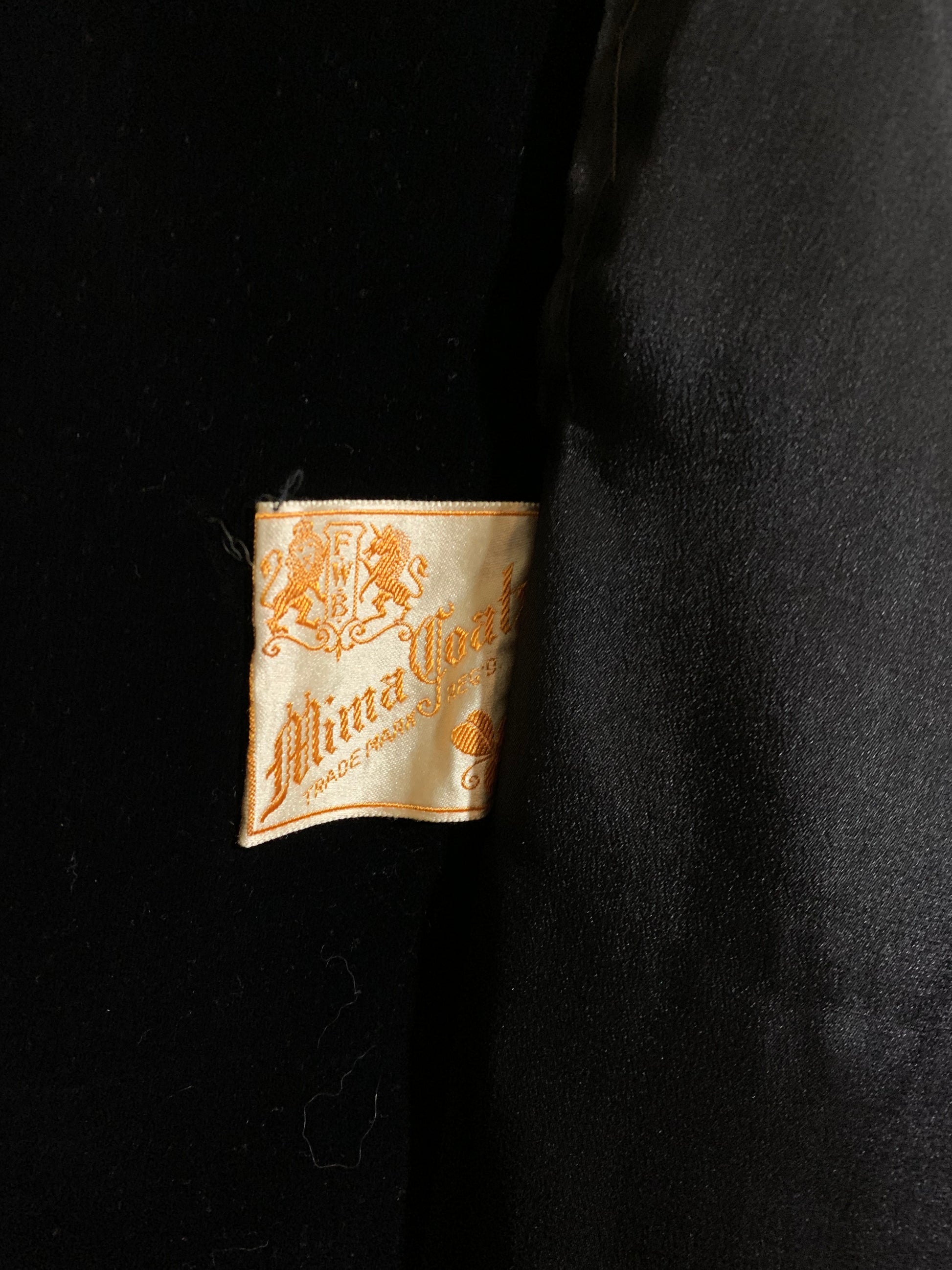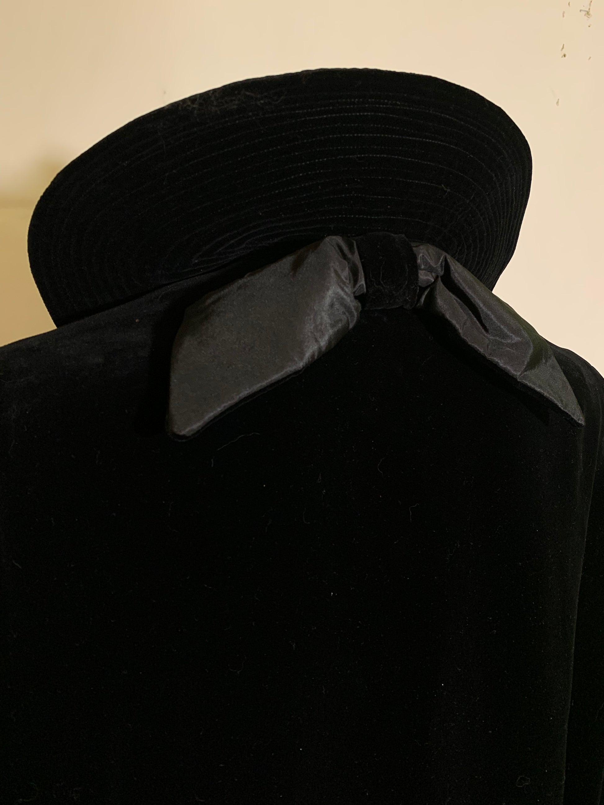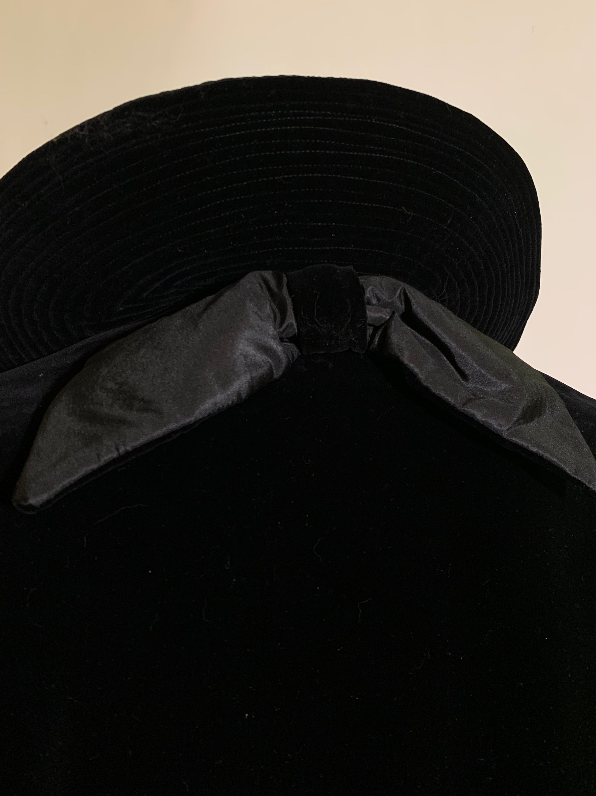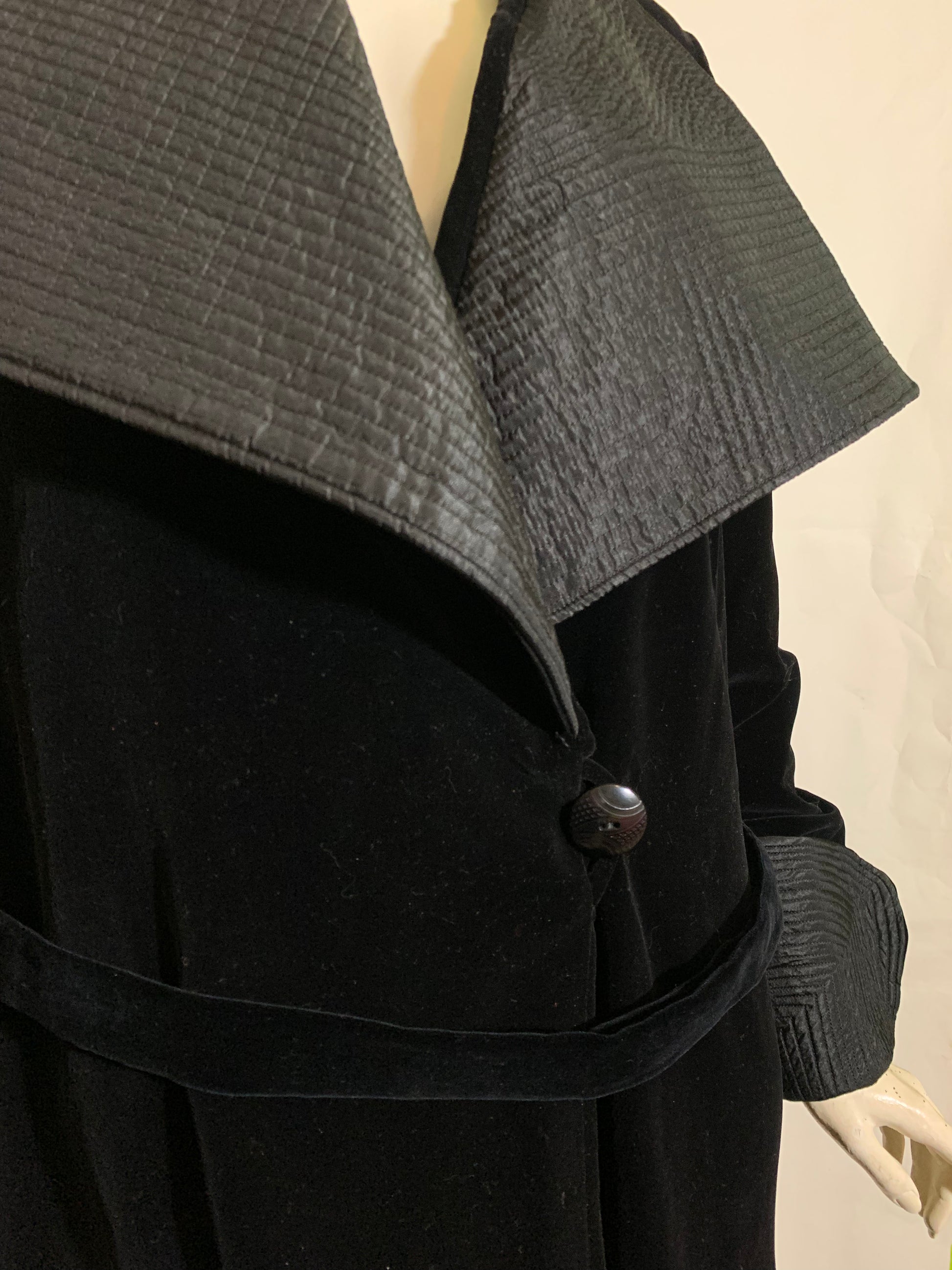 Divine black cotton velvet 1910s coat with dramatic trapunto padded stand up collar and bold, wide cuffs (almost in an Art Deco design). Deep front neckline, one button closure- inside has velvet loop and silk ribbon closure as well. Fully lined in black silk. Absolutely flawless- appears never worn!