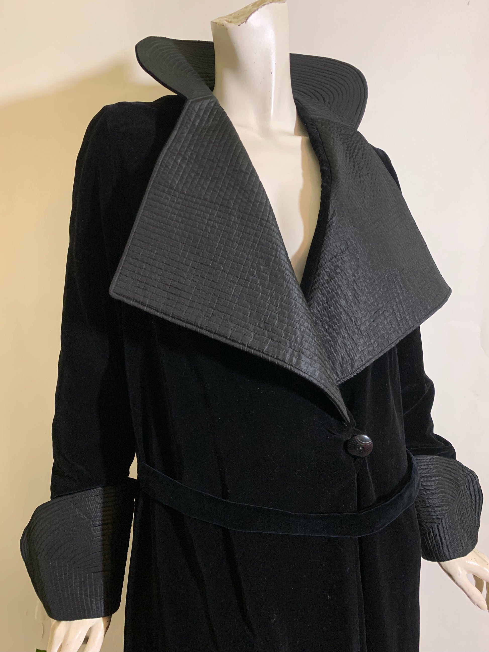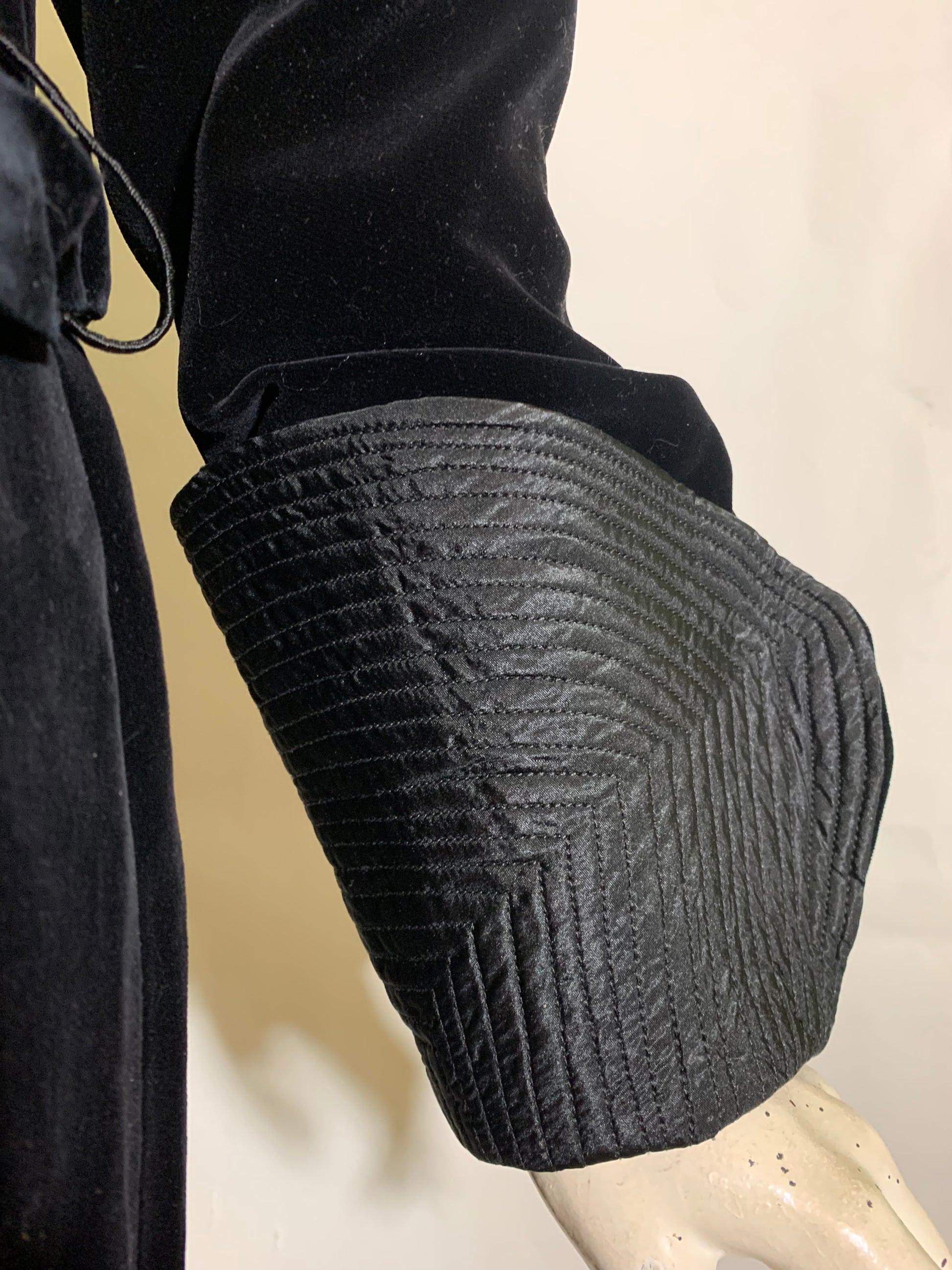 Ebony Black Cotton Velvet Coat with Trapunto Stitched Silk Stand Up Collar and Wide Cuffs circa Early 1900s