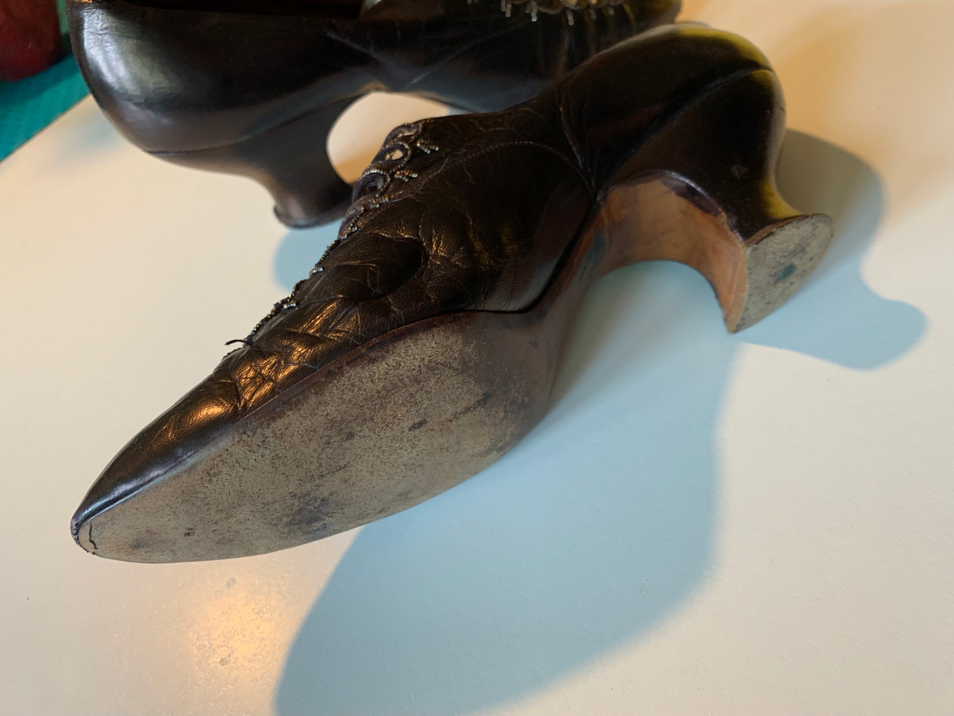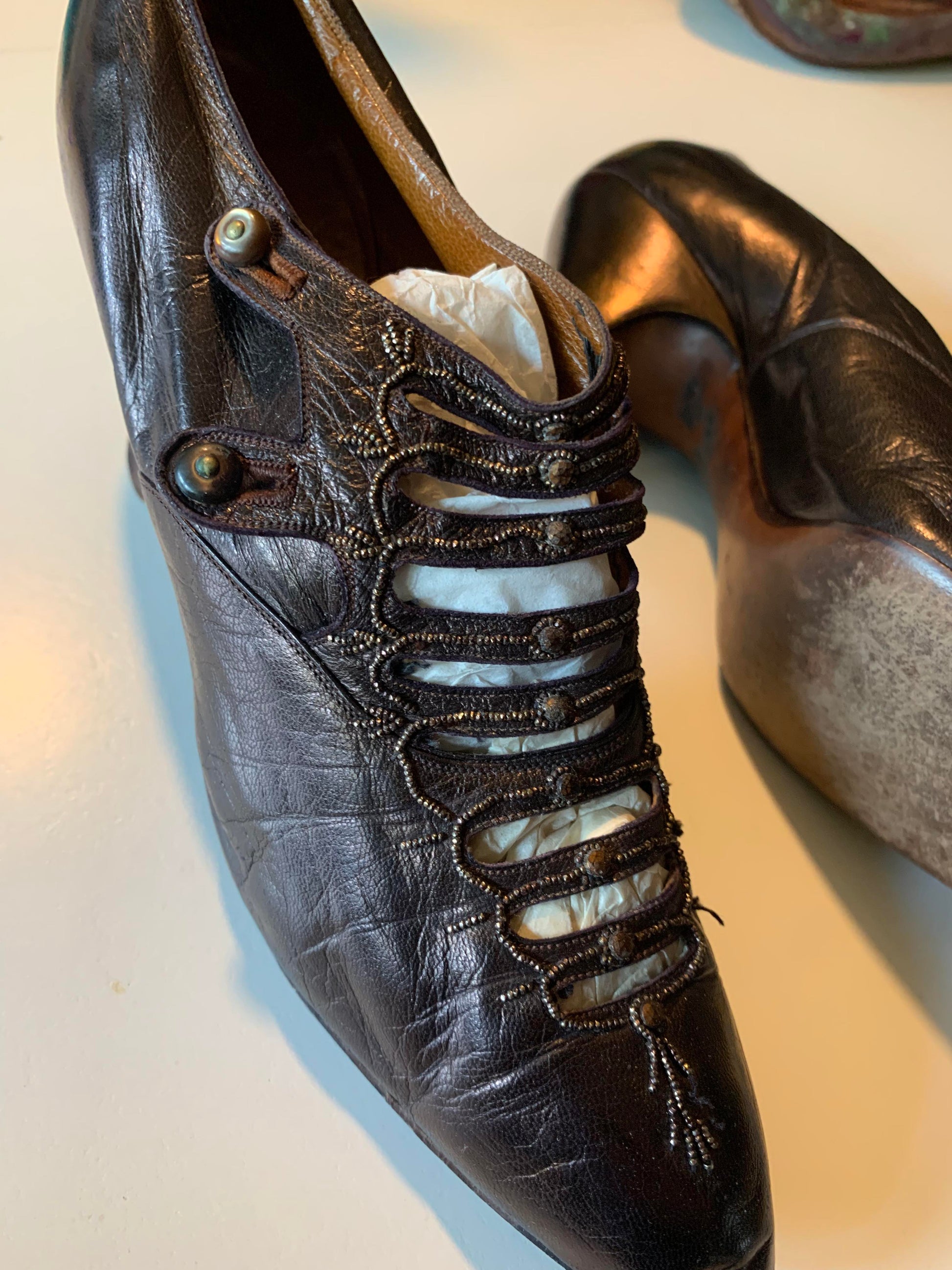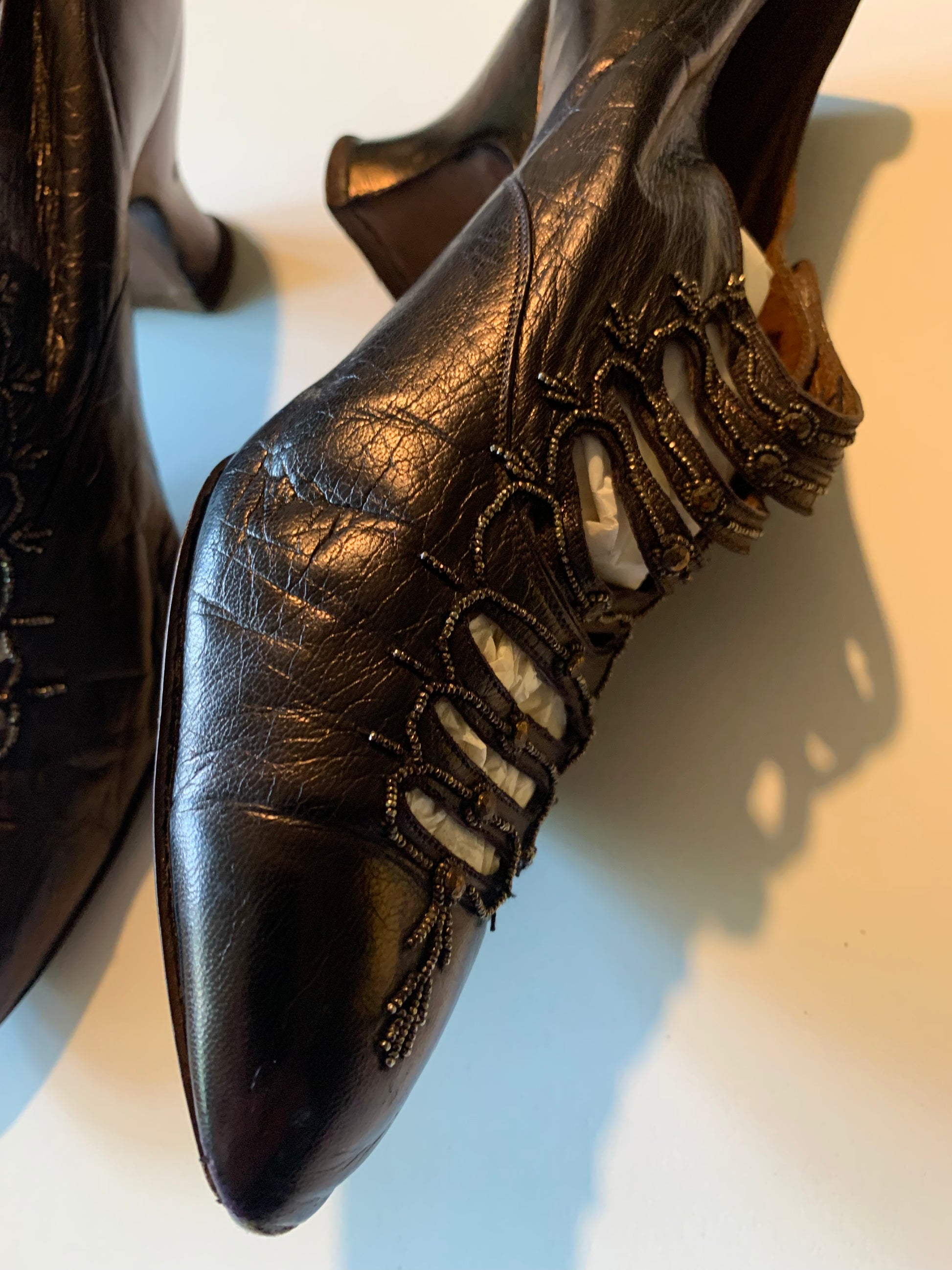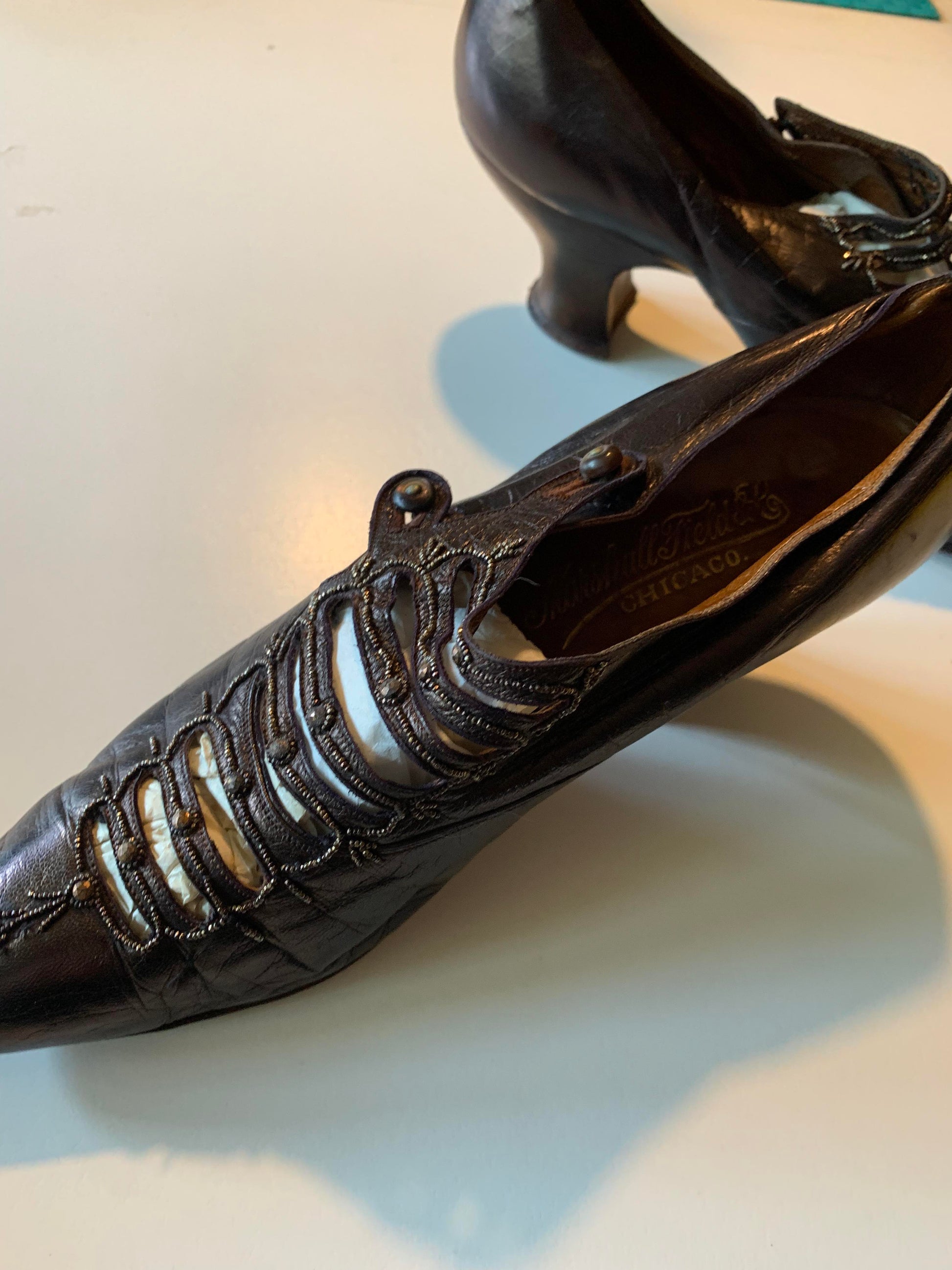 Gorgeous almost iridescent raisin colored kid leather early 1900s shoes with exquisite beading, button closure. Very minor wear. From Marshall Field and Co of Chicago. 8.5" long, 2 1/4" wide, 2" heel