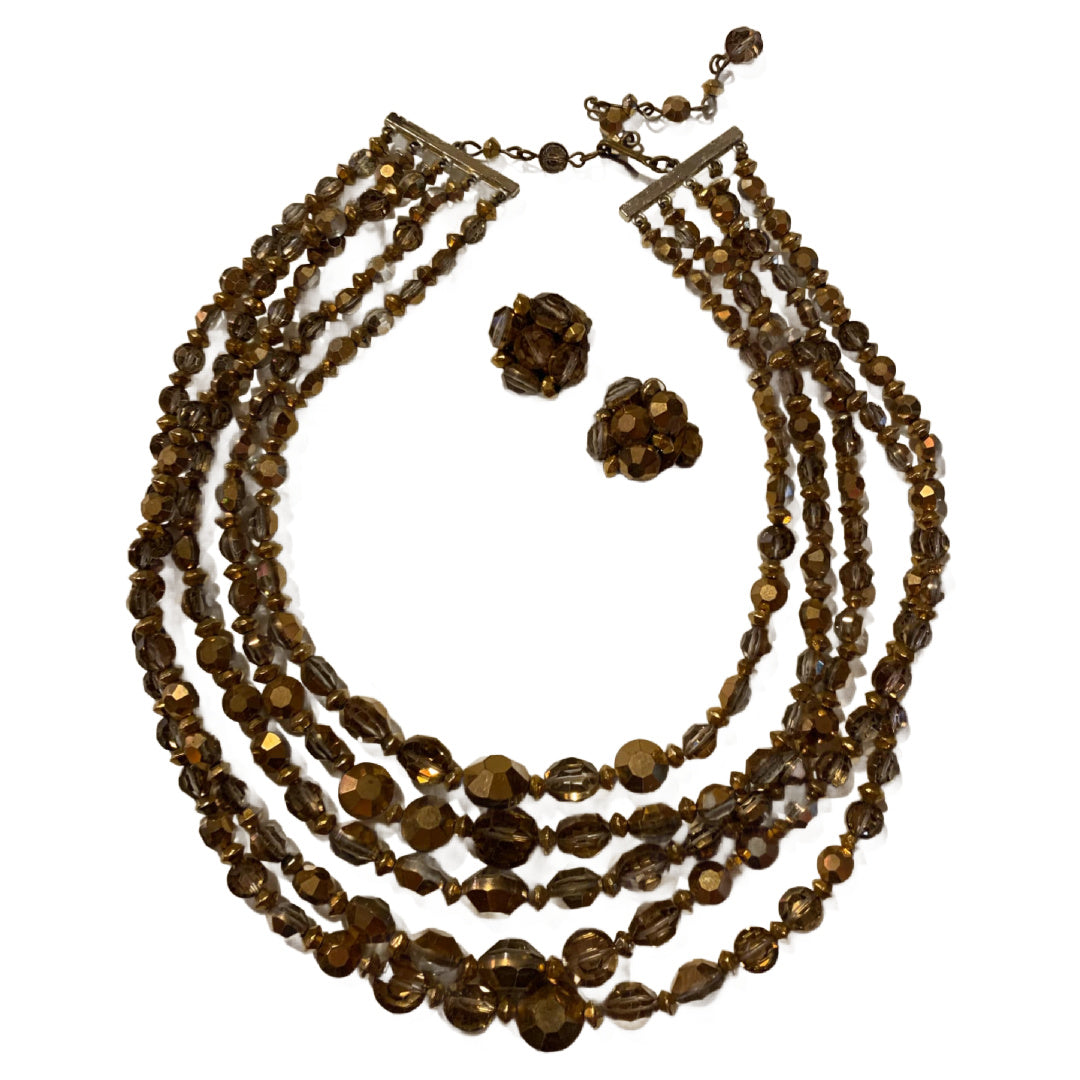 Faceted Heavy Crystal Copper and Bronze Beaded Necklace & Earrings Demi Parure Set circa 1960s