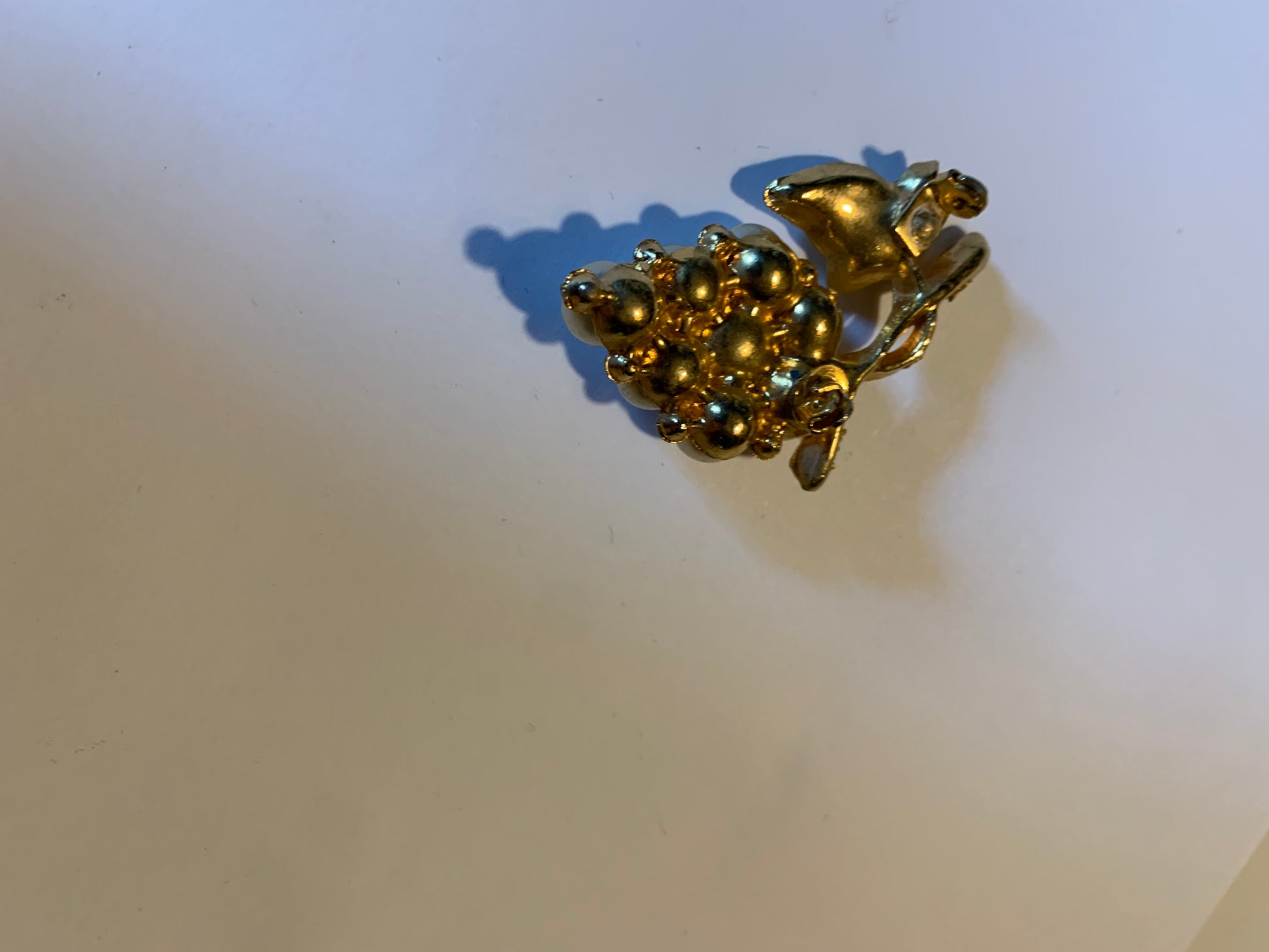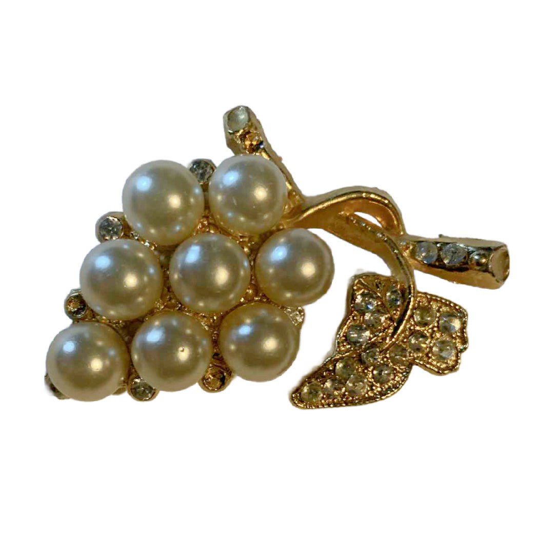 Gold tone metal faux pearl and rhinestone grape cluster statement brooch. Missing pin back- could add one or wear as a pendant. 2 1/4"