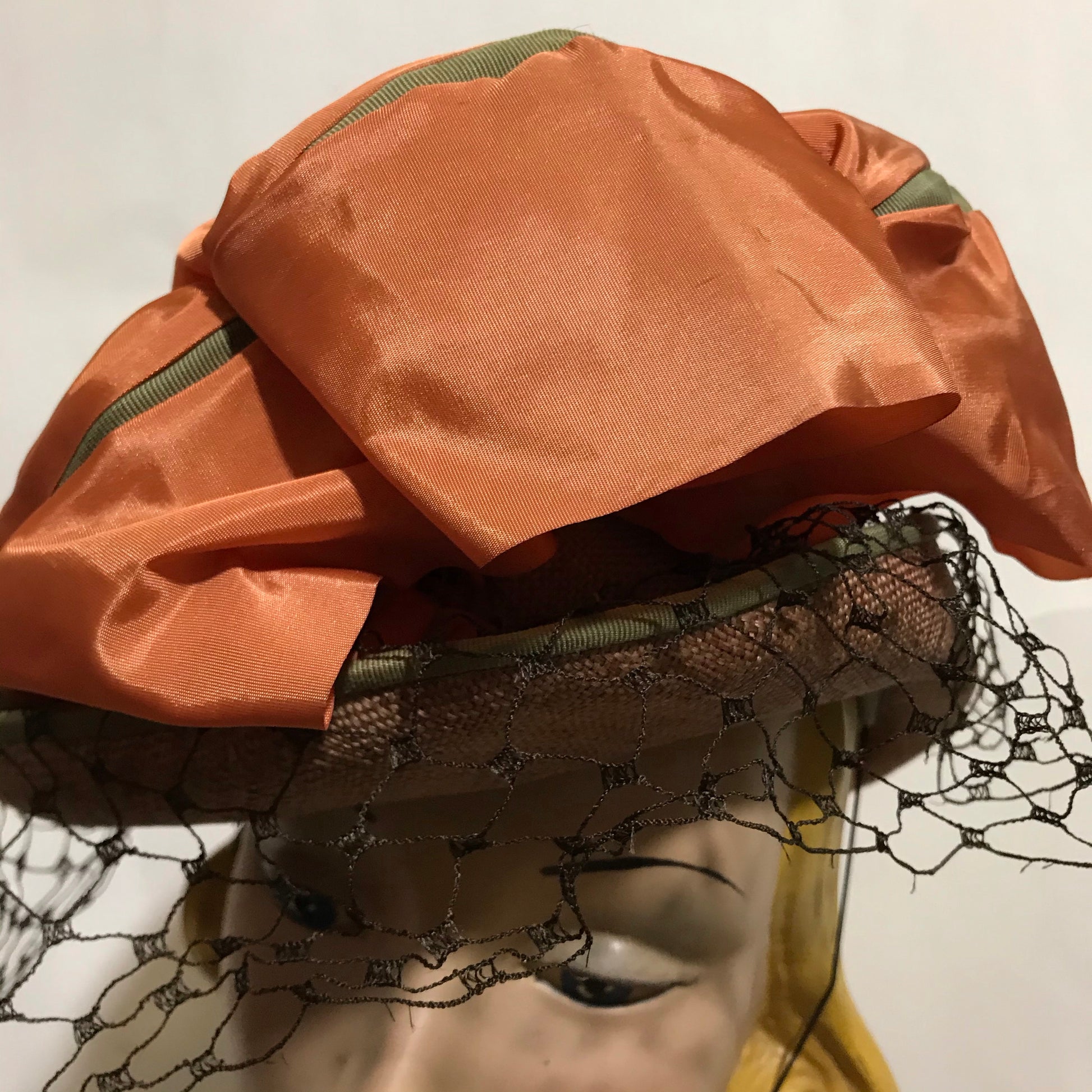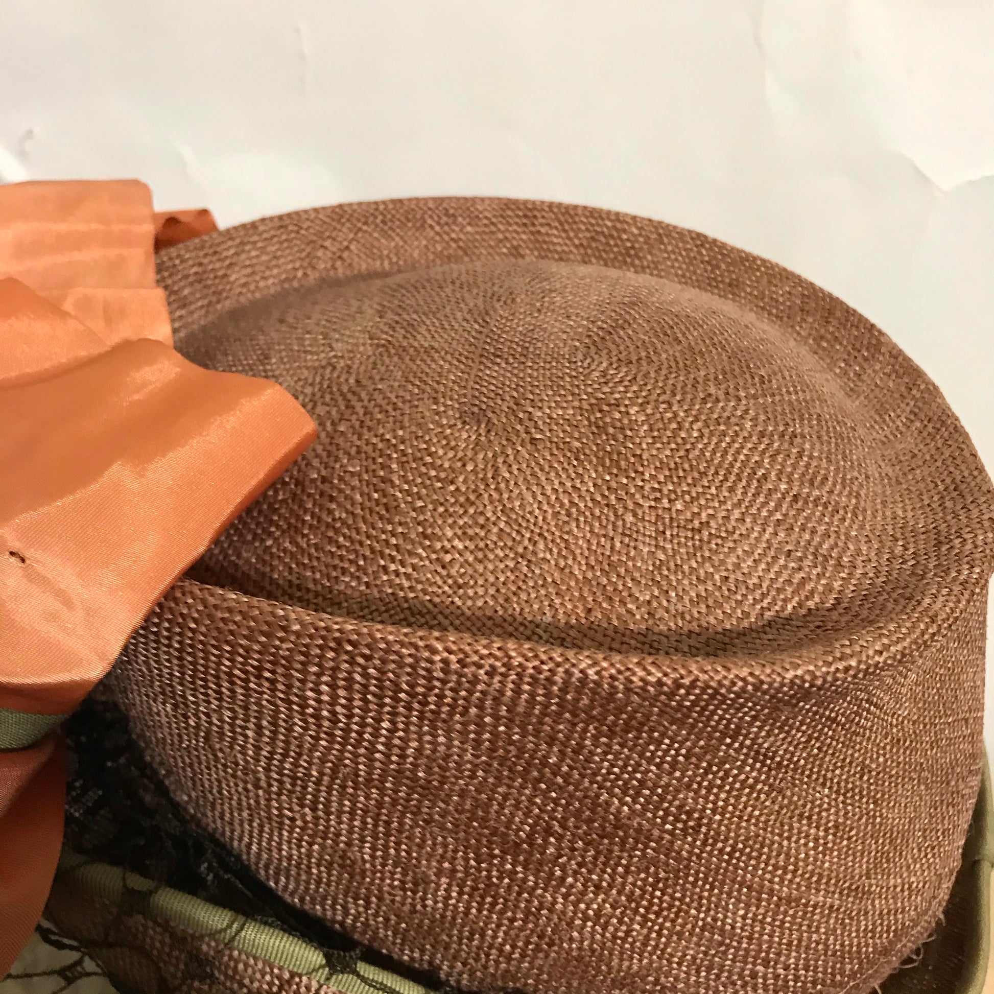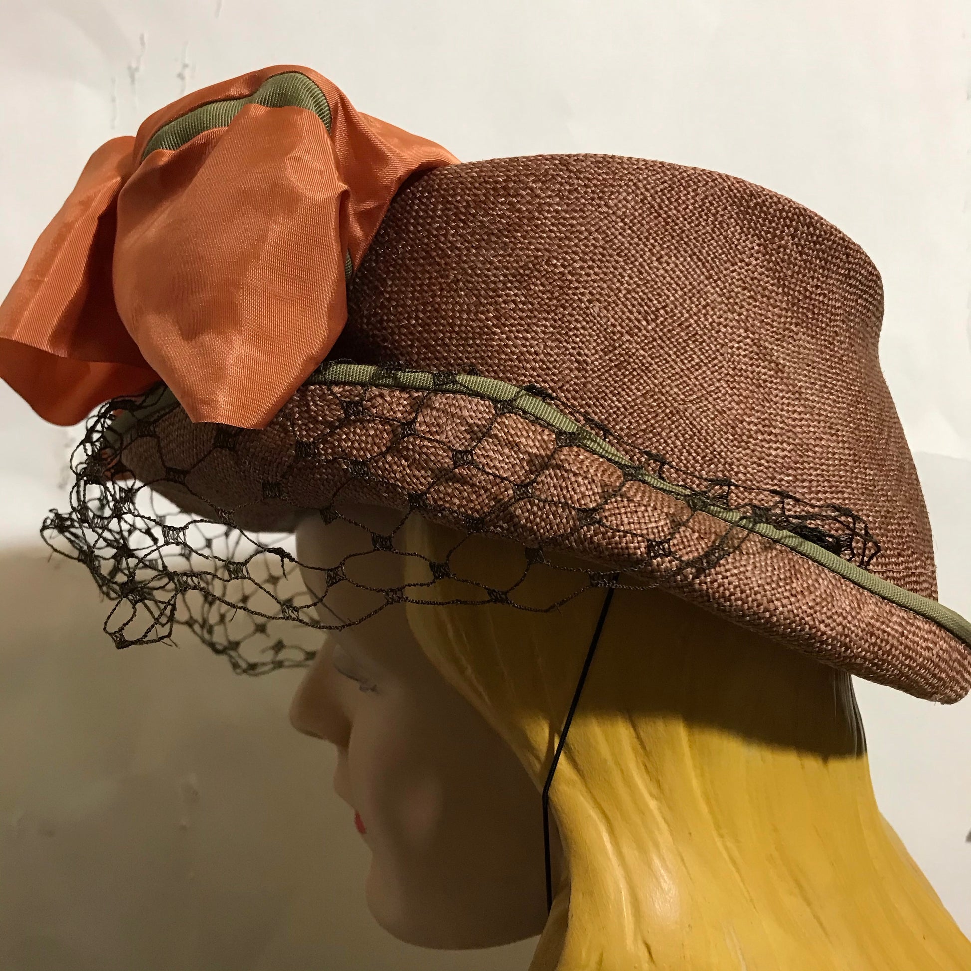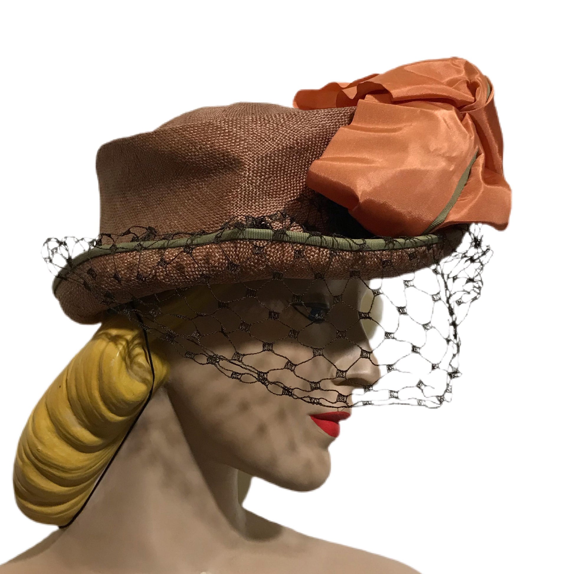 Fawn Sisal Veiled Tilt Hat with Tangerine Bow circa 1940s