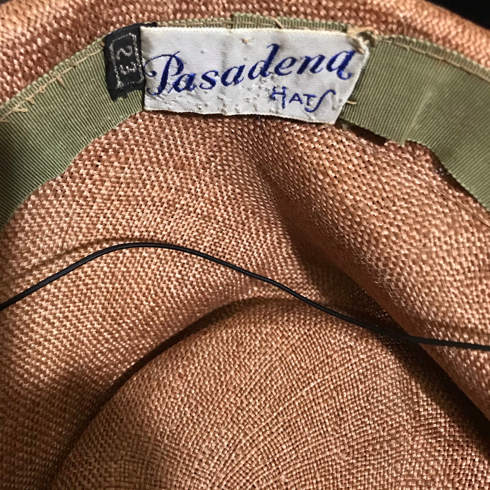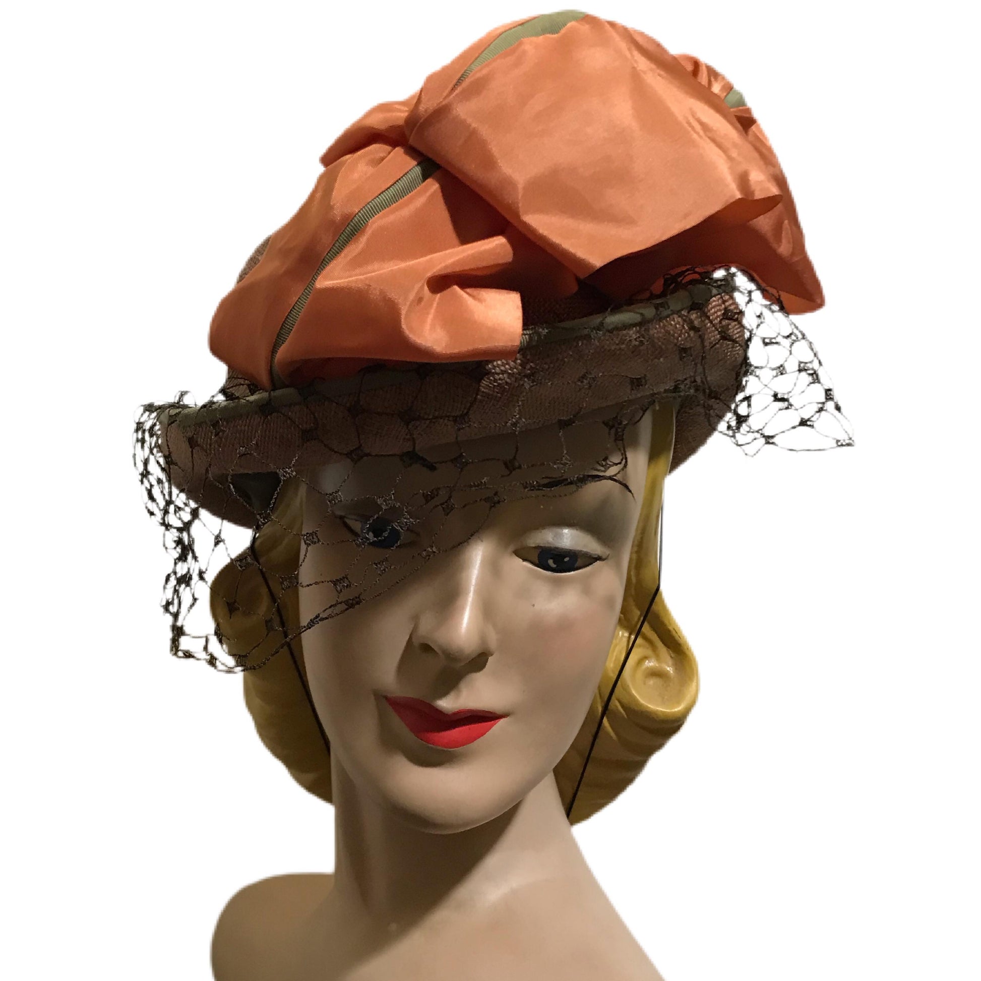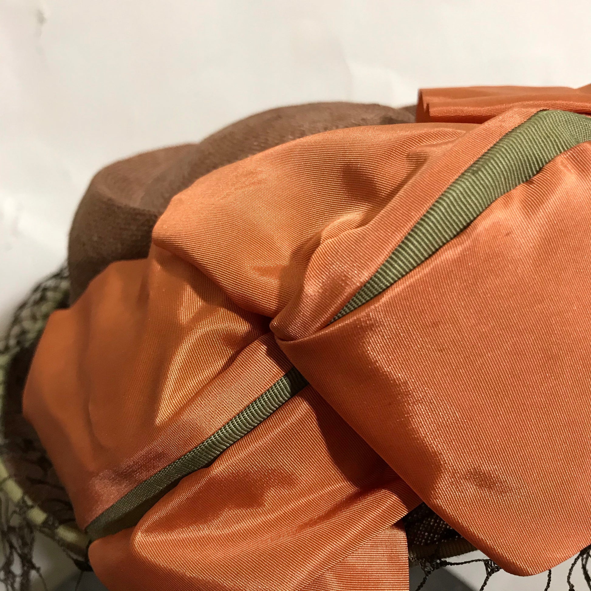 Smashing fawn colored sisal 1940s tilt hat with green edged brim, tangerine oversized front bow with green edges. Veil on front, elastic band in back to secure beneath hair. No flaws. By Pasadena Hats, size 23.