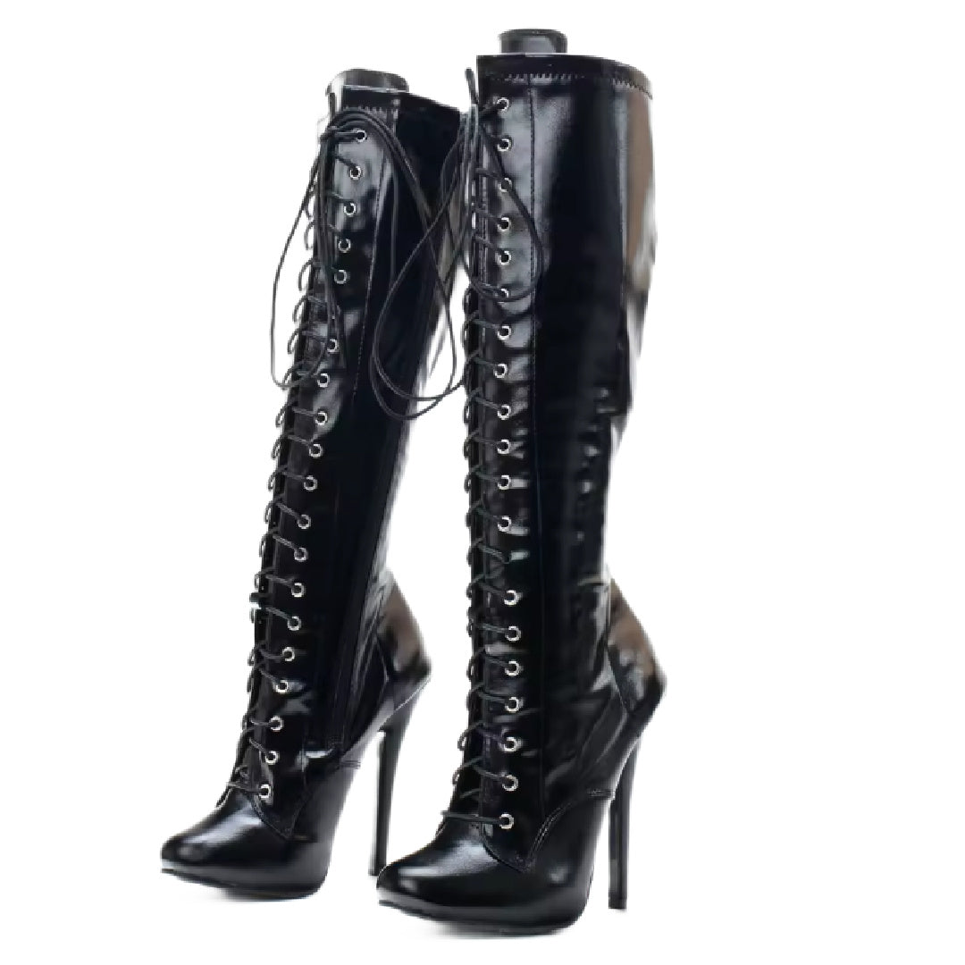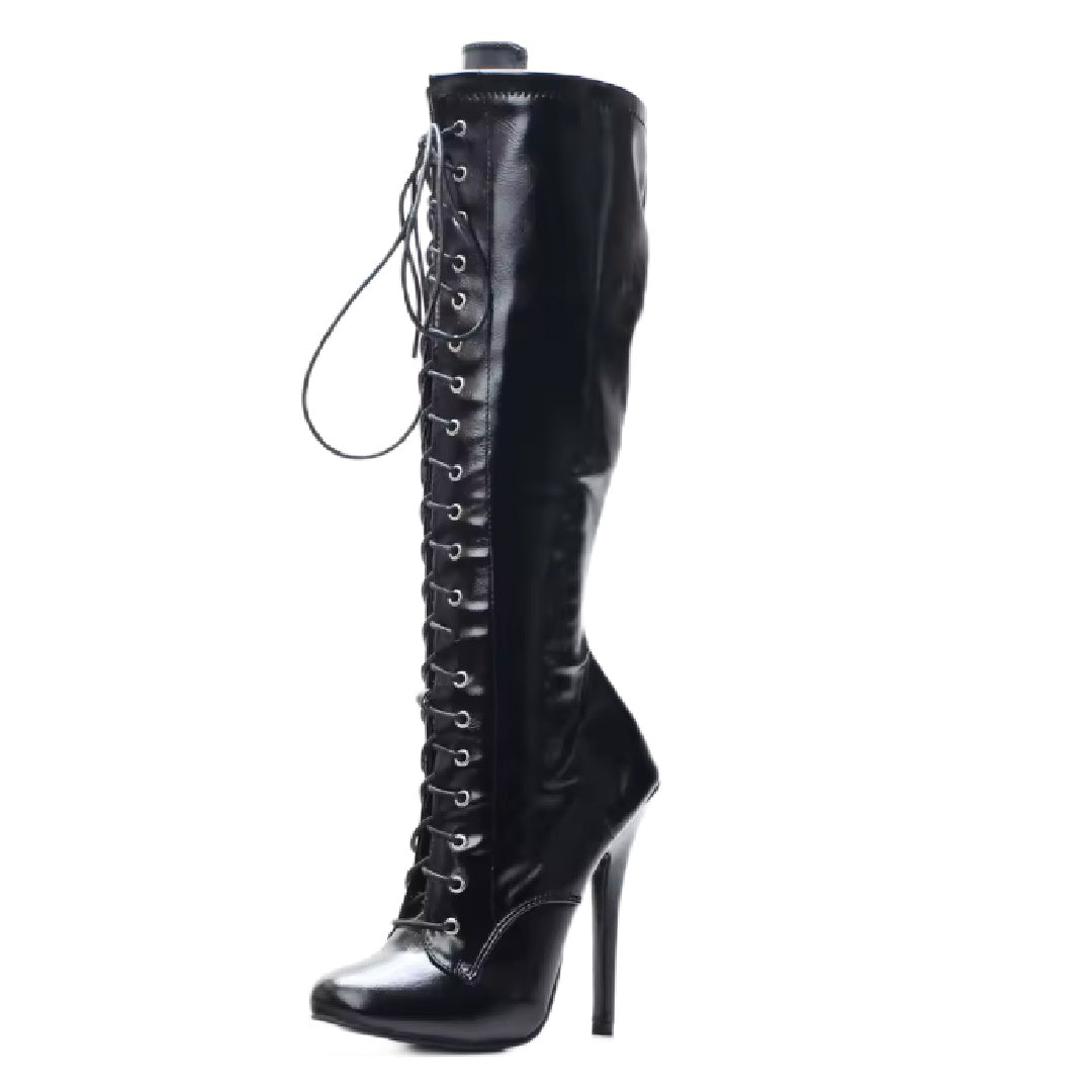 Faux leather tall lace up boots with 5" heels. Modern, 2-3 week delivery.