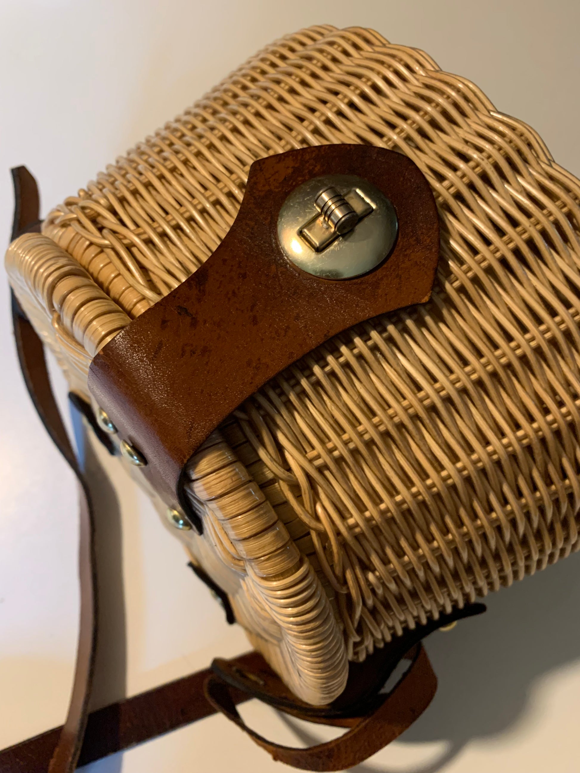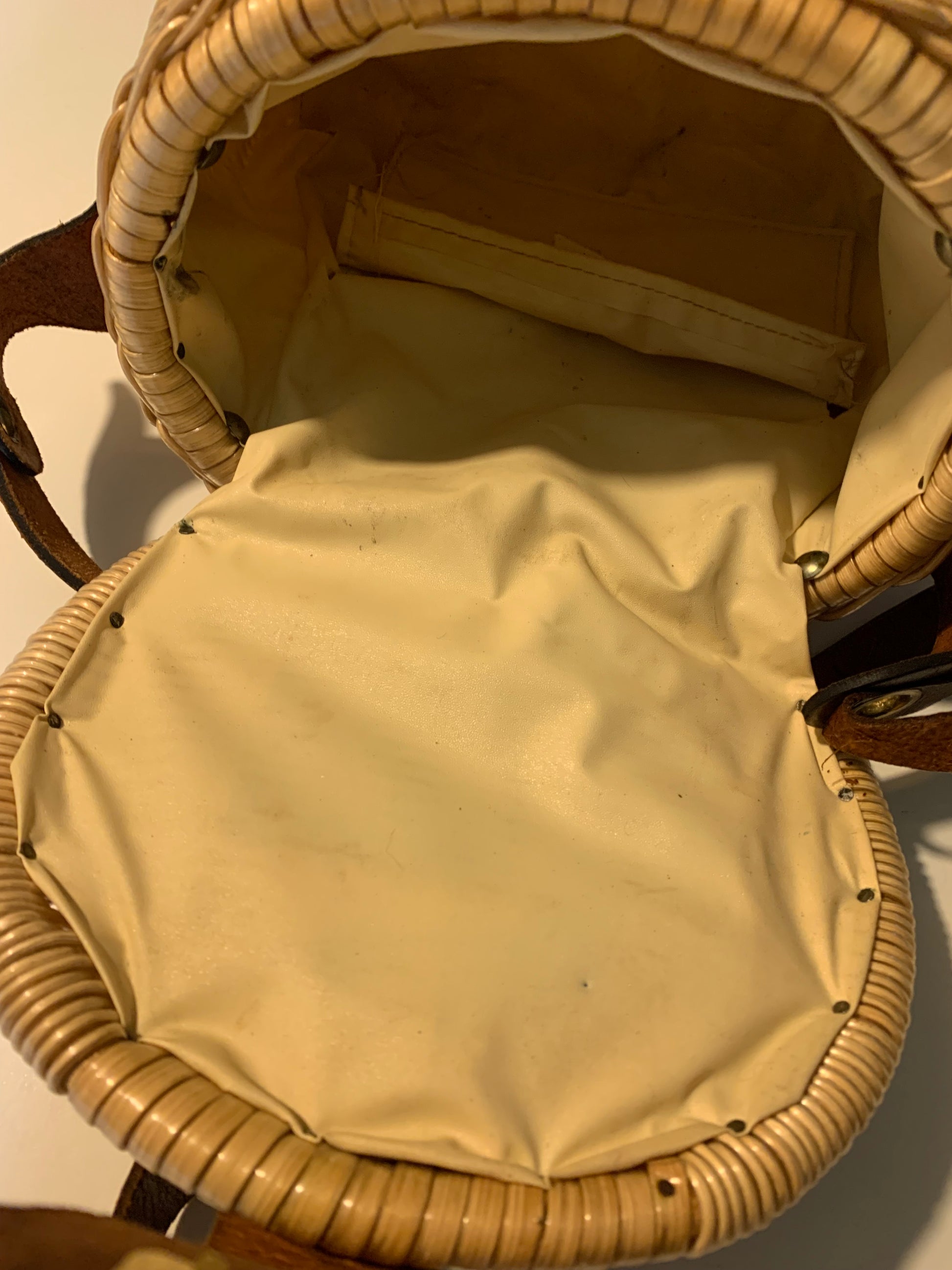 1960s tan wicker fisherman's style handbag, lined in vinyl. No label, no flaws.
