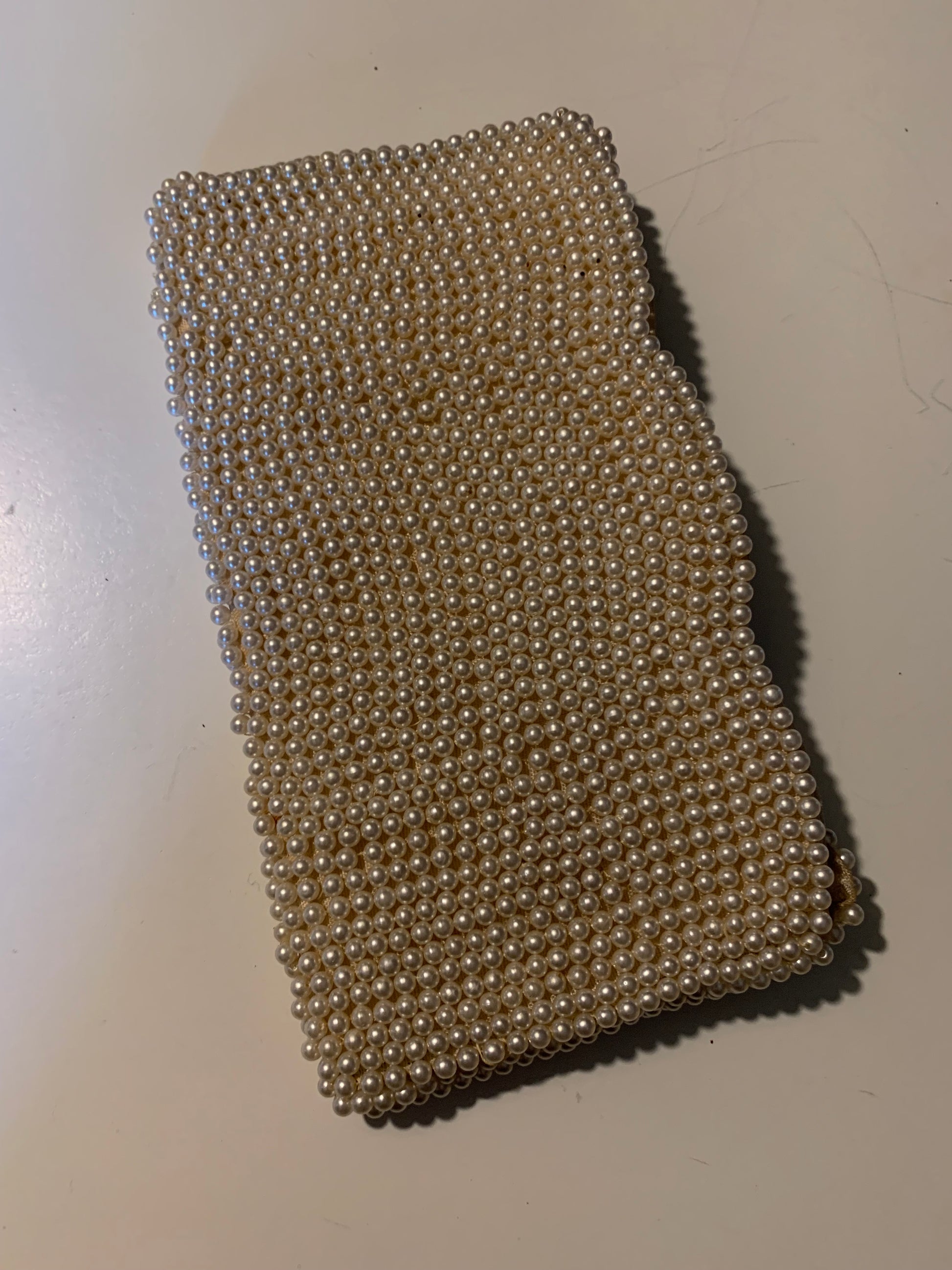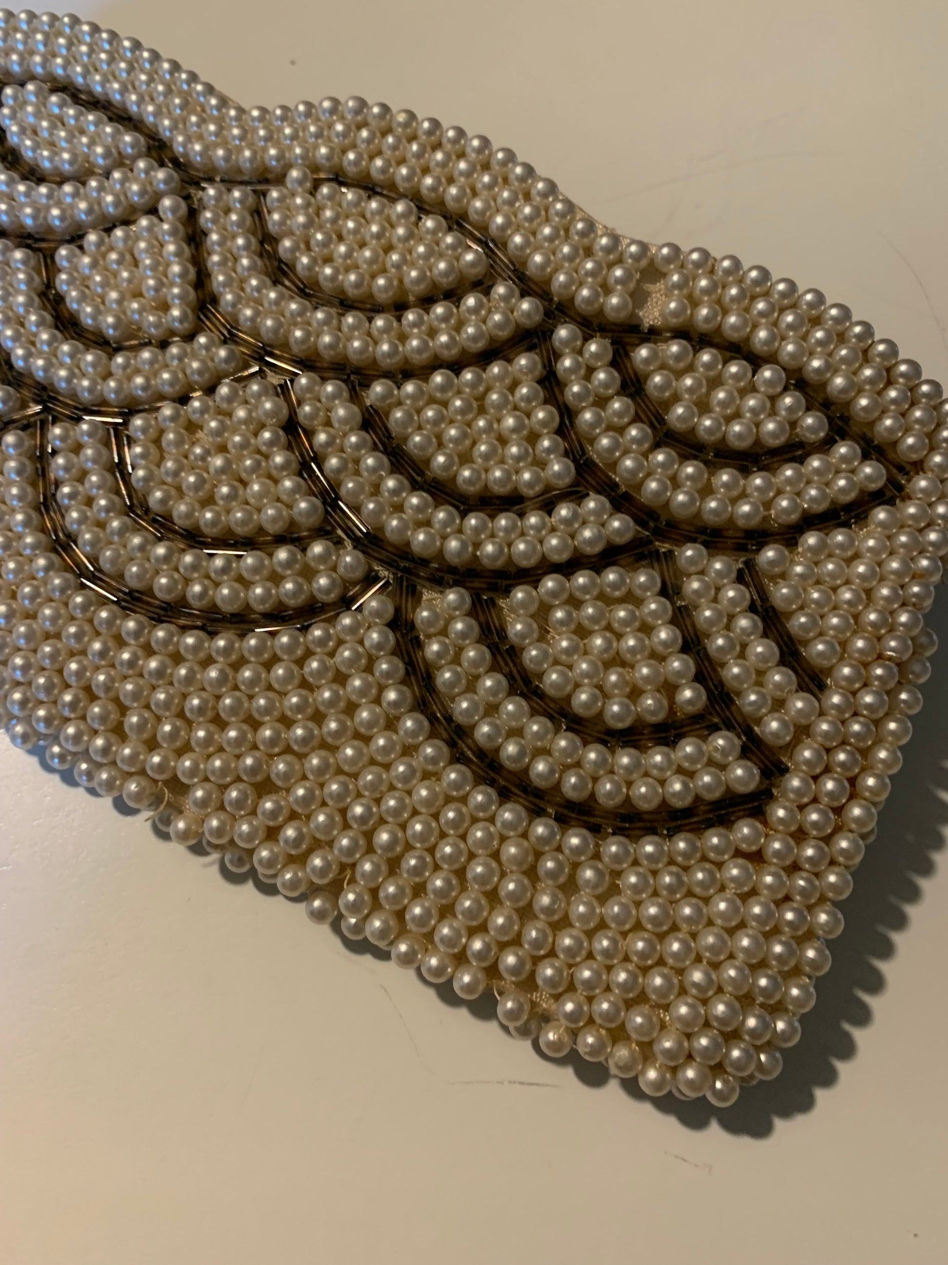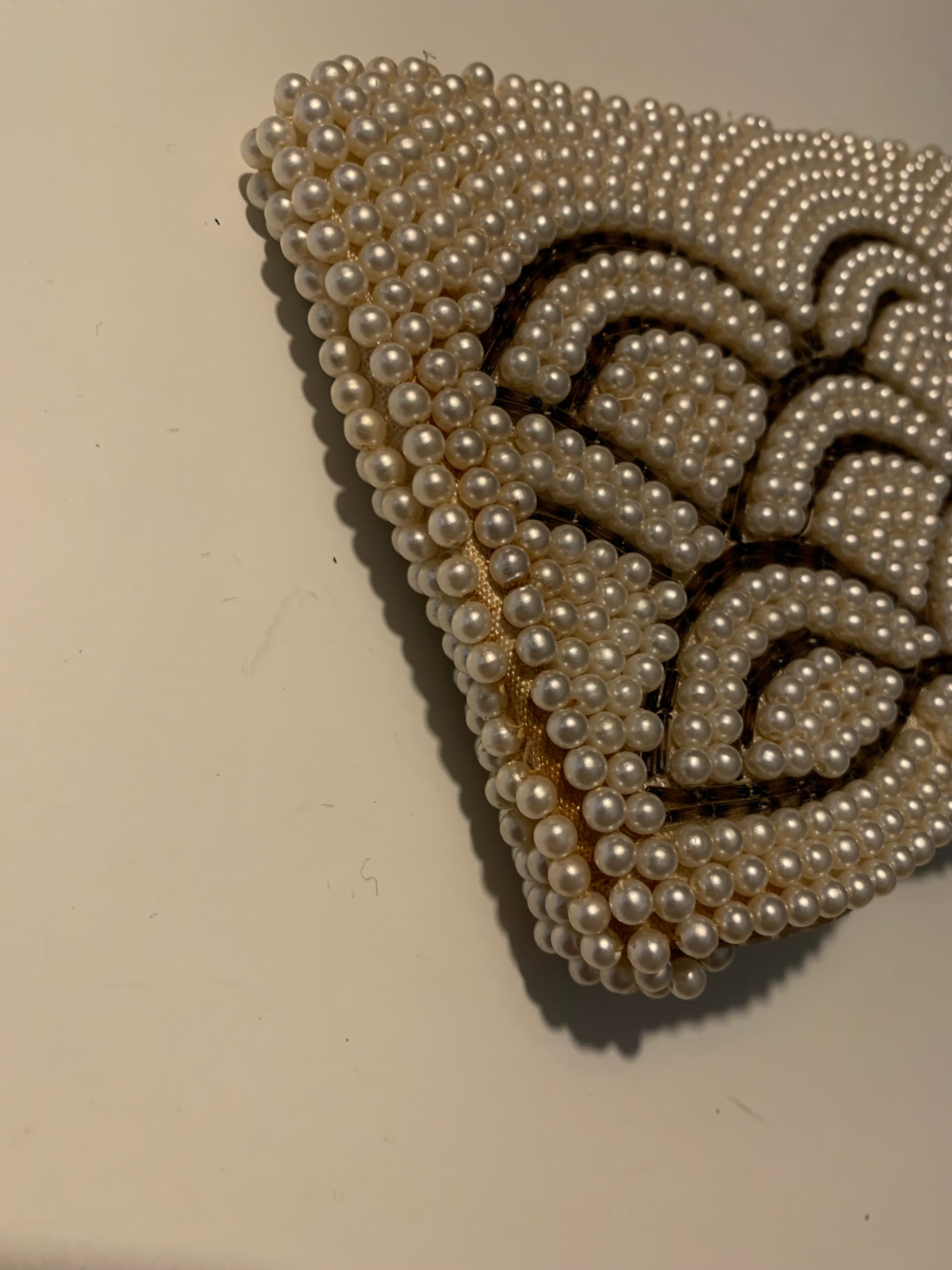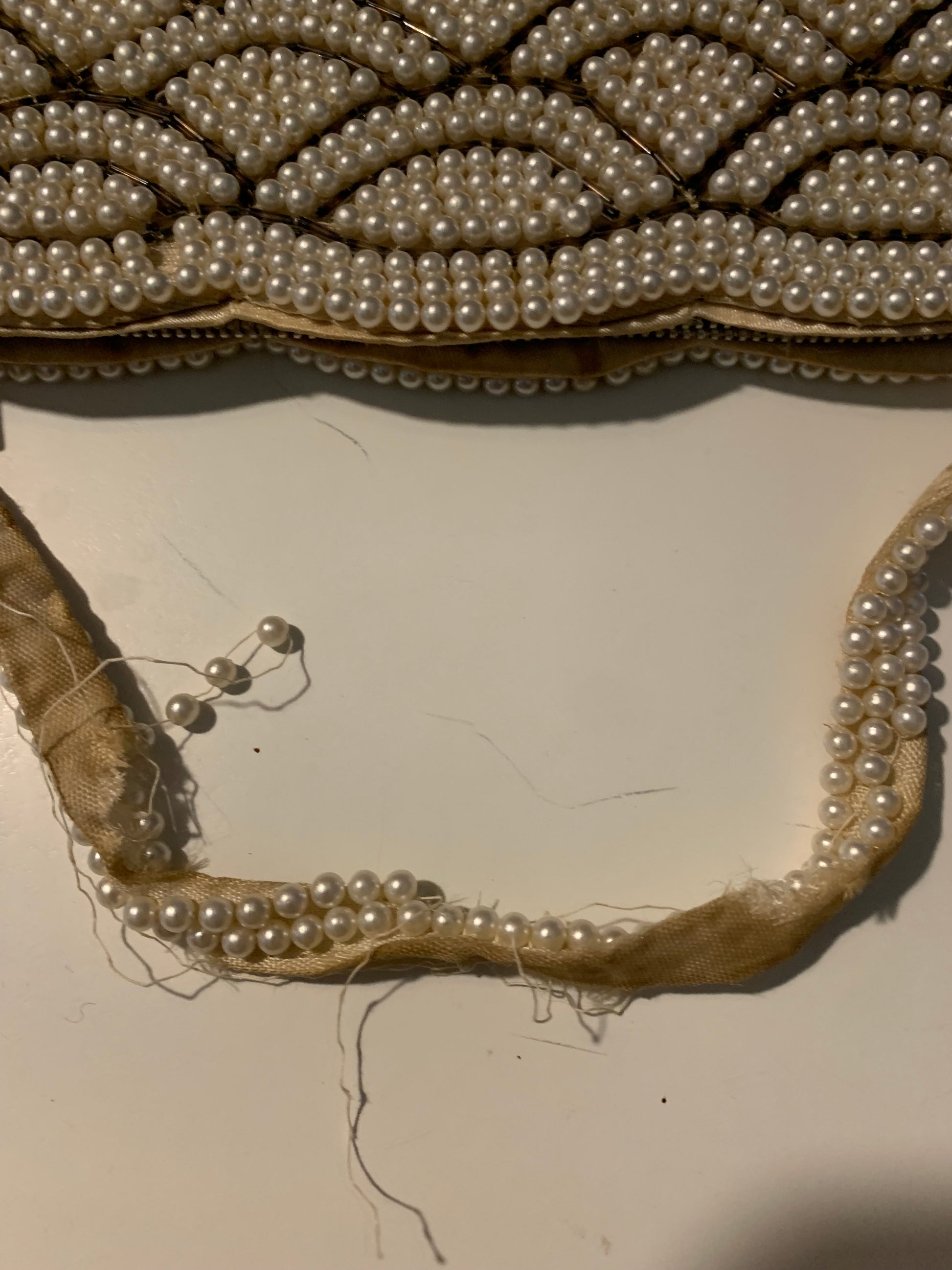 1960s faux pearl and silver beaded evening bag. Zip top, small handle- the handle has bead loss, could be removed. As is.