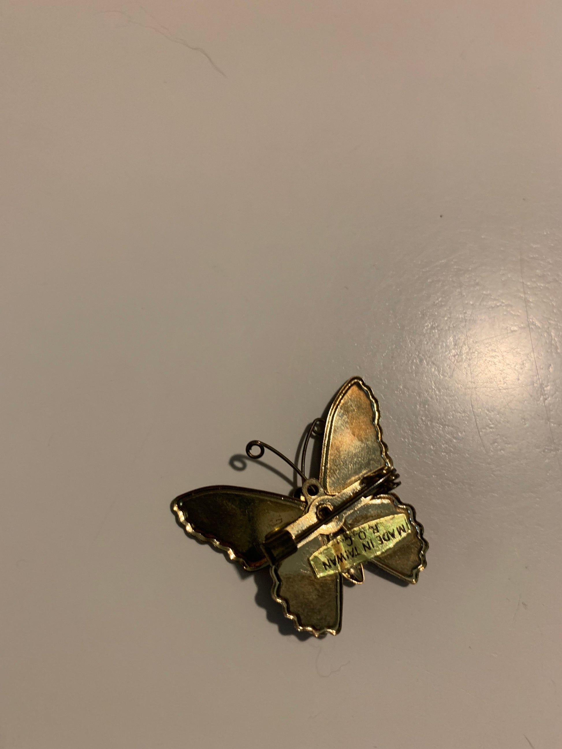 Orange glittery enameled metal butterfly brooch. 1 1/4". No markings, no flaws. Made in Taiwan.