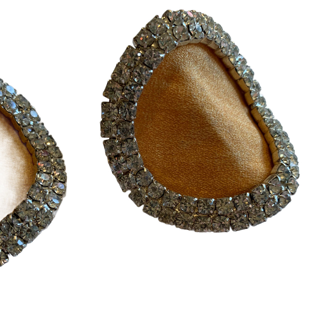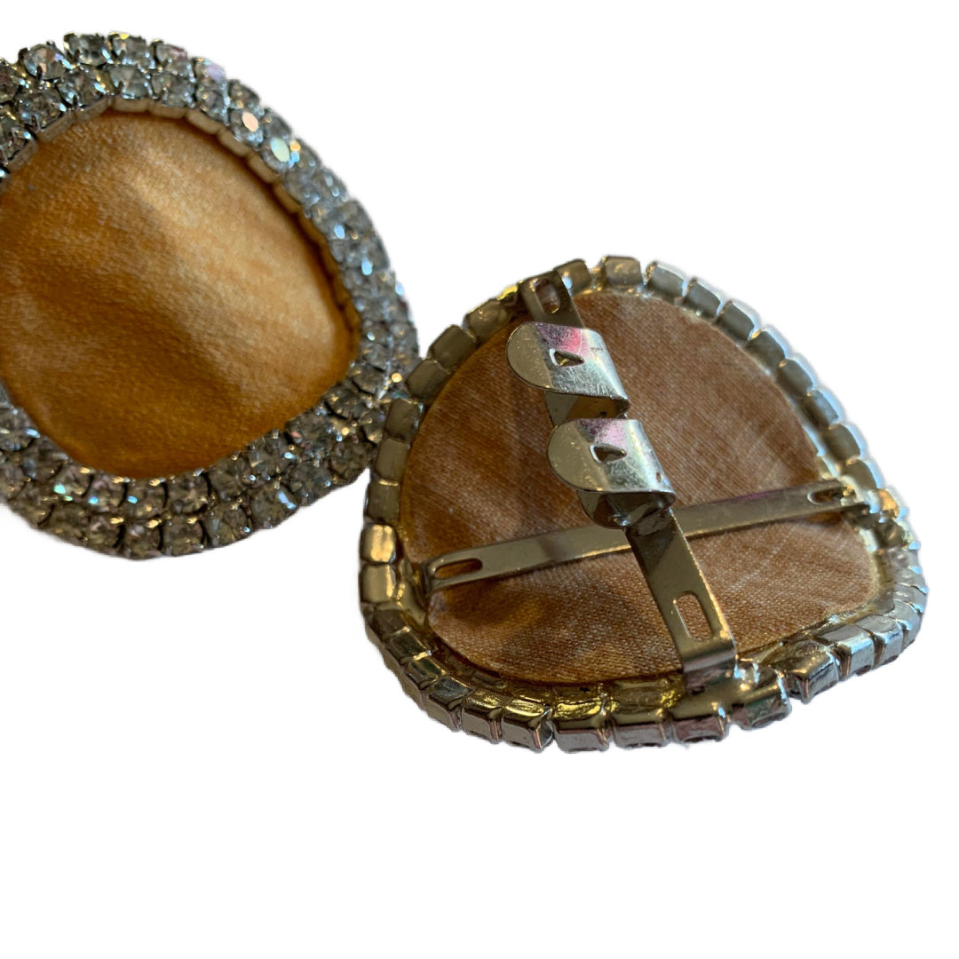 Pair 1960s golden stiffened fabric and shimmering clear rhinestone shoe accents to be hooked/sewn onto top of shoes. 2 1/2"- BIG and GLAM! No markings, no flaws.
