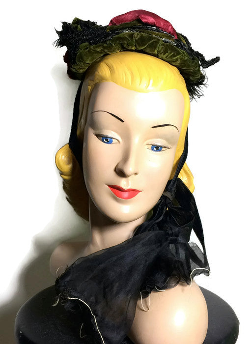 Green Velvet and Silk Beaded & Floral Topped Bonnet circa Late 1800s