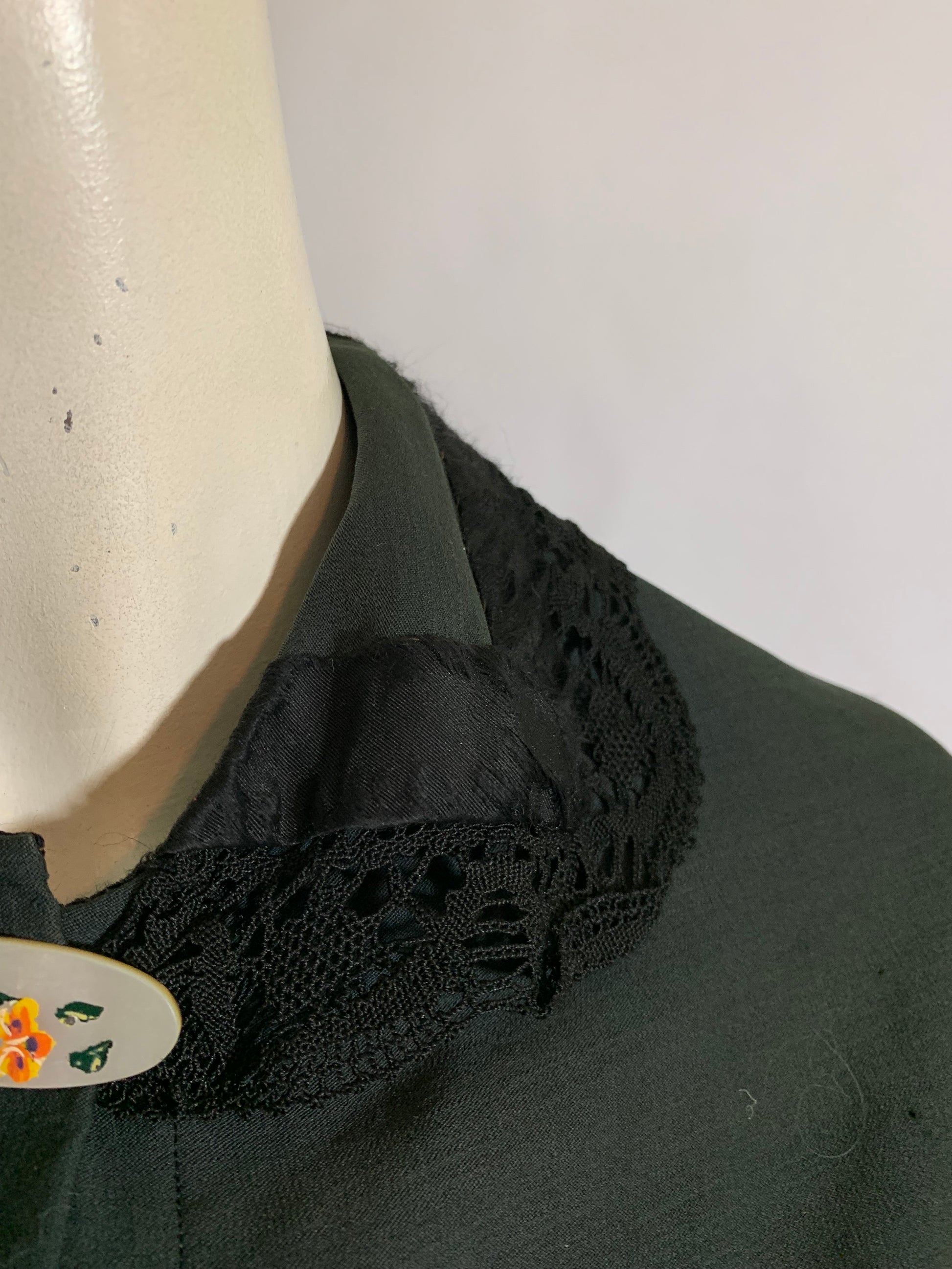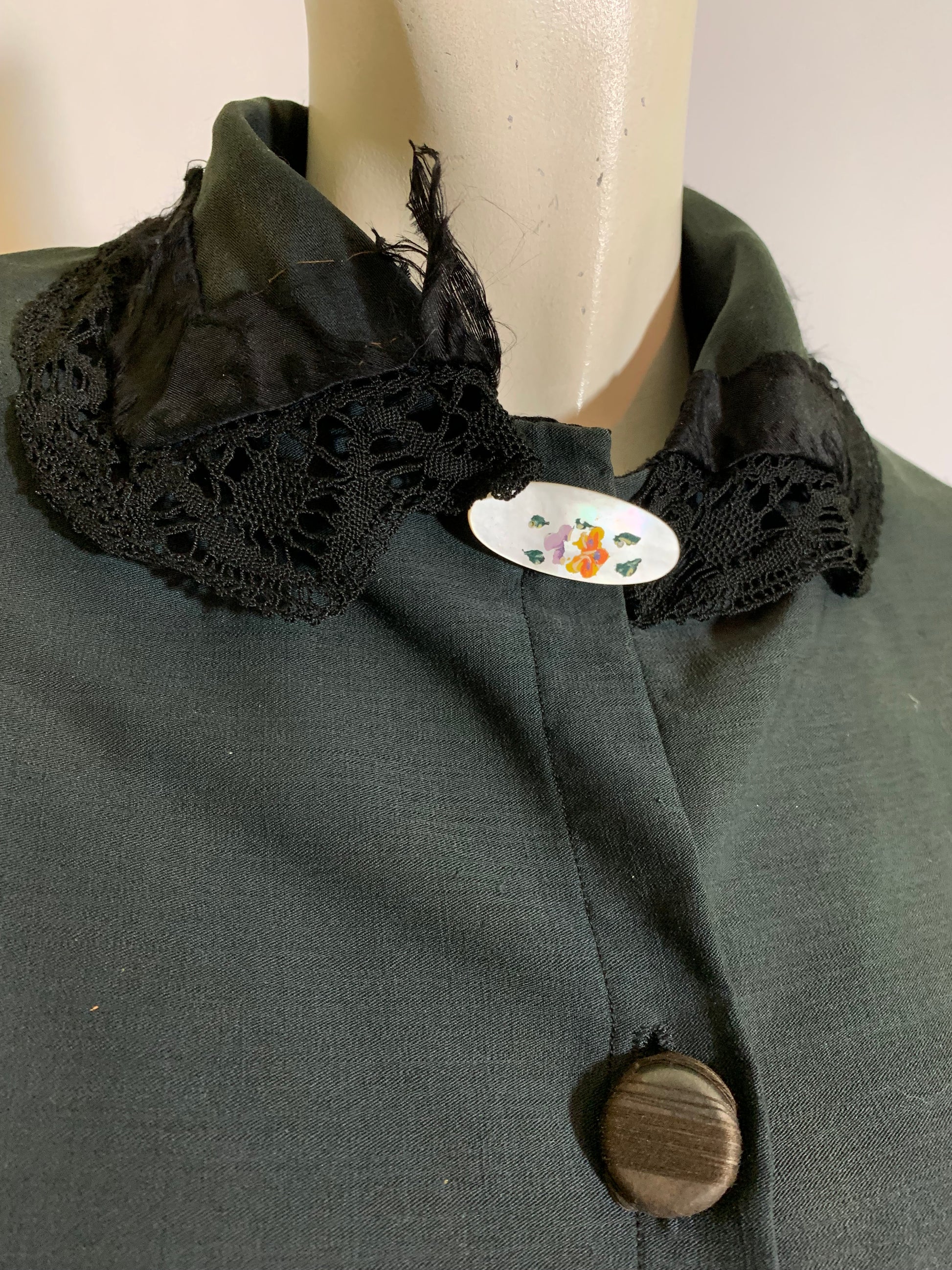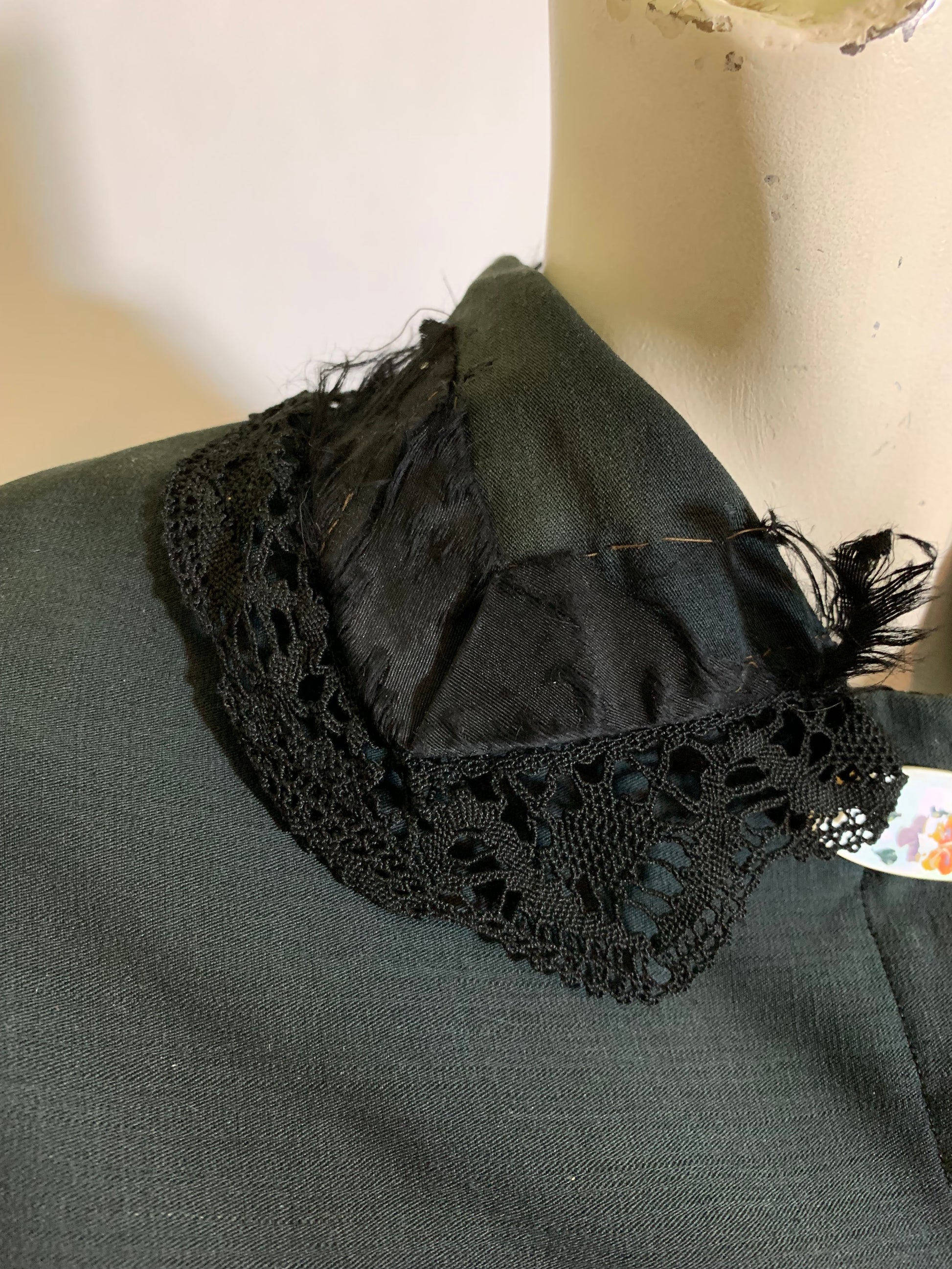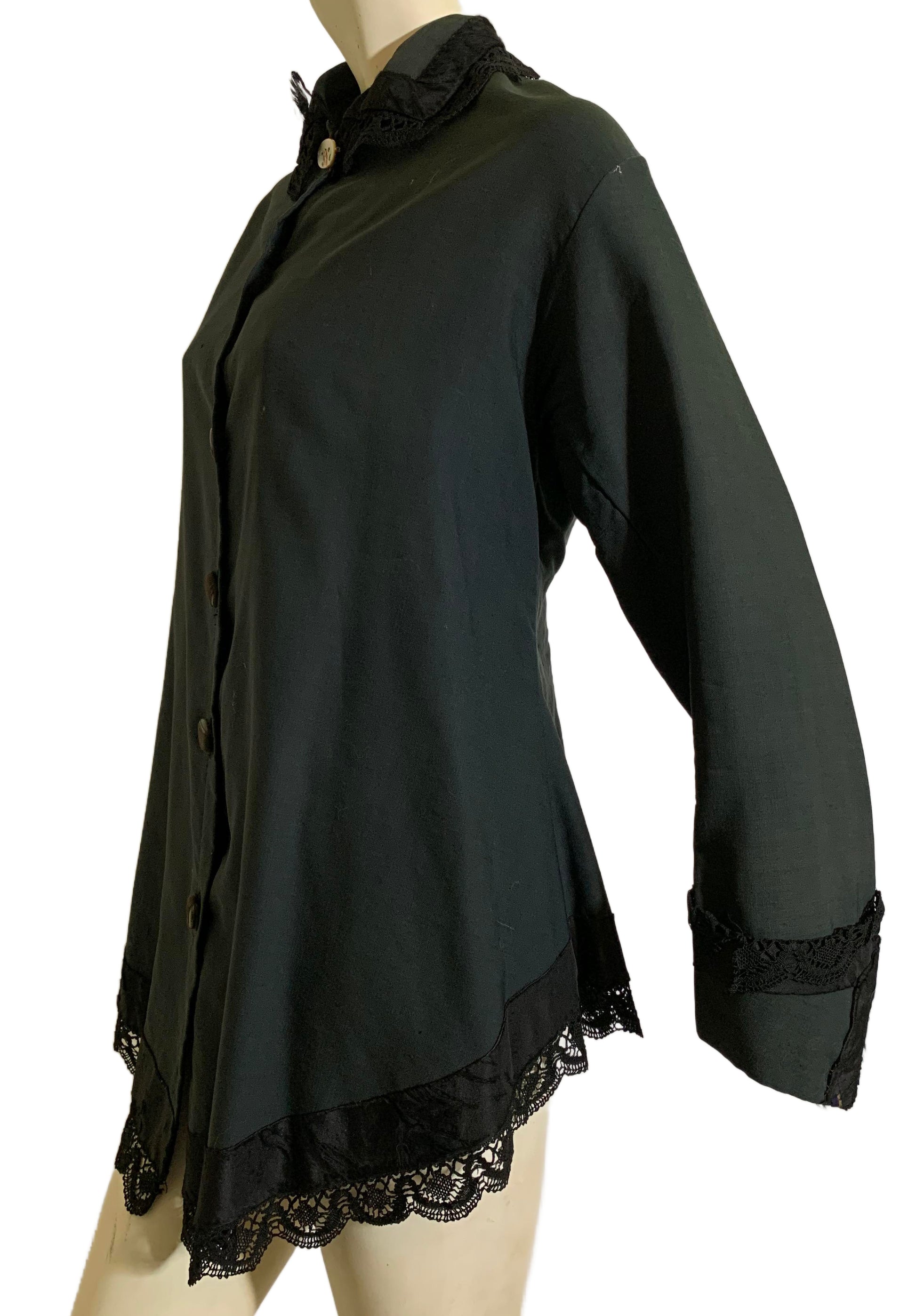 Light black (faded to grey?) cotton long riding jacket from the turn of the century. Lace trimmed, cut to allow for bustle. Some wear to collar, a few holes. As is. Unlined, hand made. Jewelry not included.